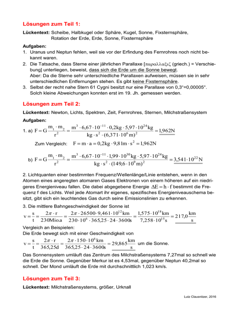 Lösungen zum Teil 1: Lückentext: Scheibe, Halbkugel oder Sphäre, Kugel, Sonne, Fixsternsphäre, Rotation der Erde, Erde, Sonne, Fixsternsphäre Aufgaben: 1. Uranus und Neptun fehlen, weil sie vor der Erfindung des Fernrohres noch nicht bekannt waren. 2. Die Tatsache, dass Sterne einer jährlichen Parallaxe [ (griech.) = Verschiebung] unterliegen, beweist, dass sich die Erde um die Sonne bewegt. Aber: Da die Sterne sehr unterschiedliche Parallaxen aufweisen, müssen sie in sehr unterschiedlichen Entfernungen stehen. Es gibt keine Fixsternsphäre. 3. Selbst der recht nahe Stern 61 Cygni besitzt nur eine Parallaxe von 0,3“=0,00005°. Solch kleine Abweichungen konnten erst im 19. Jh. gemessen werden. Lösungen zum Teil 2: Lückentext: Newton, Lichts, Spektren, Zeit, Fernrohres, Sternen, Milchstraßensystem Aufgaben: 1. a) F G m1 m 2 r2 m 3 6,67 1011 0,2kg 5,97 1024 kg 1,962N kg s 2 (6,371 106 m) 2 Zum Vergleich: b) F G m1 m 2 r2 F m a 0,2kg 9,81m s 2 1,962N m 3 6,67 1011 1,99 1030 kg 5,97 1024 kg 3,541 1022 N 2 9 2 kg s (149,6 10 m) 2. Lichtquanten einer bestimmten Frequenz/Wellenlänge/Linie entstehen, wenn in den Atomen eines angeregten atomaren Gases Elektronen von einem höheren auf ein niedrigeres Energieniveau fallen. Die dabei abgegebene Energie E h f bestimmt die Frequenz f des Lichts. Weil jede Atomart ihr eigenes, spezifisches Energieniveauschema besitzt, gibt sich ein leuchtendes Gas durch seine Emissionslinien zu erkennen. 3. Die mittlere Bahngeschwindigkeit der Sonne ist s 2 r 2 26500 9,461 1012 km 1,575 1018 km km v 217,0 6 15 t 230Mio.a 230 10 365,25 24 3600s s 7,258 10 s Vergleich an Beispielen: Die Erde bewegt sich mit einer Geschwindigkeit von s 2 r 2 150 106 km km um die Sonne. v 29,865 t 365,25d 365,25 24 3600s s Das Sonnensystem umläuft das Zentrum des Milchstraßensystems 7,27mal so schnell wie die Erde die Sonne. Gegenüber Merkur ist es 4,53mal, gegenüber Neptun 40,2mal so schnell. Der Mond umläuft die Erde mit durchschnittlich 1,023 km/s. Lösungen zum Teil 3: Lückentext: Milchstraßensystems, größer, Urknall Lutz Clausnitzer, 2016