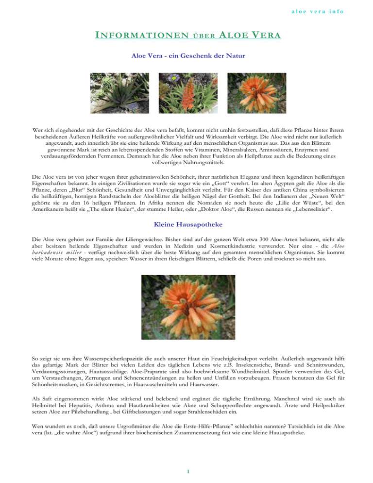aloe vera info I NFORMATIONEN ÜBER A LOE V ERA Aloe Vera - ein Geschenk der Natur Wer sich eingehender mit der Geschichte der Aloe vera befaßt, kommt nicht umhin festzustellen, daß diese Pflanze hinter ihrem bescheidenen Äußeren Heilkräfte von außergewöhnlicher Vielfalt und Wirksamkeit verbirgt. Die Aloe wird nicht nur äußerlich angewandt, auch innerlich übt sie eine heilende Wirkung auf den menschlichen Organismus aus. Das aus den Blättern gewonnene Mark ist reich an lebensspendenden Stoffen wie Vitaminen, Mineralsalzen, Aminosäuren, Enzymen und verdauungsfördernden Fermenten. Demnach hat die Aloe neben ihrer Funktion als Heilpflanze auch die Bedeutung eines vollwertigen Nahrungsmittels. Die Aloe vera ist von jeher wegen ihrer geheimnisvollen Schönheit, ihrer natürlichen Eleganz und ihren legendären heilkräftigen Eigenschaften bekannt. In einigen Zivilisationen wurde sie sogar wie ein „Gott“ verehrt. Im alten Ägypten galt die Aloe als die Pflanze, deren „Blut“ Schönheit, Gesundheit und Unvergänglichkeit verleiht. Für den Kaiser des antiken China symbolisierten die heilkräftigen, hornigen Randstacheln der Aloeblätter die heiligen Nägel der Gottheit. Bei den Indianern der „Neuen Welt“ gehörte sie zu den 16 heiligen Pflanzen. In Afrika nennen die Nomaden sie noch heute die „Lilie der Wüste“, bei den Amerikanern heißt sie „The silent Healer“, der stumme Heiler, oder „Doktor Aloe“, die Russen nennen sie „Lebenselixier“. Kleine Hausapotheke Die Aloe vera gehört zur Familie der Liliengewächse. Bisher sind auf der ganzen Welt etwa 300 Aloe-Arten bekannt, nicht alle aber besitzen heilende Eigenschaften und werden in Medizin und Kosmetikindustrie verwendet. Nur eine - die Al o e b a rb a d e n si s mi l le r - verfügt nachweislich über die beste Wirkung auf den gesamten menschlichen Organismus. Sie kommt viele Monate ohne Regen aus, speichert Wasser in ihren fleischigen Blättern, schließt die Poren und trocknet so nicht aus. So zeigt sie uns ihre Wasserspeicherkapazität die auch unserer Haut ein Feuchtigkeitsdepot verleiht. Äußerlich angewandt hilft das gelartige Mark der Blätter bei vielen Leiden des täglichen Lebens wie z.B. Insektenstiche, Brand- und Schnittwunden, Verdauungsstörungen, Hautausschläge. Aloe-Präparate sind also hochwirksame Wundheilmittel. Sportler verwenden das Gel, um Verstauchungen, Zerrungen und Sehnenentzündungen zu heilen und Unfällen vorzubeugen. Frauen benutzen das Gel für Schönheitsmasken, in Gesichtscremes, in Haarwaschmitteln und Haarwasser. Als Saft eingenommen wirkt Aloe stärkend und belebend und ergänzt die tägliche Ernährung. Manchmal wird sie auch als Heilmittel bei Hepatitis, Asthma und Hautkrankheiten wie Akne und Schuppenflechte angewandt. Ärzte und Heilpraktiker setzen Aloe zur Pilzbehandlung , bei Giftbelastungen und sogar Strahlenschäden ein. Wen wundert es noch, daß unsere Urgroßmütter die Aloe die Erste-Hilfe-Pflanze" schlechthin nannten? Tatsächlich ist die Aloe vera (lat. „die wahre Aloe“) aufgrund ihrer biochemischen Zusammensetzung fast wie eine kleine Hausapotheke. 1 aloe vera info Hauptwirkstoff Acemannan Ihre besonderen Heilwirkungen verdankt die Aloe vera einem hohen Anteil an aktiven Wirkstoffen, in erster Linie dem M uc op oly sa c c h c i rid Ac ema n na n, eine langkettige Zuckerform. Bis zur Pubertät wird Ac ema nn a n im Körper selbst gebildet, danach muß es mit der Nahrung zugeführt werden. Ac ema n na n wird in Zellmembrane des gesamten Körpers eingelagert und bewirkt dort eine Immunstärkung gegen krankmachende Parasiten, Viren und Bakterien. Ac e ma n na n ist die Basis für alle verbindungsschaffenden Zellen, einschließlich der Haut der Gefäßwande, der Sehnen, Gelenke, Knorpel und Bänder sowie für das Grundgerüst der Knochen. Ac em a n n a n sorgt für ausreichend Gelenkschmiere, kann Arthritis vorbeugen oder - wenn sie schon akut ist - lindern, wenn nicht gar kurieren. Durch seine antiviralen, antibakteriellen und antimykotischen Eigenschaften kann Ac ema n na n helfen, Candidaüberwucherungen zu kontrollieren und die natürliche Flora der Verdauungsorgane wieder herzustellen. Dies ist besonders wichtig, denn der Darm ist in seiner Funktion bei fast allen Menschen gestört. Verdauungsstörungen und Pilzerkrankungen lassen viele zu chemischen Mitteln greifen, die aber, anstatt eine Heilung herbeizuführen, eher dazu beitragen, daß die in Darmnischen überlebenden Pilze oftmals zu noch aggressiveren Mykoseformen mutieren. Eine ganzheitliche Mykosebehandlung benötigt Zeit und eigene Bemühungen. Hilfe bringen in diesem Fall neben dem Aloe-vera-Saft eine zucker- und kohlehydratarme Pilz-Diät mit hohem Frischkostanteil. Außerdem stimuliert Ac em a n n a n die Beweglichkeit der Verdauungsorgane und hilft allergieauslösendes Fremdprotein in den Dickdarm abzuführen. Ac e ma n na n hat darüber hinaus eine direkte Auswirkung auf das Immunsystem, aktiviert und stimuliert Makrophagen, Monozyten, Antikörper und T-Helferzellen, die allesamt für die Abwehr von Fremdkörpern zuständig sind. Laborversuche zeigten, daß Ac e ma n na n als Brücke fungiert zwischen Fremdprotein und Makrophagen (Freistellen), wodurch die Aufnahme der Fremdproteine durch die Freßzellen wesentlich erleichtert wird. Diese Brückenfunktion gilt als Schlüsselkomponente bei der Immunstärkung des Zellkerns, denn z.B. bei HIV-Infektionen sind kaum Abwehrkräfte im Zellinneren vorhanden. An Aidskranken vorgenommene klinische Versuche zeigten, daß die Behandlung mit Aloe-vera-Saft positive Folgen für die Patienten hatte: Das Fieber sank, nächtliche Schweißausbrüche konnten gestoppt werden, Infektionen klangen ab, die Kurzatmigkeit ging zurück, Durchfall hörte auf, sogar die Lymphknoten verkleinerten sich. Im Gegensatz zu anderen Methoden wurden bei dieser Behandlung keinerlei negative Begleiterscheinungen festgestellt. Ac e ma n na n schützt auch das Knochenmark v
