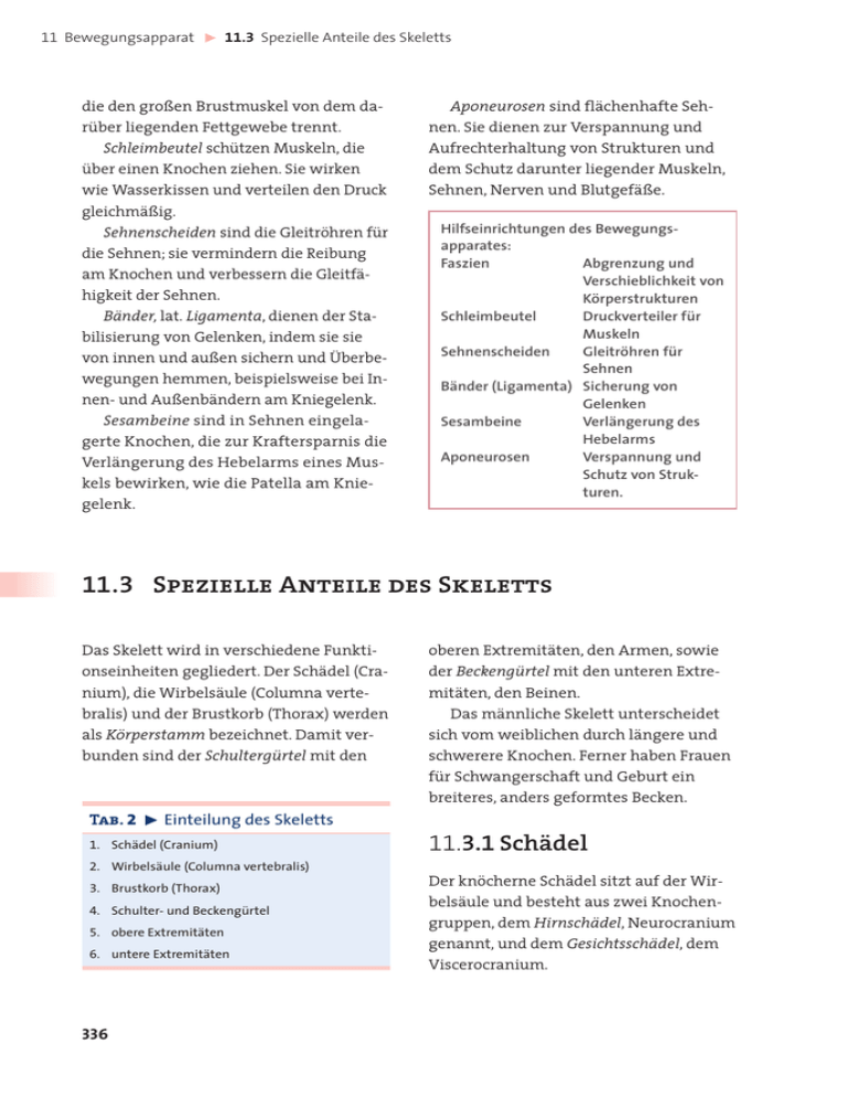 11 Bewegungsapparat ˘ 11.3 Spezielle Anteile des Skeletts die den großen Brustmuskel von dem darüber liegenden Fettgewebe trennt. Schleimbeutel schützen Muskeln, die über einen Knochen ziehen. Sie wirken wie Wasserkissen und verteilen den Druck gleichmäßig. Sehnenscheiden sind die Gleitröhren für die Sehnen; sie vermindern die Reibung am Knochen und verbessern die Gleitfähigkeit der Sehnen. Bänder, lat. Ligamenta, dienen der Stabilisierung von Gelenken, indem sie sie von innen und außen sichern und Überbewegungen hemmen, beispielsweise bei Innen- und Außenbändern am Kniegelenk. Sesambeine sind in Sehnen eingelagerte Knochen, die zur Kraftersparnis die Verlängerung des Hebelarms eines Muskels bewirken, wie die Patella am Kniegelenk. Aponeurosen sind flächenhafte Sehnen. Sie dienen zur Verspannung und Aufrechterhaltung von Strukturen und dem Schutz darunter liegender Muskeln, Sehnen, Nerven und Blutgefäße. Hilfseinrichtungen des Bewegungsapparates: Faszien Abgrenzung und Verschieblichkeit von Körperstrukturen Schleimbeutel Druckverteiler für Muskeln Sehnenscheiden Gleitröhren für Sehnen Bänder (Ligamenta) Sicherung von Gelenken Sesambeine Verlängerung des Hebelarms Aponeurosen Verspannung und Schutz von Strukturen. 11.3 Spezielle Anteile des Skeletts Das Skelett wird in verschiedene Funktionseinheiten gegliedert. Der Schädel (Cranium), die Wirbelsäule (Columna vertebralis) und der Brustkorb (Thorax) werden als Körperstamm bezeichnet. Damit verbunden sind der Schultergürtel mit den Tab. 2 ˘ Einteilung des Skeletts 1. Schädel (Cranium) 2. Wirbelsäule (Columna vertebralis) 3. Brustkorb (Thorax) 4. Schulter- und Beckengürtel 5. obere Extremitäten 6. untere Extremitäten 336 oberen Extremitäten, den Armen, sowie der Beckengürtel mit den unteren Extremitäten, den Beinen. Das männliche Skelett unterscheidet sich vom weiblichen durch längere und schwerere Knochen. Ferner haben Frauen für Schwangerschaft und Geburt ein breiteres, anders geformtes Becken. 11.3.1 Schädel Der knöcherne Schädel sitzt auf der Wirbelsäule und besteht aus zwei Knochengruppen, dem Hirnschädel, Neurocranium genannt, und dem Gesichtsschädel, dem Viscerocranium. 11 Bewegungsapparat ˘ 11.3 Spezielle Anteile des Skeletts 11.3.1.1 Hirnschädel Die acht Knochen des Hirnschädels, des Neurocraniums, bilden die Schädelhöhle, die das Gehirn schützt. Sie wird begrenzt nach unten durch die Schädelbasis oder Schädelgrundplatte und nach oben durch die Schädelkalotte, das Schädeldach (Abb. 14). Das Stirnbein, Os frontale, bildet die Stirn, das Dach der Augenhöhle und den größten Teil der vorderen Schädelgrube. Sie enthält ferner die als Sinus frontales bezeichneten Stirnhöhlen. Das paarige Scheitelbein, Os parietale, bildet den größten Teil der Schädelkalotte. Es wird vom Os frontale durch die Kranznaht und vom Os occipitale durch die Lambdanaht abgegrenzt. Das paarige Schläfenbein, Os temporale, hat Anteile an der Schädelkalotte und der Schädelbasis. Es bildet mit dem Unterkiefer das Kiefergelenk. Ferner liegen hier gut geschützt im Felsenbein das Hör-Gleichgewichtsorgan und der innere Gehörgang. Die Mündung des äußeren Gehörgangs erscheint als kleines Knochenloch. Am Hinterrand liegt als Knochenvorsprung der als Processus mastoideus oder Mastoid bezeichnete Warzenfortsatz. Er enthält mit Luft gefüllte und mit Schleimhaut ausgekleidete Hohlräume, die sich entzünden können. Das Hinterhauptsbein, Os occipitale, bildet die hintere Schädelgrube mit dem als Foramen magnum bezeichneten Hinterhauptsloch in der Schädelbasis. Hier befinden sich der Durchtritt des verlängerten Marks, der Medulla oblongata, zum Rückenmark und der Durchtritt der Wirbelsäulenarterien. Direkt daneben liegen rechts und links die Durchtrittslöcher für Schädelbasis Os ethmoidale (Siebbein) Os frontale Os sphenoidale (großer und kleiner Keilbeinflügel) Sella turcica (Türkensattel) Os temporale Foramen magnum Os parietale Os occipitale Abb. 14 ˘ Die Schädelbasis: Einblick von oben nach Entfernung des Schädeldaches (schematische Darstellung) die Venae jugulares, die jeweils als Foramen jugulare bezeichnet werden. Das Keilbein, Os sphenoidale, ist mit allen Knochen des Hirnschädels verbunden. Es weist eine Fledermausform auf. Als zentraler Knochen der Schädelbasis enthält es die Keilbeinhöhle und den Türkensattel, in dem gut geschützt die Hypophyse liegt. Ferner liegen hier viele Öffnungen zum Durchtritt von Hirnnerven und Gefäßen, z. B. zur Versorgung des Auges (N. opticus, A. ophthalmica). Das Siebbein, Os ethmoidale, ist ein spongiöser, also schwammartiger Knochen, der den oberen Teil der Nasenscheidewand bildet und die feinen Enden des Riechnervs aufnimmt. Hirnschädel (Neurocranium): 1. Stirnbein (Os frontale) 2. Scheitelbein (Os parietale), paarig 3. Schläfenbein (Os temporale), paarig 4. Hinterhauptsbein (Os occipitale) 5. Keilbein (Os sphenoidale) 6. Siebbein (Os ethmoidale). 337 11 Bewegungsapparat ˘ 11.3 Spezielle Anteile des Skeletts Aufbau des knöchernen Schädels (Vorderansicht ) Stirnbein (Os frontale) Nasenbein (Os nasale) Scheitelbein (Os parietale) Schläfenbein (Os temporale) Tränenbein (Os lacrimale) Keilbein (Os sphenoidale) Jochbein (Os zygomaticum) Pflugscharbein (Vomer) Oberkiefer (Maxilla) Unterkiefer (Mandibula) Abb. 15 ˘ Aufbau des knöchernen Schädels (Vorderansicht) Die äußeren Schädelknochen sind durch vier Schädelnähte, die Suturen, begrenzt. Beim Säugling klaffen die Schädelplatten noch auseinander. Diese bindegewebig überbrückten Lücken bezeichnet man als Fontanellen. Sie sind wichtig für die Verschieblichkeit während des Durchtritts durch den Geburtskanal und das Gehirnwachstum nach der Geburt. Bis etwa zum dritten Lebensjahr haben sie sich geschlossen. Eingesunkene Fontanellen eines Säuglings können auf eine Exsikkose, eine Austrocknung, hinweisen, zum Beispiel durch Brechdurchfall, während nach außen gewölbte Fontane