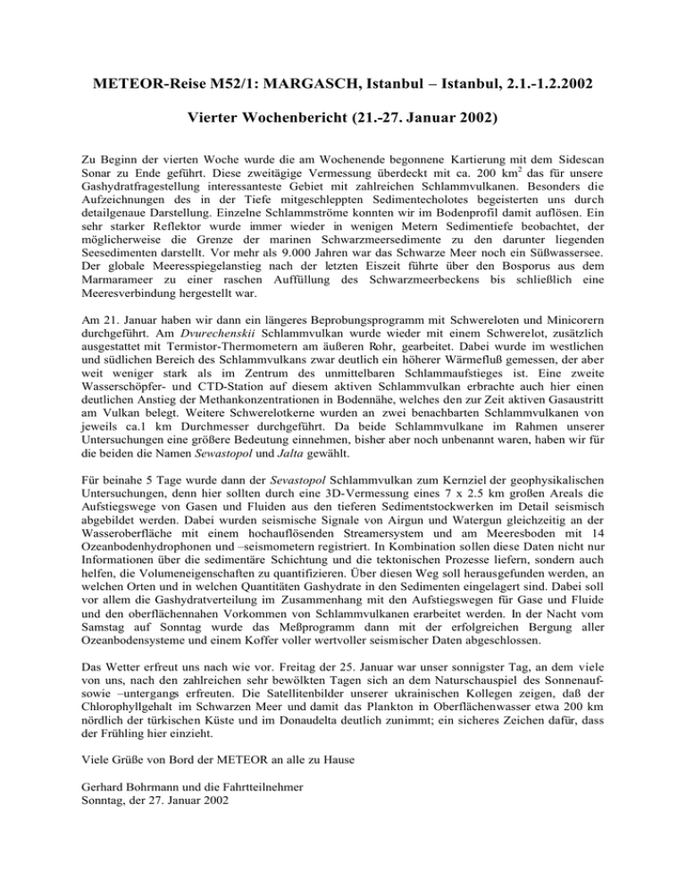 METEOR-Reise M52/1: MARGASCH, Istanbul – Istanbul, 2.1.-1.2.2002 Vierter Wochenbericht (21.-27. Januar 2002) Zu Beginn der vierten Woche wurde die am Wochenende begonnene Kartierung mit dem Sidescan Sonar zu Ende geführt. Diese zweitägige Vermessung überdeckt mit ca. 200 km2 das für unsere Gashydratfragestellung interessanteste Gebiet mit zahlreichen Schlammvulkanen. Besonders die Aufzeichnungen des in der Tiefe mitgeschleppten Sedimentecholotes begeisterten uns durch detailgenaue Darstellung. Einzelne Schlammströme konnten wir im Bodenprofil damit auflösen. Ein sehr starker Reflektor wurde immer wieder in wenigen Metern Sedimentiefe beobachtet, der möglicherweise die Grenze der marinen Schwarzmeersedimente zu den darunter liegenden Seesedimenten darstellt. Vor mehr als 9.000 Jahren war das Schwarze Meer noch ein Süßwassersee. Der globale Meeresspiegelanstieg nach der letzten Eiszeit führte über den Bosporus aus dem Marmarameer zu einer raschen Auffüllung des Schwarzmeerbeckens bis schließlich eine Meeresverbindung hergestellt war. Am 21. Januar haben wir dann ein längeres Beprobungsprogramm mit Schwereloten und Minicorern durchgeführt. Am Dvurechenskii Schlammvulkan wurde wieder mit einem Schwerelot, zusätzlich ausgestattet mit Termistor-Thermometern am äußeren Rohr, gearbeitet. Dabei wurde im westlichen und südlichen Bereich des Schlammvulkans zwar deutlich ein höherer Wärmefluß gemessen, der aber weit weniger stark als im Zentrum des unmittelbaren Schlammaufstieges ist. Eine zweite Wasserschöpfer- und CTD-Station auf diesem aktiven Schlammvulkan erbrachte auch hier einen deutlichen Anstieg der Methankonzentrationen in Bodennähe, welches den zur Zeit aktiven Gasaustritt am Vulkan belegt. Weitere Schwerelotkerne wurden an zwei benachbarten Schlammvulkanen von jeweils ca.1 km Durchmesser durchgeführt. Da beide Schlammvulkane im Rahmen unserer Untersuchungen eine größere Bedeutung einnehmen, bisher aber noch unbenannt waren, haben wir für die beiden die Namen Sewastopol und Jalta gewählt. Für beinahe 5 Tage wurde dann der Sevastopol Schlammvulkan zum Kernziel der geophysikalischen Untersuchungen, denn hier sollten durch eine 3D-Vermessung eines 7 x 2.5 km großen Areals die Aufstiegswege von Gasen und Fluiden aus den tieferen Sedimentstockwerken im Detail seismisch abgebildet werden. Dabei wurden seismische Signale von Airgun und Watergun gleichzeitig an der Wasseroberfläche mit einem hochauflösenden Streamersystem und am Meeresboden mit 14 Ozeanbodenhydrophonen und –seismometern registriert. In Kombination sollen diese Daten nicht nur Informationen über die sedimentäre Schichtung und die tektonischen Prozesse liefern, sondern auch helfen, die Volumeneigenschaften zu quantifizieren. Über diesen Weg soll herausgefunden werden, an welchen Orten und in welchen Quantitäten Gashydrate in den Sedimenten eingelagert sind. Dabei soll vor allem die Gashydratverteilung im Zusammenhang mit den Aufstiegswegen für Gase und Fluide und den oberflächennahen Vorkommen von Schlammvulkanen erarbeitet werden. In der Nacht vom Samstag auf Sonntag wurde das Meßprogramm dann mit der erfolgreichen Bergung aller Ozeanbodensysteme und einem Koffer voller wertvoller seismischer Daten abgeschlossen. Das Wetter erfreut uns nach wie vor. Freitag der 25. Januar war unser sonnigster Tag, an dem viele von uns, nach den zahlreichen sehr bewölkten Tagen sich an dem Naturschauspiel des Sonnenaufsowie –untergangs erfreuten. Die Satellitenbilder unserer ukrainischen Kollegen zeigen, daß der Chlorophyllgehalt im Schwarzen Meer und damit das Plankton im Oberflächenwasser etwa 200 km nördlich der türkischen Küste und im Donaudelta deutlich zunimmt; ein sicheres Zeichen dafür, dass der Frühling hier einzieht. Viele Grüße von Bord der METEOR an alle zu Hause Gerhard Bohrmann und die Fahrtteilnehmer Sonntag, der 27. Januar 2002 Beprobung eines Schwerelotes an Bord von FS METEOR. Das neue Sidescan Sonargeräte geht zu Wasser. Nächtlicher Einsatz mit dem TV-Greifer.