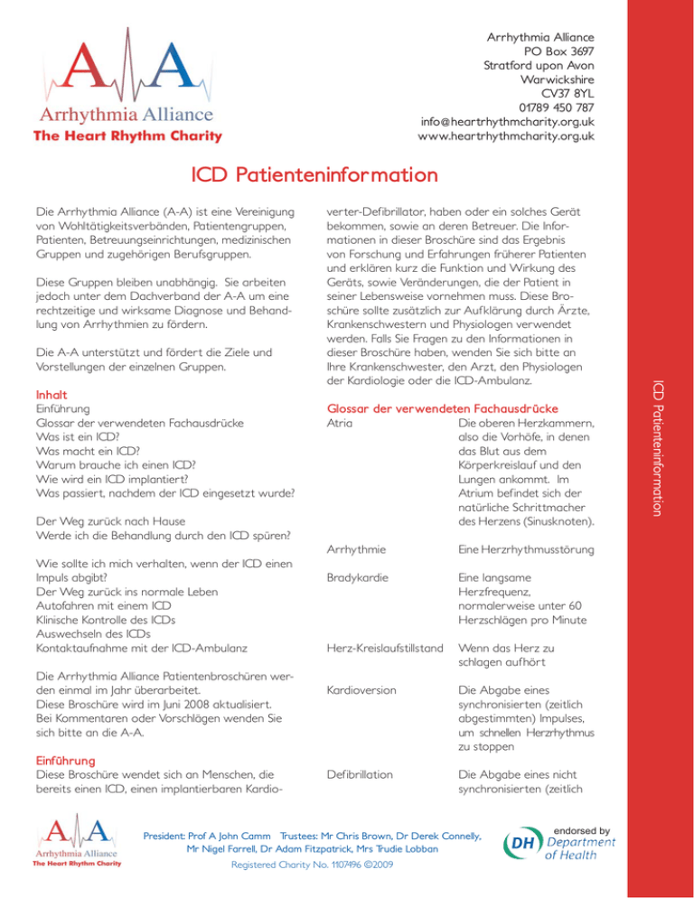 Arrhythmia Alliance PO Box 3697 Stratford upon Avon Warwickshire CV37 8YL 01789 450 787 info@heartrhythmcharity.org.uk www.heartrhythmcharity.org.uk ICD Patienteninformation Die Arrhythmia Alliance (A-A) ist eine Vereinigung von Wohltätigkeitsverbänden, Patientengruppen, Patienten, Betreuungseinrichtungen, medizinischen Gruppen und zugehörigen Berufsgruppen. Diese Gruppen bleiben unabhängig. Sie arbeiten jedoch unter dem Dachverband der A-A um eine rechtzeitige und wirksame Diagnose und Behandlung von Arrhythmien zu fördern. Die A-A unterstützt und förder t die Ziele und Vorstellungen der einzelnen Gruppen. Der Weg zurück nach Hause Werde ich die Behandlung durch den ICD spüren? Wie sollte ich mich verhalten, wenn der ICD einen Impuls abgibt? Der Weg zurück ins normale Leben Autofahren mit einem ICD Klinische Kontrolle des ICDs Auswechseln des ICDs Kontaktaufnahme mit der ICD-Ambulanz Die Arrhythmia Alliance Patientenbroschüren werden einmal im Jahr überarbeitet. Diese Broschüre wird im Juni 2008 aktualisier t. Bei Kommentaren oder Vorschlägen wenden Sie sich bitte an die A-A. Einführung Diese Broschüre wendet sich an Menschen, die bereits einen ICD, einen implantierbaren Kardio- Glossar der verwendeten Fachausdrücke Atria Die oberen Herzkammern, also die Vorhöfe, in denen das Blut aus dem Körperkreislauf und den Lungen ankommt. Im Atrium befindet sich der natürliche Schrittmacher des Herzens (Sinusknoten). Arrhythmie Eine Herzrhythmusstörung Bradykardie Eine langsame Herzfrequenz, normalerweise unter 60 Herzschlägen pro Minute Herz-Kreislaufstillstand Wenn das Herz zu schlagen auf hör t Kardioversion Die Abgabe eines synchronisier ten (zeitlich abgestimmten) Impulses, um schnellen Herzrhythmus zu stoppen Defibrillation Die Abgabe eines nicht synchronisier ten (zeitlich President: Prof A John Camm Trustees: Mr Chris Brown, Dr Derek Connelly, Mr Nigel Farrell, Dr Adam Fitzpatrick, Mrs Trudie Lobban Registered Charity No. 1107496 ©2009 endorsed by by endorsed ICD Patienteninformation Inhalt Einführung Glossar der verwendeten Fachausdrücke Was ist ein ICD? Was macht ein ICD? Warum brauche ich einen ICD? Wie wird ein ICD implantier t? Was passier t, nachdem der ICD eingesetzt wurde? ver ter-Defibrillator, haben oder ein solches Gerät bekommen, sowie an deren Betreuer. Die Informationen in dieser Broschüre sind das Ergebnis von Forschung und Erfahrungen früherer Patienten und erklären kurz die Funktion und Wirkung des Geräts, sowie Veränderungen, die der Patient in seiner Lebensweise vornehmen muss. Diese Broschüre sollte zusätzlich zur Auf klärung durch Ärzte, Krankenschwestern und Physiologen verwendet werden. Falls Sie Fragen zu den Informationen in dieser Broschüre haben, wenden Sie sich bitte an Ihre Krankenschwester, den Arzt, den Physiologen der Kardiologie oder die ICD-Ambulanz. Arrhythmia Alliance PO Box 3697 Stratford upon Avon Warwickshire CV37 8YL 01789 450 787 info@heartrhythmcharity.org.uk www.heartrhythmcharity.org.uk nicht abgestimmten) Impulses, um schnellen Herzrhythmus zu stoppen Herzinfarkt Tritt auf, wenn ein Blutgerinnsel eine der Herzkranzar terien verstopft. Die Blutzufuhr zu einem Teil des Herzmuskels wird unterbrochen, wodurch ein Teil des Herzmuskelgewebes abstirbt. Impulsgenerator Ventrikel Die beiden unteren Herzkammern. Die rechte Herzkammer pumpt das Blut in die Lunge, und die linke Herzkammer pumpt das Blut in den Körperkreislauf. Ventrikuläres Ein schneller und gefährlicher Herzrhythmus, der dazu führ t, dass das Herz seine Pumpfunktion einstellt. Dieser Rhythmus Flimmern (VF / Herzkammerflimmern) kann nur durch einen Schock gestoppt werden, damit die Herzfrequenz wieder in einen normalen Rhythmus zurück versetzt wird. Wird dieser Zustand nicht umgehend mit einem Schock behandelt, führ t dies in Kürze zum Herzstillstand. Ein schneller Herzrhythmus, der dazu führ t, dass das Herz weniger effizient pumpt mit der Folge von Tachykardie (VT) Schwindel, Ohnmachtsanfällen und Bewusstlosigkeit. Wird dieser Zustand nicht medikamentös bzw. durch Stimulation oder elektrischen Schock behandelt, kann dieser Herzrhythmus zu Kammerflimmern führen. Was ist ein ICD? ICD steht für Implantable Cardiover ter Defibrillator, auf deutsch implantierbarer Kardiover terDefibrillator. Es handelt sich um ein kleines, schmales, kästchenförmiges Gerät, das eine Batterie und elektronische Schaltkreise enthält. Über eine oder mehrere Elektroden ist dieses Gerät mit Ihrem Herz verbunden. Die Elektroden führen durch ein Blutgefäß zu Ihrem Herzen und die ICD-Box wird normalerweise unter der Haut im oberen Brustbereich, in der Nähe des Schlüsselbeins, implantier t. Der ICD kann Ihren Herzrhythmus erkennen und überwachen und er kann bei Bedarf mit einer Behandlung reagieren. Er speicher t auch Informationen über Ihre Herzfrequenz und Ihren Herzrhythmus, die dann bei Ihrer nächsten Nachsorgeuntersuchung in der Klinik zur Verfügung stehen. Was macht ein ICD? Die meisten modernen ICDs haben drei Hauptfunktionen, das heißt jedoch nicht, dass Sie auch alle Funktionen brauchen oder verwenden. Ihr Kardiologe wird die für Ihr Krankheitsbild richtigen und besten Einstellungen vornehmen. • Ist Ihr Herzrhythmus zu langsam, kann das Gerät Ihr Herz durch zusätzliche Impulse unterstützen in der Funktion eines normalen Herzschrittmachers. Dies wird mit President: Prof A John Camm Trustees: Mr Chris Brown, Dr Derek Connelly, Mr Nigel Farrell, Dr Adam Fitzpatrick, Mrs Trudie Lobban Registered Charity No. 1107496 ©2009 endorsed by by endorsed ICD Patienteninformation Der Teil des ICDs, der die Batterie und die elektrischen Schaltkreise enthält. Ventrikuläre Arrhythmia Alliance PO Box 3697 Stratford upon Avon Warwickshire CV37 8YL 01789 450 787 info@heartrhythmcharity.org.uk www.heartrhythmcharity.org.uk antibradykarder Stimulation bezeichnet. • • Schlägt Ihr Herz zu schnell, kann der ICD Ihrem Herzen einen so genannten Burst mit zusätz