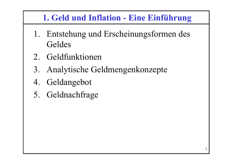 1. Geld und Inflation - Eine Einführung 1. Entstehung und Erscheinungsformen des Geldes 2. Geldfunktionen 3. Analytische Geldmengenkonzepte 4. Geldangebot 5. Geldnachfrage 1 1.1. Entstehung und Erscheinungsformen des Geldes • Was ist Geld? • Wie ist es dazu gekommen, dass wir Banknoten und Münzen als Geld benutzen? • Können andere Finanzinstrumente wie Geld benutzt? Vgl. Jarchow, I.1.c 2 Was ist Geld? 3 Was ist Geld? 4 Eigenschaften des Geldes • Homogenität – • Teilbarkeit – • Aus 100 €, 10.000 Cent. Aus einem Muschel? Haltbarkeit – • Jeder 5 € Schein ist gleich. Jeder Conch-Muschel? Eine 1 € Münze wird uns überleben. Ein Karton Milch? Knappheit – • Bedruckte Geldscheine ggü. unbedrucktem Papier (Nicht-reproduzierbarkeit?) – Eine 1 € Münze kann nicht jeder prägen. Tabak selber anbauen? 5 Warengeld • Beispiele: Weizen, Salz, Muscheln, Fische, Häute, Metalle, Zigaretten usw. • Münzen als standardisiertes Metallgeld (Homogenität) • Welche Güter setzen sich als Tauschmittel durch? • Antworten bieten Kiyotaki/Wright[1] und nachfolgende Literatur: 1. Güter, die von Vielen als nützlich erachtet werden (intrinsischer Wert für denjenigen, der das Gut annimmt) 2. Güter, die relativ geringe Lagerhaltungs- und Transportkosten aufweisen. [1] Kiyotaki, Nobuhiro, & Wright, Randall, 1989, Journal of Political Economy, vol. 97(4), pages 927-54. 6 Kreditgeld I/II Beispiele: Scheidemünzen, Wechsel, Banknoten, Buchgeld • Scheidemünzen = nicht vollwertige Münzen -Handelswert höher als Metallwert • Wechsel = verbrieftes Zahlungsversprechen -Beispiel nächste Folie • private Banknoten: -Bank stellt Noten aus, die von Dritten akzeptiert werden. -Verpflichtung der Bank, die Noten jederzeit gegen Gold einzulösen. 7 Wechsel Beispiel: • A kauft Waren bei B, • hat aber kein Gold dabei • besorgt sich vorher bei seiner Bank einen Wechsel, mit dem der Bankier verspricht, dem Inhaber eine bestimmte Menge Goldes zu geben. •B kann den Wechsel seinerseits weiterreichen an C, C an D, bis evtl. D den Wechsel einlöst. Besonderheit: Jeder Zeichner haftet für den Wechsel! 8 Kreditgeld II/II • Im 19. Jahrhundert: Übergang zu staatlichen Banken, Banknotenmonopol. • Allmähliche Aufgabe der Verpflichtung, Noten gegen Metall umzutauschen. • Buchgeld: nicht verbriefte Forderungen an Zentralbank oder Geschäftsbanken, die jederzeit in verbriefte Forderungen / Banknoten umgetauscht werden können. 9 Geldnahe Forderungen • Beispiele: Termineinlagen, Spareinlagen mit Kündigungsfrist. • Erfüllen einige, aber nicht alle der Funktionen des Geldes: • Wertaufbewahrung, aber nicht Tauschmittel. • Gleichwohl: leichte Umwandelbarkeit in Buchgeld, werden daher zur Geldmenge im weiteren Sinne gezählt. 10 1.2. Geldfunktionen • Tauschmittel • Recheneinheit • Wertaufbewahrung Vgl. Jarchow, I.1.a-b 11 Tauschmittel • Stellen wir uns vor, Person A besitzt Gut 1 und will Gut 2, B besitzt Gut 2 und will Gut 3, C besitzt Gut 3 und will Gut 1. • Wie kann es zu einer Re-Allokation der Güter kommen? – „double-coincidence of wants“ liegt nicht vor. • Koordinierter Ringtausch, Intermediär, Tauschmittel? 12 Tauschmittel 1. Alle drei treffen sich an einem Ort und handeln einen Ringtausch aus. (Bei mehr Personen schwieriger.) 2. Eine Person (z.B. A) fungiert als Zwischenhändler (Intermediär): Jeder liefert seine Güter bei A ab, A liefert anschließend die gewünschten Güter aus. 3. Ein Gut wird als Tauschmittel akzeptiert (z.B. Gut 1): – Schritt 1: A tauscht mit B, A verbessert sich: erhält sein gewünschtes Gut B verbessert sich, erhält das Tauschmittel – Schritt 2: B tauscht mit C, beide verbessern sich, weil sie ihre gewünschten Güter erhalten. Intermediär und Tauschmittel setzen Vertrauen voraus! 13 Recheneinheit • Wenn alle Güter gegen Geld getauscht werden können – bilden sich Preise, die in Geldeinheiten ausgedrückt werden • Wertmaßstab, direkte Vergleichbarkeit des Wertes verschiedener Güter – auch solcher, die nicht gegeneinander getauscht werden • Erleichtert – Allokationsprozess und – Produktionsentscheidungen 14 Wertaufbewahrung • Tauschmittelfunktion bedingt zumindest kurzfristige Lagerfähigkeit des Geldes • Somit dient es zumindest einer kurzfristigen Wertaufbewahrung • Je nach physischer Beschaffenheit bzw. Wertverlust pro Zeiteinheit kann Geld dienen: • der mittel- und • langfristigen Wertaufbewahrung 15 Zusammenhänge zwischen Funktionen • Recheneinheit und Wertaufbewahrung ergeben sich unmittelbar aus der Tauschmittelfunktion. • Umgekehrt ist es leichter einen Handelspartner zu überzeugen, ein Gut in Zahlung zu nehmen, das wertbeständig ist • Die Wertbeständigkeit spielt eine große Rolle bei der Durchsetzung einzelner Güter als Warengeld • Aber auch bei der Entscheidung, in welcher von verschiedenen Währungen Transaktionen abgeschlossen werden. – Beispiele: Dollar oder Euro fungieren in vielen Ländern als inoffizielle Währung, weil die eigene Währung zu instabil ist. 16 1.3 Analytische Geldmengenkonzepte Unterscheide: • Geldschöpfungssektor – monetäre Finanzinstitute, die Einlagen entgegennehmen (Zentral- und Geschäftsbanken, sowie andere Finanzinstitute) • Geldhaltungssektor – alle übrigen privaten und öffentlichen Haushalte unterhalb der Zentralregierung und Unternehmen (kurz „Nichtbanken“). 17 Geldmenge Bargeldumlauf: Banknoten und Münzen im Besitz von Nichtbanken. M1 = Bargeldumlauf + täglich fällige Einlagen (Girokonten) von Nichtbanken. - höchste Liquidität M2 = M1 + Einlagen mit Laufzeit bis zu 2 Jahren oder Kündigungsfrist von bis zu 3 Monaten. - dient z.T. stärker der Wertaufbewahrung als der Verfügung als Zahlungsmittel (insb. Termingelder) M3 = M2 + Verbindlichkeiten aus Wertpapierpensionsgeschäften + Schuldverschreibungen mit Laufzeit bis zu 2 Jahren + Geldmarktfondanteile und Geldmarktpapiere Monetäre Basis: Banknoten, Münzen un