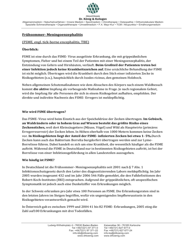 PRIVATPRAXIS Dr. König & Kollegen Allgemeinmedizin • Naturheilverfahren • Innere Medizin • Sportmedizin • Chirotherapie • Osteopathie • Orthomolekulare Medizin Spezielle Schmerztherapie • Organzelltherapie • Umweltmedizin • F.X. Mayr-Kur • TCM / Akupunktur • Ernährungsmedizin Frühsommer- Meningoenzephalitis (FSME, engl. tick-borne encephalitis, TBE) Überblick: FSME ist eine durch das FSME- Virus ausgelöste Erkrankung, die mit grippeähnlichen Symptomen, Fieber und bei einem Teil der Patienten mit einer Meningoenzephalitis, der Entzündung von Gehirn und Hirnhäuten, verläuft. Beim Großteil der Patienten treten bei einer Infektion jedoch keine Krankheitszeichen auf. Eine ursächliche Behandlung der FSME ist nicht möglich. Übertragen wird die Krankheit durch den Stich einer infizierten Zecke in Risikogebieten (s.u.), hauptsächlich durch Ixodes ricinus, den gemeinen Holzbock. Neben allgemeinen Schutzmaßnahmen wie dem Absuchen des Körpers nach einem Waldbesuch kommt die aktive Impfung als vorbeugende Maßnahme in Frage. Je nach regionalem Gebiet, wird die Impfung für alle Personen die sich in einem Risikogebiet aufhalten, empfohlen. Der direkte und indirekte Nachweis des FSME- Erregers ist meldepflichtig. Wie wird FSME übertragen? Das FSME- Virus wird beim Einstich aus der Speicheldrüse der Zecken übertragen. Im Gebüsch, an Waldrändern oder in hohem Gras auf Wiesen besteht das größte Risiko eines Zeckenstiches, weil dort Kleinsäugetiere (Mäuse, Vögel) und Wild als Hauptwirte (primäres Erregerreservoir) der Zecken leben. In Höhen oberhalb von 1000 Metern kommen keine Zecken vor. In Risikogebieten liegt der Anteil der FSME- infizierten Zecken bei etwa 1- 5%.Durch Zecken kann auch das Bakterium Borrelia burgdorferi übertragen werden und zur LymeBorreliose führen. Dabei handelt es sich um eine Krankheit, die wesentlich häufiger als die FSME auftritt. Während die FSME in Deutschland nur in bestimmten Risikogebieten auftritt, ist bei der Borreliose von einer Infektionsgefährdung in allen Landesteilen auszugehen. Wie häufig ist FSME? In Deutschland ist die Frühsommer- Meningoenzephalitis seit 2001 nach § 7 Abs. 1 Infektionsschutzgesetz durch den Leiter des diagnostizierenden Labors meldepflichtig. Im Jahr 2005 wurden insgesamt 432 und im Jahr 2006 546 Fälle gemeldet, die den Falldefinitionen des Robert-Koch-Institutes (RKI) entsprachen. Aufgrund der grippeähnlichen, oft unspezifischen Symptomatik ist jedoch auch eine Dunkelziffer von Erkrankungen möglich. In der Schweiz erkranken pro Jahr etwa 100 Personen an FSME. Die Erkrankungsraten sind in den letzten Jahren im Steigen begriffen, wofür ein ungenügendes Impfbewusstsein in den Risikogebieten verantwortlich gemacht wird. In Österreich gab es zwischen 1999 und 2004 41 bis 82 FSME- Erkrankungen, 2005 stieg die Zahl auf100 Erkrankungen mit drei Todesfällen. Ludwig-Wilhelmplatz 4 • 76530 Baden-Baden Tel +49(7221) 97 371-0 Fax: +49(7221) 97 371-22 info-bb@drkoenig.com www.drkoenig.com Kaiserallee 36 • 76185 Karlsruhe Tel +49(721) 627 677-0 Fax +49(721) 627 677-24 info-ka@drkoenig.com www.drkoenig.com PRIVATPRAXIS Dr. König & Kollegen Allgemeinmedizin • Naturheilverfahren • Innere Medizin • Sportmedizin • Chirotherapie • Osteopathie • Orthomolekulare Medizin Spezielle Schmerztherapie • Organzelltherapie • Umweltmedizin • F.X. Mayr-Kur • TCM / Akupunktur • Ernährungsmedizin Wo sind Risikogebiete? (genaue Definition (RKI): Ein Kreis wird als FSME- Risikogebiet definiert, wenn die Anzahl der übermittelten FSME- Erkrankungen im Zeitraum 2002 bis 2006 im Kreis ODER in der Kreisregion bestehend aus dem betreffenden Kreis sowie allen angrenzenden Kreisen) signifikant (p<0,05) höher liegt als bei einer Inzidenz von 1 Erkrankung pro 100.000 Einwohner erwartete Fallzahl) Als FSME- Risikogebiete gelten Landkreise, in denen im Zeitraum von einem Jahr mindestens zwei oder innerhalb einer 5-Jahresperiode mindestens fünf Erkrankungen festgestellt wurden. Dabei muss die Ansteckung im selben Gebiet erfolgt sein. Als Hochrisikogebiete gelten diejenigen Risikogebiete, in denen innerhalb von fünf Jahren mindestens 25 Krankheitsfälle auftraten. In Deutschland gelten die meisten Landkreise Baden-Württembergs (Ausnahme LK Germersheim, LK Rhein- Pfalz- Kreis, SK Speyer, SK Worms) und Bayerns sowie einzelne Kreise in Rheinland-Pfalz, Hessen und Thüringen als Risikogebiete. Hochrisikogebiete sind der Schwarzwald in Südbaden, der südhessische Odenwald, die Bergstraße sowie die Region um Passau. In der Schweiz finden sich Risikogebiete in den nördlichen Landesteilen, am häufigsten im Kanton Zürich, gefolgt von Thurgau, St. Gallen, Aargau, Bern und Zug. Österreich gilt als ein Kernland der FSME- Virusverbreitung in Europa, das gesamte Bundesgebiet ist Zecken-Endemiegebiet, wobei sich die FSME in den Alpen auf die größeren Täler beschränkt. Die meisten Erkrankungen gab es 2005 in der Steiermark, Oberösterreich und Tirol, jedoch gab es in allen Bundesländern FSME- Fälle. Die Hochrisikogebiete befinden sich entlang der Donau in Wien, in der Wachau, im Gebiet von St. Pölten sowie zwischen Passau und Linz. Auch große Teile des Burgenlandes, Kärntens und der Steiermark sowie das Tiroler Inntal sind Gebiete mit hohem Risiko, dazwischen finden sich weitere Risikogebiete. Als Besonderheit erkranken in Österreich trotz der weiten Verbreitung verhältnismäßig wenige Personen an FSME, was an der hohen Impfrate von rund 90% liegt. In anderen europäischen Ländern ist die Situation sehr unterschiedlich. Besonders ausgeprägt ist das Risiko in Russland, der Tschechischen Republik und europaweit am höchsten in den baltischen Staaten Litauen, Estland und Lettland. Eine nicht unerhebliche Bedeutung besitzt die FSME neben Deutschland, Österreich und der Schweiz vor allem in Polen, Ungarn, Slowenien, Kroatien, Schweden, Finnland und der Slowakischen Republik. Nur selten wird ein Vork