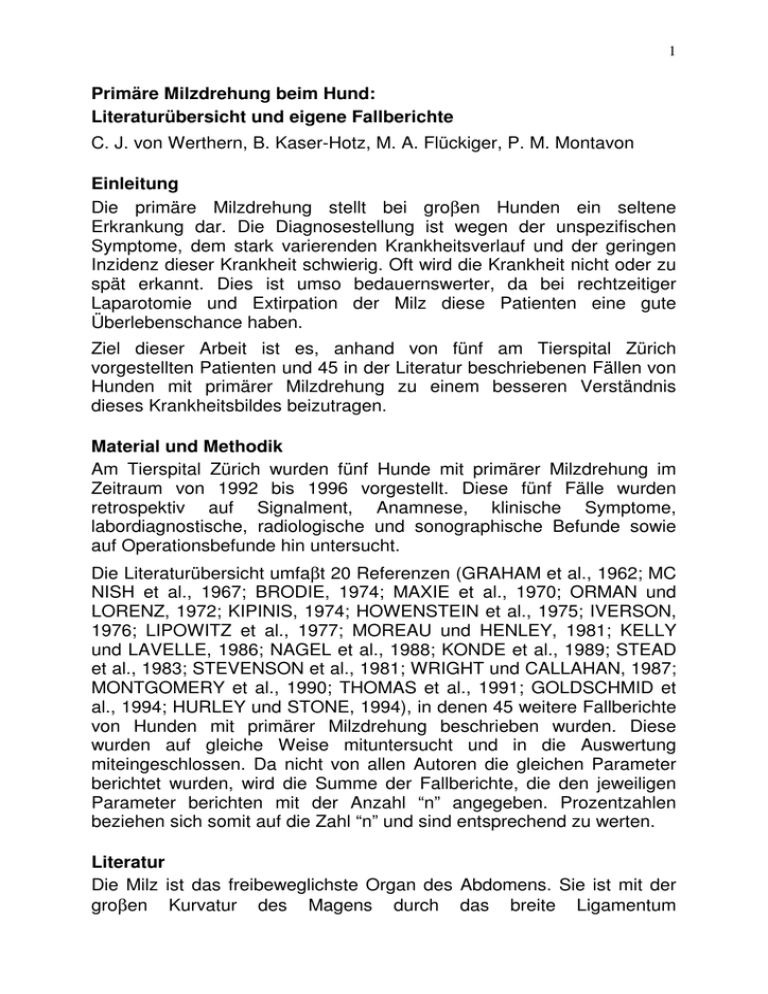 1 Primäre Milzdrehung beim Hund: Literaturübersicht und eigene Fallberichte C. J. von Werthern, B. Kaser-Hotz, M. A. Flückiger, P. M. Montavon Einleitung Die primäre Milzdrehung stellt bei groβen Hunden ein seltene Erkrankung dar. Die Diagnosestellung ist wegen der unspezifischen Symptome, dem stark varierenden Krankheitsverlauf und der geringen Inzidenz dieser Krankheit schwierig. Oft wird die Krankheit nicht oder zu spät erkannt. Dies ist umso bedauernswerter, da bei rechtzeitiger Laparotomie und Extirpation der Milz diese Patienten eine gute Überlebenschance haben. Ziel dieser Arbeit ist es, anhand von fünf am Tierspital Zürich vorgestellten Patienten und 45 in der Literatur beschriebenen Fällen von Hunden mit primärer Milzdrehung zu einem besseren Verständnis dieses Krankheitsbildes beizutragen. Material und Methodik Am Tierspital Zürich wurden fünf Hunde mit primärer Milzdrehung im Zeitraum von 1992 bis 1996 vorgestellt. Diese fünf Fälle wurden retrospektiv auf Signalment, Anamnese, klinische Symptome, labordiagnostische, radiologische und sonographische Befunde sowie auf Operationsbefunde hin untersucht. Die Literaturübersicht umfaβt 20 Referenzen (GRAHAM et al., 1962; MC NISH et al., 1967; BRODIE, 1974; MAXIE et al., 1970; ORMAN und LORENZ, 1972; KIPINIS, 1974; HOWENSTEIN et al., 1975; IVERSON, 1976; LIPOWITZ et al., 1977; MOREAU und HENLEY, 1981; KELLY und LAVELLE, 1986; NAGEL et al., 1988; KONDE et al., 1989; STEAD et al., 1983; STEVENSON et al., 1981; WRIGHT und CALLAHAN, 1987; MONTGOMERY et al., 1990; THOMAS et al., 1991; GOLDSCHMID et al., 1994; HURLEY und STONE, 1994), in denen 45 weitere Fallberichte von Hunden mit primärer Milzdrehung beschrieben wurden. Diese wurden auf gleiche Weise mituntersucht und in die Auswertung miteingeschlossen. Da nicht von allen Autoren die gleichen Parameter berichtet wurden, wird die Summe der Fallberichte, die den jeweiligen Parameter berichten mit der Anzahl “n” angegeben. Prozentzahlen beziehen sich somit auf die Zahl “n” und sind entsprechend zu werten. Literatur Die Milz ist das freibeweglichste Organ des Abdomens. Sie ist mit der groβen Kurvatur des Magens durch das breite Ligamentum 2 gastrolienale, einem Teil des Netzes, verbunden. Hierdurch ist sie dorsal besser befestigt als ventral. Das Ligamentum splenocolicum zieht von der Milz zum Kolon. Durch diese relativ lose Aufhängung kann sich die Milz den unterschiedlichen Füllungszuständen des Magens anpassen und sich bei maximaler Blutspeicherung sogar über die Mediane nach rechts verlagern (BEZUIDENHOUT, 1993). Es wird angenommen (MAXIE et al., 1970), daß bei der primären Milzdrehung die Verdrehung der Bänder um den Gefässstumpf zuerst eine Okklusion des venösen Rückflusses von der Milz verursacht. Dies führt zu einer Stauungsmilz. Wegen der wesentlich stärker ausgeprägten Muscularis der Arterienwand wird der arterielle Zufluß erst später komprimiert. Mit Fortbestehen der Milzdrehung kommt es zu einem völligen Sistieren des Blutflusses und zu einer Thrombosierung des Blutes in den Milzgefäßen. Die primäre Milzdrehung ist eine bei Mensch, Schwein und Hund auftretende Erkrankung. Die Inzidenz beim Mensch ist mit 0,16% gering (BÜHNER und BAKER, 1992). Bei der adulten Sau zählt die primäre Milzdrehung hingegen zu den häufigeren Todesursachen (MADERBACHER et al., 1992). Die Milzdrehung beim Hund kann im Zusammenhang mit einer Magendrehung auftreten (THOMAS et al., 1991, LIPOWITZ et al., 1993) oder isoliert davon als primäre Milzdrehung. SPANGLER und CULBERTSON (1992) konnte in einer retrospektiven Studie über 1480 Milzerkrankungen bei Hunden zeigen, daβ die Inzidenz der primären Milzdrehung unter 1% liegt. Klinische Symptome einer primären Milzdrehung beim Hund können innerhalb von Minuten auftreten (ORMAN und LORENZ, 1972; BRODIE, 1974; KIPINIS, 1974; STEAD et al., 1983; KELLY und LAVELLE, 1986; STICKLE, 1989; LIPOWITZ und BLUE, 1993) oder sich über Tage und Monate erstrecken (MAXIE et al., 1970; LIPOWITZ et al., 1977; STEVENSON et al., 1981; STEAD et al., 1983; KONDE et al., 1989; STICKLE, 1989; LIPOWITZ und BLUE, 1993; GOLDSCHMID et al., 1994). Die Symptome sind unspezifisch und können von chronischer Lethargie, verminderter Futteraufnahme und paroxysmalem Erbrechen bis hin zu akut auftretenden Schocksymptomen und anschlieβendem Herz-/Kreislaufversagen und Tod variieren. Bei der klinischen Untersuchung können diese Patienten Schocksymptome, wie hoher Puls, blaße Schleimhäute und verlängerte kapilläre Füllungszeit aufweisen. Weitere Befunde können ein verspanntes Abdomen und manchmal eine abdominale Masse sein. Als Ergebnis der Blutuntersuchung treten häufig Anämie, Leukozytose, Erhöhung der alkalischen Phosphatase, sowie Bilirubinämie und Bilirubinurie auf (STEVENSON et al., 1981; MONTGOMERY et al., 3 1990). Die Pathogenese der primären Milzdrehung ist bis heute unklar. Bei der beim Menschen auftretenden wandernden Milz wird von einem angeborenen oder erworbenen Defekt der Milzmagenbänder berichtet, welcher die Drehung der Milz ermöglicht (SWISCHUK et al., 1993). Lockere Milzmagenbänder sind auch beim Schwein für die primäre Milzdrehung verantwortlich. Die primäre Milzdrehung stellt bei dieser Spezies eine häufige Todesursache dar (MADERBACHER et al., 1993). Beim Hund wird vermutet (MAXIE et al., 1970), daβ die primäre Milzdrehung die Folge einer überstandenen partiellen oder vollständigen Magendrehung ist; hierdurch werden die Milzmagenbänder überdehnt und sind damit vorgeschädigt. Aus der daraus resultierenden erhöhten Beweglichkeit der Milz kann später eine isolierte Milzdrehung entstehen. Fallberichte Fall 1 Eine 4-jährige, 51.7 kg schwere, männliche Dogge wurde wegen eines verspannten Abdomens und einer seit zwei Tagen bestehenden Lethargie überwiesen. In den Tagen vor der Einweisung hatte der Hund mehrmals unverdautes Futter nach dem Fressen erbrochen. Bei der Allgemeinuntersuchung wurden bl
