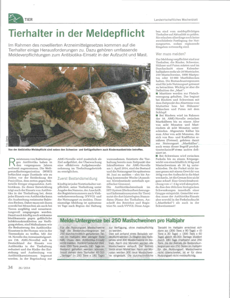 TIER Landwirtschaftliches Tierhalter in der Meldepflicht Im Rahmen des novellierten Arzneimittelgesetzes kommen auf die Tierhalter einige Herausforderungen zu. Dazu gehören umfassende Meldeverpflichtungen zum Antibiotika-Einsatz in der Aufzucht und Mast. Von der Antibiotika-Meldepflicht R sind neben den Schweine- und Geflügelhaltern auch Rindermastbetriebe betroffen. esistenzen von Bakterien gegen Antibiotika haben in den vergangenen Jahren weltweit zugenommen. Die Weltgesundbeitsorganisation (WHO) befürchtet sogar Zustände wie zu Zeiten vor der Entdeckung des Penicillins, dem ersten gegen bakterielle Erreger eingesetzten Antibiotikum. Zu dieser Entwicklung trägt auch der Einsatz von Antibiotika in der Tierhaltung bei, denn jeder Einsatz von Antibiotika kann die Ausbreitung resistenter Bakterien fördern. Daher muss mit ihnen sowohl bei Menschen als auch bei Tieren sorgfaltig und verantwortungsvoll umgegangen werden. Damit auch künftig noch wirksame Medikamente gegen gefährliche Infektionskrankheiten zur Verfügung stehen, sind Maßnahmen wie die Reduzierung des AntibiotikaEinsatzes in der Human- wie in der Tiermedizin zu treffen. Mit der 16. Novelle des Arzneimittelgesetzes (16. AMG-Novelle) soll in Deutschland der Einsatz von Antibiotika in der Tierhaltung reduziert und das Risiko der Entstehung und Ausbreitung von Antibiotikaresistenzen begrenzt werden .. In der Begründung zur 34 26/2014 AMG-Novelle wird zusätzlich als Ziel aufgeführt, der Überwachung eine effektivere Aufgabenwahrnehmung im Tierhaltungsbetrieb zu ermöglichen. Zuerst Bestandsmeldung Künftig ist jeder Nutztierhalter verpflichtet, seine Tierhaltung unter Angabe des Namens, der Anschrift, der Registriernummern nach Viehverkehrsverordnung (VVVO) und der Nutzungsart zu melden. Diese einmalige Meldung ist spätestens 14 Tage nach Beginn der Haltung vorzunehmen. Existierte die Tierhaltung bereits zum Zeitpunkt des Inkrafttretens der AMG-Novelle am 1. April2014, sind der Bestand und die Nutzungsart bis spätestens 30. Juni zu melden - also bis Anfang kommender Woche (Ausnahme: Kleinbestände unterhalb spezifischer Grenzen). Die Antibiotikadatenbank im HIT-System (Herkunftssicherungsund Informationssystem für Tiere) nutzt die dort hinterlegten Stammdaten (Name des Tierhalters, Anschrift des Betriebes und Registrier-Nr. nach VVVO). Diese Anga- Wochenblatt ben sind vom meldepflichtigen Tierhalter auf Aktualität zu prüfen. Sie erlauben allerdings noch keine zweifelsfreie Festlegung der Nutzungsarten, sodass ergänzende Eingaben notwendig sind. Wer muss melden? Zur Meldung verpflichtet sind nur Tierhalter, die Rinder, Schweine, Hühner und Puten mästen und im Durchschnitt eines Kalenderhalbjahres mehr als 20 Mastrinder, 250 Mastschweine, 1000 Mastputen oder 10 000 Masthähnchen halten. Die Bestandsuntergrenzen sind für jede Nutzungsart getrennt zu betrachten. Wichtig ist aber die Definition der "Mast": • Masttiere werden zur Fleischerzeugung gehalten. Das beginnt bei Rindern und Schweinen mit dem Zeitpunkt des Absetzens vom Muttertier bzw. bei HühnernI Hähnchen und Puten mit dem Schlupf. • Bei Rindern wird im Rahmen der 16. AMG-Novelle zwischen Mastkälbern bis zu einem Alter von acht Monaten und Mastrindern ab acht Monaten unterschieden. Abgesetzte Kälber bis zum Alter von acht Monaten, die sich von Rau- und Kraftfutter ernähren (Fresser), gehören damit zur Nutzungsart "Mastkälber" , auch wenn dieser Begriff produktiontechnisch9 etwas anders definiert ist. • Bei Schweinen wird zwischen Ferkeln bis zu einem Körpergewicht von einschließlich 30 kg und Mastschweinen ab 30 kg unterschieden. Da die Ferkel nicht immer genau mit einem Gewicht VQn 30 kg von der Aufzucht in die Mast wechseln, ist die Grenze hier nicht ganz scharf: Eine Gewichtsabweichung von +1-5 kg wird akzeptiert, da dies den üblichen biologischen Schwankungen innerhalb einer Gruppe entspricht. Gemeldet werden muss der Antibiotika-Einsatz aber sowohl in der Ferkelaufzucht ("Mastferkel") als auch in der Schweinernast! Melde-Untergrenze bei 250 Mastschweinen pro Halbjahr FOr die Nutzungsart Mastschweine liegt die Bestandsuntergrenze bei 250 durchschnittlich gehaltenen Treren im Halbjahr. Wer weniger Trere halt, muss den Antibiotika-Einsatz nicht melden. Konkret bedeutet dies, dass 250 Trere jeweils 180 Tage im Bestand gehalten werden können. Somit stehen dem Trerhalter 45 000 •Tiertage" (= 250 Trere x 180 Tage) zur VerfOgung, ohne meldepflichtig zu werden. Dies soll anhand eines Beispiels verdeutlicht werden: Zu Beginn des Halbjahres sind 300 Mastschweine im Betrieb. Nach drei Monaten werden alle Mastschweine verkauft. Der Betrieb bleibt einen Monat leer. Nach vier Monaten werden 300 neue Mastschweine eingestallt. Die durchschnittliche Tierzahl im Halbjahr errechnet sich dann so: (300 Tiere x 90 Tage) + (0 Tiere x 30 Tage) + (300 Tiere x 60 Tage) gleich 45000 Tiertage dividiert durch IBO Tage (Halbjahr) sind 250 Tiere. Da der Betrieb die Bestandsuntergrenzen von 250 lieren im Halbjahr fOr die Nutzungsart Mastschweine nicht Oberschreitet, ist er für diese Nutzungsart nicht meldepflichtfg. Zeitplan zur Antibiotikameldung Oberb/ick über den Zeitab/auf zur Me/dung des Antibiotika-Einsatzes SchrittlMa6nahme 1.04.2014 • Inkraftreten des Gesetzes • Mitteilung bestehender lierhaltung und Nutzungsart (bis spätestens 30. Juni 2014) • Beginn des ersten Erhebungszeitraums (Halbjahr) • Masthühner und Mastputen sind männliche und weibliche Tiere, die zum Zweck der Fleischerzeugung (Mast) gehalten werden. Im Rahmen der AMG-Novelle beginnt die Mastperiode ab dem Schlupf. 1.07.2014 31.12.2014 Zu- und Abgänge melden! 28.02.2015 (spätestens Ende des 2. Monats nach Erhebungszeitraum) Eine wichtige Neuerung beinhaltet das AMG auch hinsichtlich der Angabe bzw. Berechnung des halbjährlichen Durchschnittsbestendes: Die durchschnittliche Anzahl der gehaltenen Tiere pro Halbjahr soll berechnet werden, indem anhand der Tierbewegungsmeldungen tagesge