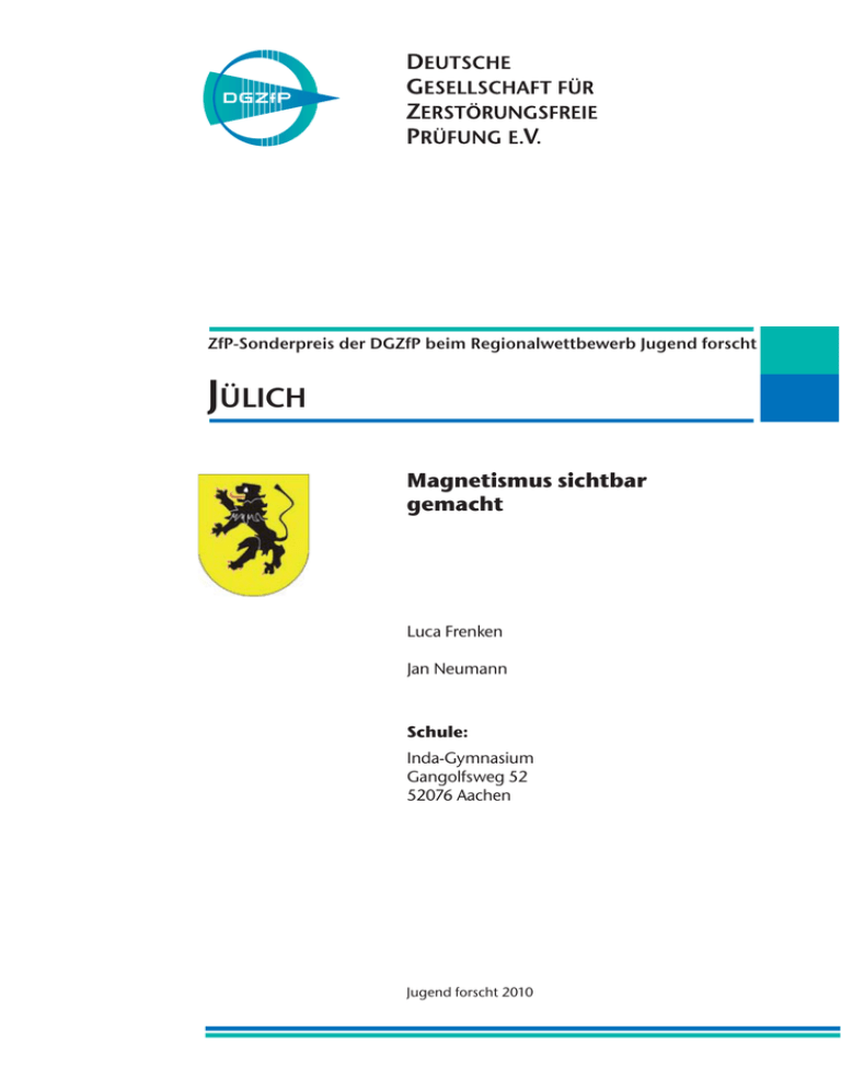 ZfP-Sonderpreis der DGZfP beim Regionalwettbewerb Jugend forscht JÜLICH Magnetismus sichtbar gemacht Luca Frenken Jan Neumann Schule: Inda-Gymnasium Gangolfsweg 52 52076 Aachen Jugend forscht 2010 Jugend Forscht 09/10 Eine Arbeit von Jan Neumann und Luca Frenken Inhaltsverzeichnis 1. 1.1 1.2 1.2.1 1.2.2 1.3 1.3.1 1.3.2 1.4 2. 3. 4. 4.1 4.2 4.3 4.4 5. 5.1 5.1.1 5.1.2 5.1.3 5.1.3.1 5.1.3.2 5.1.3.3 5.1.3.4 5.2 5.2.1 5.2.2 6. 6.1 6.2 6.3 6.4 6.5 Funktionsprinzip eines Röhrenbildschirms Braunsche Röhre Lochmaske Lochmaske Schlitzmaske Entstehung der Farben Die RGB‐ Farben Helligkeitsregelung durch Spannung Entstehung eines Films Lorentzkraft Vektoren Eigenschaften von Magneten Magnetische Flussdichte Magnetische Feldlinien Elektromagneten Abschirmung von magnetischen Feldern Veränderung durch einen Magneten Beobachtungen Farbwechsel Struktur der Veränderung Beobachtungen bei unterschiedlichen Einstellungen Unterschiede bei Loch‐ und Schlitzmaske Unterschiede bei geänderter Hintergrundfarbe Unterschiede bei Süd‐ und Nordpol Unterschiede bei geänderter Entfernung Erklärung Farbwechsel Struktur der Veränderung Veranschaulichungsmöglichkeiten Abschirmung durch Eisen Magnetische Wechselfelder Pulsierender Gleichstrom Gleiche bzw. unterschiedliche Vektoren Komplementärfarben Einleitung: Vielleicht ist Ihnen das auch schon mal passiert? Sie streifen mit einem Magnet an einem Fernsehbildschirm vorbei und schon verändert sich das Bild drastisch. Ebenso kann es auch passieren, dass ein Magnet in der Nähe Ihres Fernsehbildschirms gelegen hat und sie ärgerlich den Fernsehtechniker rufen wollten, um den „Farbsalat“ zu beseitigen. Wir haben uns überlegt, dass man grundsätzlich mit diesem Phänomen magnetische Feldlinien sichtbar machen kann. Wir wollen in dieser Arbeit auch Vorzüge einer solchen Darstellungsart gegenüber der herkömmlichen Darstellungsmethode über Eisenfeilspänen oder kleine Magnetnadeln darstellen…. 1. Funktionsprinzip eines Röhrenbildschirms Um zu erklären warum sich das Bild des Röhrenbildschirms ändert, wollen wir das Funktionsprinzip eines Röhrenbildschirms näher erläutern. Dazu wollen wir zunächst die Braunsche Röhre erklären, die ebenfalls mit dem gleichen Funktionsprinzip wie ein Bildschirm arbeitet. 1.1 Braunsche Röhre Die Braunsche Röhre ist ein trichterförmiger Glaskolben mit einer Mattscheibe. Zuerst werden mithilfe einer Heizbatterie Elektronen aus einem Draht freigesetzt. Diese befinden sich dann in der Mitte eines negativgeladenen Metallzylinders. Da sie auch negativ geladen sind, werden sie abgestoßen und in der Mitte gebündelt. Daraufhin werden die gebündelten Elektronen von der positiv geladenen Anode, die im Aufbau auf den Metallzylinder folgt, angezogen. Dadurch werden die Elektronen beschleunigt. Da sich in der Mitte der Anode ein Loch befindet, fliegen die Elektronen durch dieses Loch und kommen als gebündelter Elektronenstrahl wieder heraus. Der Teil der Braunschen Röhre von der Heizbatterie bis zur Anode wird Elektronenkanone genannt, da dort der Elektronenstrahl entsteht. Um mit diesem Strahl jeden Punkt des Bildschirms erreichen zu können, folgt auf die Anode ein Ablenksystem, welches mithilfe von geladenen Platten den Elektronenstrahl vertikal und horizontal ablenken kann. Wird z. B. eine Platte stärker positiv geladen, werden die Elektronen von ihr angezogen und fliegen in die Richtung der Platte. Da die Elektronen jedoch so schnell sind bleiben sie nicht an der Platte kleben, sondern werden nur leicht abgelenkt und fliegen auf die Mattscheibe. Diese Mattscheibe ist mit einer speziellen Beschichtung ausgestattet. Sobald die Elektronen auf sie prallen leuchtet sie. Dies ist dann für uns als leuchtender Punkt auf der Mattscheibe zu sehen. Wie bereits gesagt arbeitet der Röhrenbildschirm mit dem gleichen Prinzip wie die Braunsche Röhre. Jedoch gibt es bei dem Röhrenbildschirm drei Elektronenkanonen und eine wesentlich komplexere Steuerung der Ablenkung welche hier durch Spulen erfolgt. Diese Elektronenkanonen können im Dreieck oder horizontal angeordnet sein. Um zu erklären warum das so ist müssen wir erst ein weiteres Element das den Röhrenbildschirm von der Braunschen Röhre unterscheidet erklären: Die Lochmaske. 1.2 Lochmaske Die Lochmaske befindet sich kurz vor der Mattscheibe und verhindert, dass die Elektronenstrahlen auf den falschen Bildpunkt (Pixel)treffen. Da die Elektronen über die Entfernung von der Elektronenkanone bis zur Mattscheibe an Genauigkeit verlieren können, prallen die Elektronen, die falsch fliegen, an der Lochmaske ab. So kommen keine Elektronen auf falsche Bildpunkte und das Bild bleibt scharf. 1.2.1 Lochmaske Eine Lochmaske mit runden Löchern (ebenfalls Lochmaske genannt) wird meist bei Computerbildschirmen benutzt. Wird eine Lochmaske mit runden Löchern verwendet, bedeutet das, dass die Elektronenkanonen im Dreieck angeordnet sind. 1.2.2 Schlitzmaske Eine Lochmaske mit länglichen rechteckigen Öffnungen wird Schlitzmaske genannt und meist für Röhrenfernseher benutzt. Wenn eine Schlitzmaske verwendet wird müssen die Elektronenkanonen horizontal angeordnet sein. Jetzt ist klar wie ein leuchtendes Bild geschaffen werden kann. Jedoch ist noch nicht klar wie unterschiedliche Farben erzeugt werden können. Die bei der Braunschen Röhre ebenfalls verwendete Beschichtung der Mattscheibe ist bei Röhrenbildschirmen etwas anders aufgebaut. Für jedes Loch in der Lochmaske sind dort drei Punkte, die, wenn Elektronen auf sie prallen, grün, blau bzw. rot leuchten. 1.3 Entstehung der Farbe 1.3.1 Die RGB‐Farben Durch die Mischung der RGB‐Farben(rot, grün und blau) kann man jede beliebige Farbe herstellen. Durch die Mischung von rot und blau erhält man z.B. violett. Die Farbe, die dabei nicht zum Leuchten gebracht wird ist in diesem Falle grün. Diese ist deshalb auch die Komplementärfarbe von violett. 1.3.2 Helligkeitsregelung durch Spannung Wenn man einen Bildpunkt heller le