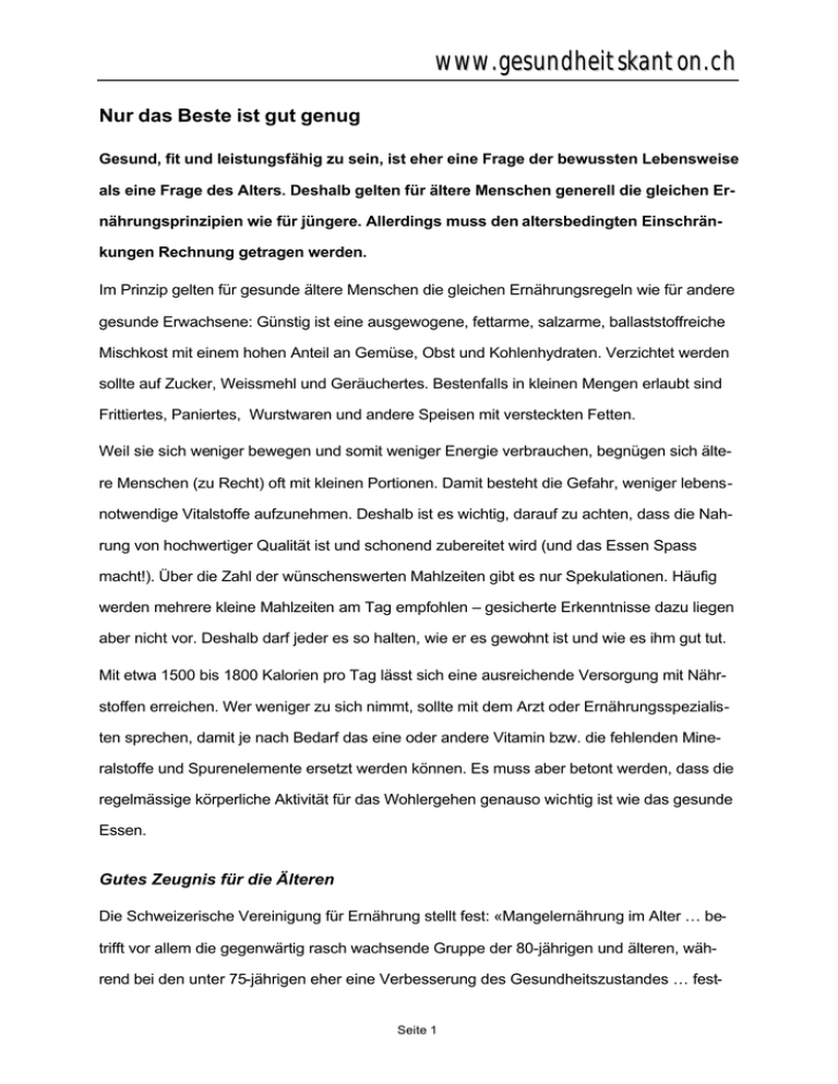 www.gesundheitskanton.ch Nur das Beste ist gut genug Gesund, fit und leistungsfähig zu sein, ist eher eine Frage der bewussten Lebensweise als eine Frage des Alters. Deshalb gelten für ältere Menschen generell die gleichen Ernährungsprinzipien wie für jüngere. Allerdings muss den altersbedingten Einschränkungen Rechnung getragen werden. Im Prinzip gelten für gesunde ältere Menschen die gleichen Ernährungsregeln wie für andere gesunde Erwachsene: Günstig ist eine ausgewogene, fettarme, salzarme, ballaststoffreiche Mischkost mit einem hohen Anteil an Gemüse, Obst und Kohlenhydraten. Verzichtet werden sollte auf Zucker, Weissmehl und Geräuchertes. Bestenfalls in kleinen Mengen erlaubt sind Frittiertes, Paniertes, Wurstwaren und andere Speisen mit versteckten Fetten. Weil sie sich weniger bewegen und somit weniger Energie verbrauchen, begnügen sich ältere Menschen (zu Recht) oft mit kleinen Portionen. Damit besteht die Gefahr, weniger lebensnotwendige Vitalstoffe aufzunehmen. Deshalb ist es wichtig, darauf zu achten, dass die Nahrung von hochwertiger Qualität ist und schonend zubereitet wird (und das Essen Spass macht!). Über die Zahl der wünschenswerten Mahlzeiten gibt es nur Spekulationen. Häufig werden mehrere kleine Mahlzeiten am Tag empfohlen – gesicherte Erkenntnisse dazu liegen aber nicht vor. Deshalb darf jeder es so halten, wie er es gewohnt ist und wie es ihm gut tut. Mit etwa 1500 bis 1800 Kalorien pro Tag lässt sich eine ausreichende Versorgung mit Nährstoffen erreichen. Wer weniger zu sich nimmt, sollte mit dem Arzt oder Ernährungsspezialisten sprechen, damit je nach Bedarf das eine oder andere Vitamin bzw. die fehlenden Mineralstoffe und Spurenelemente ersetzt werden können. Es muss aber betont werden, dass die regelmässige körperliche Aktivität für das Wohlergehen genauso wichtig ist wie das gesunde Essen. Gutes Zeugnis für die Älteren Die Schweizerische Vereinigung für Ernährung stellt fest: «Mangelernährung im Alter … betrifft vor allem die gegenwärtig rasch wachsende Gruppe der 80-jährigen und älteren, während bei den unter 75-jährigen eher eine Verbesserung des Gesundheitszustandes … fest- Seite 1 www.gesundheitskanton.ch zustellen ist. Diese Gruppe ernährt sich in ihrer grossen Mehrzahl ausreichend, trotz gewisser Erschwernisse wie z.B. Alleinleben oder bereits vorhandene Behinderungen.» Das Trinken nicht vergessen! Ein besonderes Problem stellt die Aufnahme von genügend Flüssigkeit dar – nicht nur weil das Durstgefühl nachlässt, sondern auch weil man Bedenken hat, nachts aufstehen zu müssen. Dringend empfohlen wird eine tägliche Flüssigkeitsmenge von mindestens eineinhalb Litern (Wasser, Tee, (Getreide-)Kaffee, Fruchtsäfte, Suppe, Kompott). Praktiker raten, schon morgens einen grossen Krug Tee oder eine Flasche Mineralwasser gut sichtbar bereitzustellen. Ältere Menschen mit starkem Durstgefühl und dementsprechend starker Urinausscheidung sollten beim Arzt abklären lassen, ob ein sogenannter Altersdiabetes (nicht-insulin-pflichtiger Diabetes) vorliegt oder nicht. Ursachen für eine mögliche Mangelernährung Verringerter Appetit und mangelndes Durstgefühl, vermindertes Geschmacks- und Geruchsempfinden, Kaubeschwerden, Krankheiten und damit verbundene (mehrfache) Medikamenteneinnahme, geistige und seelische Beeinträchtigungen wie Demenzen (geistiger Abbau durch Krankheiten) oder Depressionen können genauso die Ursache für Fehlernährung im Alter sein wie Bequemlichkeit («für mich allein lohnt sich die Kocherei gar nicht») oder finanzielle Einschränkungen. Fehlende Trainingsanreize durch mangelnde Bewegung und zu wenig Eiweiss im Essen lässt die Muskulatur schwinden. Durch Kraft- und Ausdauertraining können die Muskeln jedoch bis ins hohe Alter gekräftigt werden. Altersdiabetes, Übergewicht, Bluthochdruck und Verstopfung lassen sich auch bei betagten Personen durch eine gezielte Ernährungstherapie wesentlich verbessern. Seite 2 www.gesundheitskanton.ch Worauf beim Essen besonders geachtet werden sollte: Senioren, die sich wohl und gesund fühlen, sollten ihre Ernährungsgewohnheiten weitgehend beibehalten. Trotzdem sind die Übergänge zwischen ausreichender und mangelnder Zufuhr von lebenswichtigen Vitalstoffen fliessend. Vor allem die sich verlangsamenden Stoffwechselprozesse können auf Dauer zu Problemen führen. In diesem Zusammenhang ist besonders zu achten auf: Kalzium Wir haben schon oft betont, dass der Zustand der Knochen im Alter stark von einer ausreichenden Zufuhr von Kalzium und Vitamin D in jungen Jahren abhängt, doch kann man auch im Alter noch etwas tun. Zwar kann der altersabhängige Knochenabbau auch durch eine ausreichende Kalziumaufnahme nicht ganz verhindert werden, da er von verschiedenen anderen Faktoren wie Hormonhaushalt und Bewegung beeinflusst wird, doch trägt die ausreichende Versorgung mit Kalzium dazu bei, den Verlust an Knochenmasse möglichst klein zu halten. Bei Osteoporose ist die Behandlung eines Kalziummangels im Allgemeinen eine Langzeittherapie. Dabei muss auf die Erhaltung des Kalzium-Magnesium-Phosphor-Gleichgewichts geachtet werden. Da Phosphor in unserer Nahrung eher in zu grossen Mengen vorkommt, sollte das Kalzium stets zusammen mit Magnesium in einem Verhältnis von etwa 3 : 1 gegeben werden. Die Schweiz. Vereinigung für Ernährung hat die jüngsten Empfehlungen aus USA übernommen: Tagesbedarf für Erwachsene zwischen 30 und 50: 1000 mg/pro Tag; ab dem 50. Altersjahr ebenfalls 1000 mg/Tag. Bei Kalziummangel kann es ausserdem zu einer Störung der Blutgerinnung, zu Muskelkrämpfen, zu einer erhöhten Erregbarkeit des Nervensystems, zu schlechten Zähnen und zu Zahnfleischentzündungen kommen. Kalzium ist vor allem enthalten in Käse (fettarmem Tilsiter), Ölsardinen, Sojabohnen, Grünkohl, fettarmem Naturjogurt, Fenchel, Brokkoli, Lauch, Hülsenfrüchten, Vollkornbrot und kalziumreichen Mineralwässern. Vitamin D Unentbehrlich für die Aufnahme von Kalzi
