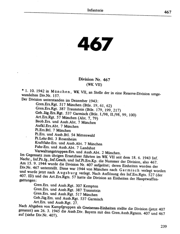 Infanterie 467 467 Division Nr. 467 (WK VII) * 1. 10. 1942 in München, WK VII, an Stelle der in eine Reserve-Division umgewandelten Div.Nr. 157. Der Division unterstanden im Dezember 1943: Gren.Ers.Rgt. 517 München (Btle. 19, 61, 62) Gren.Ers.Rgt. 387 Traunstein (Btle. 179, 199, 217) Geb.Jäg.Ers.Rgt. 537 Garmisch (Btle. I./98, II./98, 99, 100) Art.Ers.Rgt. 57 München (Abt. 7, 79) Beob.Ers. und Ausb.Abt. 7 München Aufkl.Ers.Abt. 7 München Pi.Ers.Btl. 7 München Pi.Ers. und Ausb.Btl. 54 Mittenwald Pi.Lehr-Btl. 3 Rosenheim Kraftfahr-Ers. und Ausb.Abt. 7 München Fahr-Ers. und Ausb.Abt. 7 Landshut Verwaltungstruppen-Ers. und Ausb.Abt. 2 München. Im Gegensatz zum übrigen Ersatzheer führten im WK VII seit dem 18. 6. 1943 Inf. Nachr., Inf.Pz.Jg., Inf.Gesch. und Inf.Pi.Ers.Kp. die Nummer der Division, also 467. Am 15. 9. 1944 wurde die Division Nr. 407 aufgelöst; deren Einheiten wurden der Div.Nr. 467 unterstellt. Diese war 1944 von München nach Garmisch verlegt worden und wurde jetzt nach Augsburg verlegt. Nach Auflösung des Inf.Ers.Rgts. 527 (der 407. ID) und des Art.Ers.Rgts. 57 hatte die Division an Einheiten der Hauptwaffengattungen: Gren.Ers. und Ausb.Rgt. 307 Kempten Gren.Ers. und Ausb.Rgt. 387 Traunstein Gren.Ers. und Ausb.Rgt. 517 München Geb.Jäg.Ers. und Ausb.Rgt. 537 Garmisch Art.Ers. und Ausb.Rgt. 27. Nach Abgaben von Kampfgruppen als Gneisenau-Einheiten stellte die Division (jetzt 407 genannt) am 26. 3. 1945 die Ausb.Div. Bayern mit den Gren.Ausb.Rgtern. 407 und 467 auf (siehe Div.Nr. 407). 239 467 Infanterie — Nachrichten Infanterie-Rgt. 467 * 26. 8. 1939 (4. Welle) im WK XI aus den Ergänzungs-Btlen. E/IR 33 Zerbst, I. E/IR 12 Blankenburg und II. E/IR 12 Halberstadt; Stab und das III. Btl. wurden 26. 11. 1940 als Stab und I. Btl./Inf.Rgt. 588 der 321. Div. (13. Welle) abgegeben und ersetzt; das III. Btl. wurde 1. 5. 1942 aufgelöst und durch das III./Gren.Rgt. 497 wieder gebildet; Grenadier-Rgt. 467 seit 15. 10. 1942; gab März 1944 das III. Btl. zur Wiederaufstellung des Gren.Rgts. 497 ab; Juni 1944 bei der Hgr. Mitte (Minsk) vernichtet. G: 1939 I. 1-4, II. 5-8, III. 9-12, 13, 14 1944 I. 1-4, II. 5-8, 13, 14 U: 267. Inf.Div.: Westen (Eifel), 1940 Belgien, Frankreich, 1941/44 Mittelrußland (Moskau, Juchnow, Mogilew) E: 467 Blankenburg/Harz, WK XI Infanterie-Ers.Btl. 467 * 26. 8. 1939 in Blankenburg/Harz, WK XI; 1. 10. 1942 geteilt in En. und Res.Btl.; Grenadier-Ers.Btl. 467 seit 7. 11. 1942; 25 . 3. 1945 als Gren.Ausb.Btl. 467 (aus S t e n d a l ) mobü mit Fp.Nummer (Ostgoten-Bewegung). U: Div. 191; 1. 10. 1942 Div. 471 Ersatztruppe für die 267. Inf.Div. (4. Welle) Res.Infanterie-Btl. 467 * 1. 10. 1942 in Blankenburg, WK XI, aus dem Inf.Ers.Btl. 467 und nach Frankreich verlegt; Res.Grenadier-Btl. 467 seit 7. 11. 1942; Einsatz bei Boulogne; 1. 2. 1944 umgebildet zum I./Gren. Rgt. 150 der 49. Inf.Div. U: 191. Res.Division A-Grenadier-Rgt. 467 * 26. 3. 1945 aus Ausbildungs- und Alarmeinheiten der Div.Nr. 467 (München); Stab, II., III. aus Landshut, I. aus München. G: I. 1-3, II. 4-6, III. 7-9, Pi.Kp., gem.A-Bttr. Artillerie-Kommandeur 467 * 23. 10. 1944 bei Auffrischung des (in Nordfrankreich eingesetzt gewesenen) Korps aus dem bodenständigen Arko 502 (Nordfrankreich). U: LXVII. Armeekorps: Nordeifel (15. Armee; 5. Pz.Armee) Korps-Nachrichten-Abt. 467 * 10. 10. 1940 in Norwegen durch Umbenennung der am 10. 6. errichteten Korps-Nachr.Abt. 447 (3 Kpn.); wurde 16. 2. 1942 I./Armee-Nachr. Rgt. 550 in Finnland; die 2. Kp. wurde 6./Nachr.Abt. 635. U: Gruppe XXI, später AOK Norwegen in Norwegen und Finnland E: 16 Munster, WK VI Korps-Nachrichten-Abt. 467 * März 1944 in Frankreich durch Umbenennung der Korps-Nachr.Abt. 1067 mit 3 Kpn. U: LXVII. Armeekorps: Belgien, Niederlande, Eifel E: 13 Hannover, WK XI 240 467 Sicherung; Luftwaffe Landesschtttzen-Btl. 467 * 1. 4. 1940 im WK VI durch Umbenennung des Ldschtz. Btls. XVII./VImit den Kpn. 65.-68./VI (* 26. 8. 1939 in Dortmund); wurde 15. 2. 1943 IV./Sich.Rgt. 193 (Alencon) in Caen mit 10.-12. und 14. Kp. U: Mil.Verw.Bez. A Nordwestfrankreich; Jan. 1943 in St. L6 E: 6 Lüdenscheid, WK VI Res.Flak-Abt. 467 * Sommer 1941 im Luftgau VI aus Stab/Res.Flak-Abt. 650 (* Düsseldorf), den Res.Fest.Flak-Bttrn. 1., 4. und 5./343 (* Neustadt) und den leichten Res. Flak-Bttrn. 2./VI und 3./VI zu 5 Bttrn.; gab Sommer 1942 die beiden leichten Bttrn. als 2. und 3./849 ab und wurde schwere Flak-Abt. 467 zu 4 Bttrn. in Norwegen; gem.Flak-Abt. 467 (v) seit Sommer 1943 nach Verstärkung um 2 leichte Bttrn. (5. aus 4./849); Febr. 1945 in Tromsö (29. Flak-Div., Rgt. 83); die Bttrn. waren teilweise den Abt. 171, 203 und 352 unterstellt (Luftgaupostamt III). 241