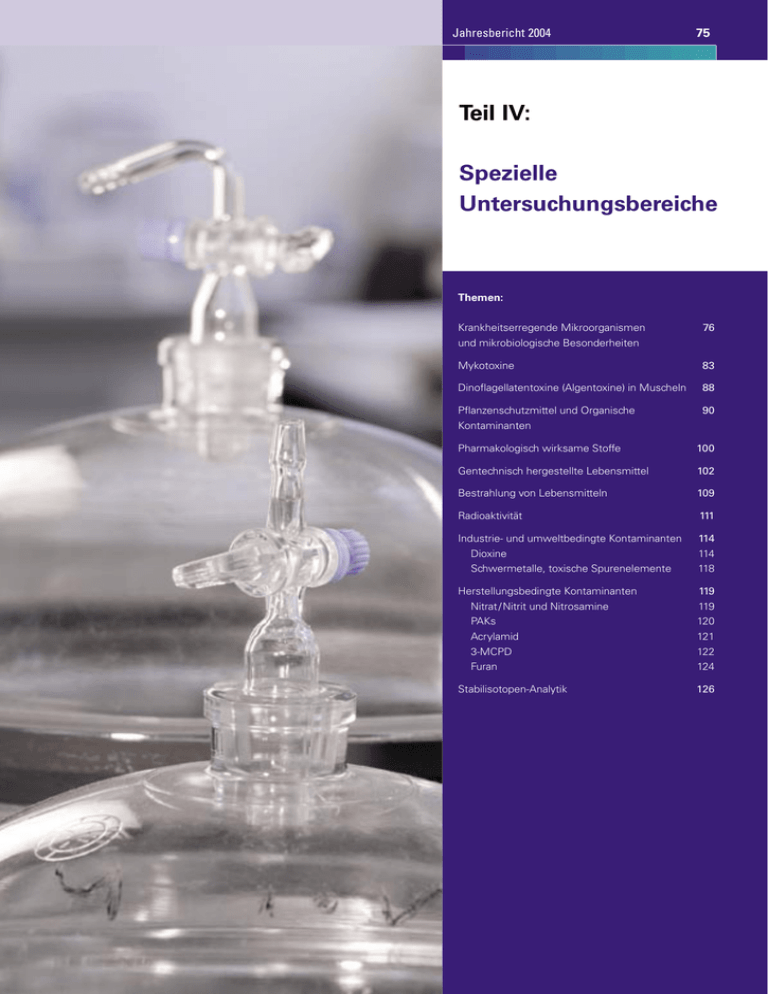 Jahresbericht 2004 75 Teil IV: Spezielle Untersuchungsbereiche Themen: Krankheitserregende Mikroorganismen 76 und mikrobiologische Besonderheiten Mykotoxine 83 Dinoflagellatentoxine (Algentoxine) in Muscheln 88 Pflanzenschutzmittel und Organische 90 Kontaminanten Pharmakologisch wirksame Stoffe 100 Gentechnisch hergestellte Lebensmittel 102 Bestrahlung von Lebensmitteln 109 Radioaktivität 111 Industrie- und umweltbedingte Kontaminanten 114 Dioxine 114 Schwermetalle, toxische Spurenelemente 118 Herstellungsbedingte Kontaminanten 119 Nitrat / Nitrit und Nitrosamine 119 PAKs 120 Acrylamid 121 3-MCPD 122 Furan 124 Stabilisotopen-Analytik 126 76 Lebensmittelüberwachung BW Teil IV: Spezielle Untersuchungsbereiche Krankheitserregende Mikroorganismen und mikrobiologische Besonderheiten Salmonellen Histamin Im Jahr 2004 wurden in den Chemischen und Veterinärun- Bacillus cereus tersuchungsämtern in Baden-Württemberg 20 958 Proben mikrobiologisch untersucht. Die mikrobiologischen Unter- Staphylococcus aureus suchungen haben den qualitativen und quantitativen Nachweis von verderbniserregenden Keimen, von Indikatorkei- Listeria monocytogenes men für mangelnde Hygiene und von Keimen, die eine Lebensmittel-Infektion oder -Intoxikation auslösen können, Noroviren (pathogene Keime), zum Ziel. Aufgrund der Untersuchungen wurden 9 % der Planproben und 25 % der Anlassproben beanstandet. 1147 Proben (5,5 %) waren aufgrund des grobsinnlichen und mikrobiologischen Untersuchungsbefundes „nicht mehr zum menschlichen Verzehr geeignet“ oder „im Genusswert gemindert“. Lebensmittelbedingte Erkrankungsfälle und potenziell gesundheitsschädliche Lebensmittel Insgesamt wurden 394 Erkrankungsfälle mit insgesamt 53 8 1 881 Lebensmittelproben bearbeitet. Bei einem Erkran- 3 kungsfall können von einer Person bis zu über 100 Perso- 3 2 1 nen erkrankt sein. Als potentiell gesundheitsschädlich aufgrund der mikrobiologischen Untersuchungen wurden insgesamt 70 Proben beurteilt. Dabei handelte es sich in 46 Fällen um sogenannte Anlassproben (Erkrankungs-, Beschwerde- oder Krankheitserreger Verdachtsproben). In 24 Fällen waren im Rahmen der risikoorientierten Probenplanung entnommene Proben (sogenannte Planproben) betroffen. Graphik: Die nachfolgende Graphik stellt dar, welche Erreger bzw. To- Anzahl der als gesundheitsgefährdend xine aus diesen Lebensmitteln isoliert werden konnten. beurteilten Proben Krankheitserregende Mikroorganismen … Jahresbericht 2004 77 Salmonellen-Untersuchung: Weniger Salmonellen im Geflügelfleisch Eine Lebensmittelvergiftung durch Salmonellen führt in der Regel 53 Lebensmittel wurden im Zusam- 12 bis 36 Stunden nach dem Verzehr des Lebensmittels zu Symptomen menhang mit dem Nachweis von wie Kopfschmerz, Unwohlsein, Erbrechen, Leibschmerzen, Fieber bis Salmonellen nach § 8 LMBG als ge- ca. 38 °C und Durchfälle. Die Schwere der Erkrankung ist bei Kleinkin- eignet, die Gesundheit zu schädigen, dern und alten Menschen am ausgeprägtesten. beurteilt. Dabei handelte es sich in der Regel Von 10 891 Untersuchungen auf Salmonellen verliefen um verzehrsfertige Lebensmittel, bei denen eine Salmo- 113 (1 %) positiv. Naturgemäß wurden aus rohem Geflü- nellenabtötung vor dem Verzehr (z. B. durch Erhitzung des gelfleisch am häufigsten, und zwar in 42 Fällen (9 %) Sal- Lebensmittels) nicht mehr mit Sicherheit erfolgt. monellen nachgewiesen. Dies ist gegenüber dem Vorjahr (17,6 %) ein deutlicher Rückgang. Ob sich dieser Trend im laufenden Jahr fortsetzt, bleibt abzuwarten. Geflügelfleisch Salmonellen positiv 2001 Salmonellen positiv 2002 Salmonellen positiv 2003 Salmonellen positiv 2004 15,5 % 14,7 % 17,6 % 9,1 % Tabelle: Anteil von rohen Geflügelfleischproben mit positiven Salmonel- Salmonellen in rohem Hackfleisch In mehreren voneinander unabhän- Salmonellen in einer Krankenhausküche Salmonellen in einer Fischpastete Einen Tag nach einem gemeinsamen gigen Fällen wurden Salmonellen in In der kardiologischen Station eines Essen in einem Restaurant traten bei rohem Hackfleisch nachgewiesen. Krankenhauses traten innerhalb we- allen 12 Personen Bauchschmerzen Oft handelte es sich um Hackfleisch niger Tage bei 3 Patienten heftige und heftige Durchfälle, teilweise in Fertigpackungen, die unter an- Durchfallerkrankungen auf. Im Stuhl auch Fieber auf. Daraufhin wurden derem mit dem Aufdruck „Vor dem der Patienten konnte in allen Fällen vom Wirtschaftskontrolldienst Rest- Verzehr durcherhitzen“ gekennzeich- Salmonella Braenderup nachgewie- bestände der verzehrten Speisen zur net waren. sen werden. Bei weiteren Patienten Untersuchung eingeschickt. Neben Nach allgemeiner Verkehrsauffas- und beim Krankenhauspersonal traten Muscheln und Räucherlachs gelangte sung, festgehalten in den Leitsätzen keine Krankheitserscheinungen auf, so auch eine Fischpastete zur Unter- für Fleisch und Fleischerzeugnisse, die Untersuchung ihrer Stuhlproben suchung. In letztgenannter Probe war, ist Hackfleisch vielfach zum Rohver- verlief negativ. wie in den Stuhlproben der Erkrank- zehr bestimmt. Auch bei Kenntlich- Zur Ermittlung der Salmonellenher- ten, Salmonella Enteritidis nachweis- machung der Zweckbestimmung kunft wurden alle Rückstellproben bar. Somit konnten die Erkrankungen durch das Anbringen von Hinweisen der Stationsküche der vergangenen eindeutig auf den Verzehr der Fisch- wie „Vor dem Verzehr gut durcher- 8 Tage zur mikrobiologischen Unter- pastete zurückgeführt werden. hitzen“ oder „Nicht zum Rohverzehr suchung eingeschickt, insgesamt bestimmt“ ist es nach hiesiger Auffas- 207 Proben. Alle Proben wurden unter sung vorhersehbar, dass Hackfleisch anderem auf Salmonellen untersucht. im Rahmen der verkehrsüblichen Tatsächlich konnten Salmonellen vom Verwendung von den Verbrauchern gleichen Typ, wie er aus dem Patien- auch roh verzehrt wird, z. B. in Form tenstuhl isoliert worden war (S. Braen- von Mettbrötchen. Deshalb ist mit derup), aus 2 Rückstellproben isoliert Salmon