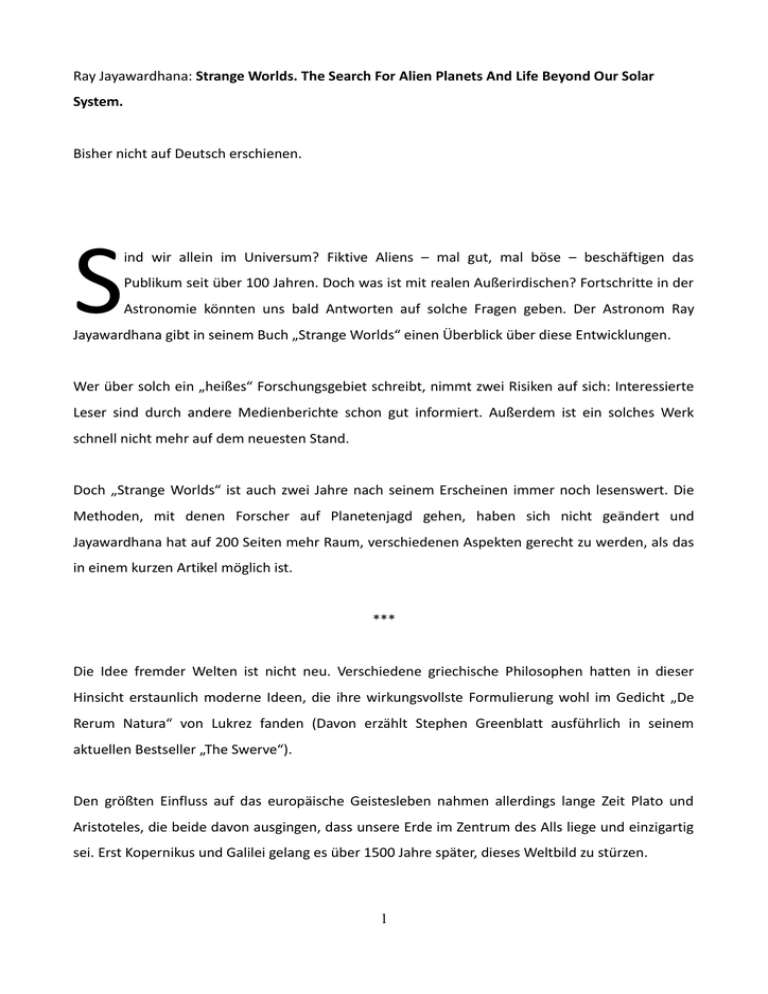 Ray Jayawardhana: Strange Worlds. The Search For Alien Planets And Life Beyond Our Solar System. Bisher nicht auf Deutsch erschienen. S ind wir allein im Universum? Fiktive Aliens – mal gut, mal böse – beschäftigen das Publikum seit über 100 Jahren. Doch was ist mit realen Außerirdischen? Fortschritte in der Astronomie könnten uns bald Antworten auf solche Fragen geben. Der Astronom Ray Jayawardhana gibt in seinem Buch „Strange Worlds“ einen Überblick über diese Entwicklungen. Wer über solch ein „heißes“ Forschungsgebiet schreibt, nimmt zwei Risiken auf sich: Interessierte Leser sind durch andere Medienberichte schon gut informiert. Außerdem ist ein solches Werk schnell nicht mehr auf dem neuesten Stand. Doch „Strange Worlds“ ist auch zwei Jahre nach seinem Erscheinen immer noch lesenswert. Die Methoden, mit denen Forscher auf Planetenjagd gehen, haben sich nicht geändert und Jayawardhana hat auf 200 Seiten mehr Raum, verschiedenen Aspekten gerecht zu werden, als das in einem kurzen Artikel möglich ist. *** Die Idee fremder Welten ist nicht neu. Verschiedene griechische Philosophen hatten in dieser Hinsicht erstaunlich moderne Ideen, die ihre wirkungsvollste Formulierung wohl im Gedicht „De Rerum Natura“ von Lukrez fanden (Davon erzählt Stephen Greenblatt ausführlich in seinem aktuellen Bestseller „The Swerve“). Den größten Einfluss auf das europäische Geistesleben nahmen allerdings lange Zeit Plato und Aristoteles, die beide davon ausgingen, dass unsere Erde im Zentrum des Alls liege und einzigartig sei. Erst Kopernikus und Galilei gelang es über 1500 Jahre später, dieses Weltbild zu stürzen. 1 Nachdem die Menschen mithilfe von Teleskopen ein besseres Bild des Sonnensystems gewonnen hatten, stellte sich die Frage nach dessen Ursprung. Kein Geringerer als Immanuel Kant schlug 1755 eine Theorie vor, welche dies erklären sollte. Er ging davon aus, dass eine Gaswolke sich zu mehreren Klumpen verdichtet habe, aus denen sich dann die Sonne und alle Planeten geformt hätten. Nach verschiedenen anderen Vorschlägen kehrten Astronomen nach dem Zweiten Weltkrieg im Wesentlichen zu diesem Modell Kants zurück. Aufnahmen des Hubble-Weltraumteleskops zeigten Baby-Sterne, die von Staub-Scheiben umgeben sind, aus denen später zusätzliche Himmelskörper geformt werden können. Ray Jayawardhana selbst gelang es mit einem Teleskop in Chile von der Erde aus ein Bild von einer solchen Staubscheibe um einen Stern zu machen. Aus dem Staub formen sich Planeten über einen Zeitraum von rund 10 Millionen Jahren hinweg. Bis ein Sonnensystem seine endgültige Form erreicht hat, dauert es vielleicht noch einmal mehrere hundert Millionen Jahre dauern. In der chaotischen Anfangszeit kann es zu dramatischen Ereignissen kommen. Unsere Erde kollidierte beispielsweise mit einem anderen Planeten von der Größe des Mars (Bislang weiß niemand, welcher Planet genau dies war). Dies führte dazu, dass Teile der Erde herausgeschlagen wurden, aus denen der Mond formte. Um diese Geschehnisse besser zu verstehen, wäre es natürlich hilfreich, die entsprechenden Vorgänge in anderen Sonnensystemen untersuchen zu können. Dazu mussten aber erst einmal Planeten gefunden werden, die nicht um unseren Heimatstern kreisen. Der Weg dahin war steinig. Wiederholt wurde falscher Alarm gegeben; vermeintliche Entdeckungen stellten sich als Messfehler heraus. Um einen Planeten erkennen zu können, müssen die Instrumente extrem empfindlich sein. Nicht nur sind Planeten viel kleiner als die Sterne in ihrer Nähe, sie geben auch nur einen Bruchteil an Strahlung ab. Erst 1991 hatten drei Astronomen Erfolg. Mithilfe eines Radio-Teleskops bei Manchester entdeckten sie einen Planeten, der einen Pulsar umkreist. 1 Ein solcher Pulsar besteht aus Neutronen und sendet, während er sich dreht, ständig einen Strahl von Strahlung ins All – ähnlich 1 Konkret handelte es sich um den Stern mit dem einprägsamen Namen PSR B1829-10. 2 wie es ein Leuchtturm mit sichtbarem Licht tut. Diese Entdeckung machte aus der Planetenjagd eine legitime Beschäftigung, doch erfüllte sie die Wünsche der Astronomen nur begrenzt. Von derart exotischen Stern-Systemen lässt sich nur wenig von dem lernen, was uns interessiert. Erst 1995 gelang es Astronomen, einen „Himmelswanderer“ zu finden, der einen normalen Stern wie unsere Sonne umkreist. Sechs weitere dieser Entdeckungen folgten noch im selben Jahr. Damit war der Durchbruch geschafft. Um die Planeten nachzuweisen, nutzten die Forscher den Doppler-Effekt, den wir im Alltag an Schallwellen beobachten können. Der Ton des Martinshorn klingt höher, wenn der Krankenwagen auf uns zufährt, und tiefer, wenn er sich entfernt. Derselbe Effekt kann bei Lichtwellen entstehen, wenn sich die Quelle des Lichts relativ zum Beobachter bewegt. Sterne eiern ein wenig, wenn etwas an ihnen zieht. Für diese Ziehen sind neben Sternen auch Planeten verantwortlich, die Gravitationskraft ausüben. Die resultierenden Bewegungen lassen sich mithilfe des Doppler-Effekts nachweisen. Dazu messen die Astronomen das „Spektrum“ eines Sterns. Dieses Spektrum enthält charakteristische Linien – Fraunhofer-Linien –, deren Lage sich berechnen lässt. Wenn die Linie etwas von der erwarteten Position abweicht, können die Forscher daraus auf die Präsenz anderer Himmelskörper schließen. Eine andere Möglichkeit, Planeten nachzuweisen, nutzt Einsteins Allgemeine Relativitätstheorie: Diesen Gleichungen zufolge krümmen Massen den Raum und lenken so auch Lichtteilchen, die sich durch diesen Raum bewegen, ein wenig ab. So können ganze Galaxien, aber auch einzelne Sterne als „Linsen“ wirken. Im letzteren Fall spricht man wegen der kleineren Wirkung von „Microlensing“. Hier machen sich Planeten in der Nähe eines Sterns bemerkbar, indem sie die Linsenwirkung dieses Sterns leicht verändern. Dieses Technik hat den Vorteil, dass sich mit ihr auch sehr kleine, leichte Planeten nachweisen la