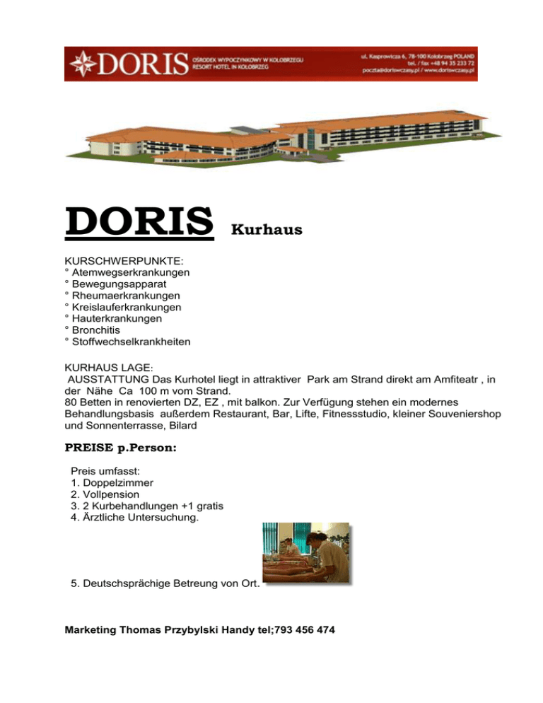 DORIS Kurhaus KURSCHWERPUNKTE: ° Atemwegserkrankungen ° Bewegungsapparat ° Rheumaerkrankungen ° Kreislauferkrankungen ° Hauterkrankungen ° Bronchitis ° Stoffwechselkrankheiten KURHAUS LAGE: AUSSTATTUNG Das Kurhotel liegt in attraktiver Park am Strand direkt am Amfiteatr , in der Nähe Ca 100 m vom Strand. 80 Betten in renovierten DZ, EZ , mit balkon. Zur Verfügung stehen ein modernes Behandlungsbasis außerdem Restaurant, Bar, Lifte, Fitnessstudio, kleiner Souveniershop und Sonnenterrasse, Bilard PREISE p.Person: Preis umfasst: 1. Doppelzimmer 2. Vollpension 3. 2 Kurbehandlungen +1 gratis 4. Ärztliche Untersuchung. 5. Deutschsprächige Betreung von Ort. Marketing Thomas Przybylski Handy tel;793 456 474 PREISLISTE 2009 03.01 - 10.01.09 10.01 - 17.01.09 17.01 - 24.01.09 24.01 - 31.01.09 31.01 - 07.02.09 07.02 - 14.02.09 14.02 - 21.02.09 21.02 - 28.02.09 28.02 - 07.03.09 07.03 - 14.03.09 14.03 - 21.03.09 21.03 - 28.03.09 28.03 - 04.04.09 04.04 - 11.04.09 11.04 - 18.04.09 18.04 - 25.04.09 25.04 - 02.05.09 02.05 - 09.05.09 09.05 - 16.05.09 16.05 - 23.05.09 23.05 - 30.05.09 30.05 - 06.06.09 06.06 - 13.06.09 13.06 - 20.06.09 20.06 - 27.06.09 27.06 - 04.07.09 04.07 - 11.07.09 11.07 - 18.07.09 18.07 - 25.07.09 25.07 - 01.08.09 01.08 - 08.08.09 08.08 - 15.08.09 15.08 - 22.08.09 22.08 - 29.08.09 29.08 - 05.09.09 05.09 - 12.09.09 12.09 - 19.09.09 19.09 - 26.09.09 26.09 - 03.10.09 03.10 - 10.10.09 10.10 - 17.10.09 17.10 - 24.10.09 24.10 - 31.10.09 31.10 - 07.11.09 07.11 - 14.11.09 14.11 - 21.11.09 21.11 - 28.11.09 28.11 - 05.12.09 05.12 - 12.12.09 12.12 - 19.12.09 1 Tages im zł 1 Tages im euro 85,00 25 85,00 25 85,00 25 85,00 25 85,00 25 85,00 25 85,00 25 85,00 25 85,00 25 85,00 25 85,00 25 120,00 28 120,00 28 120,00 28 120,00 30 120,00 30 120,00 33 120,00 33 120,00 36 128,00 36 128,00 38 128,00 38 128,00 38 128,00 38 128,00 38 128,00 38 137,00 41 137,00 41 137,00 41 137,00 41 137,00 41 137,00 41 137,00 41 137,00 41 128,00 38 128,00 38 120,00 38 120,00 38 120,00 36 100,00 36 100,00 36 100,00 36 100,00 30 100,00 30 80,00 25 80,00 25 80,00 25 80,00 25 80,00 25 80,00 25 7Tage im euro 175 175 175 175 175 175 175 175 175 175 175 196 196 196 210 210 231 231 252 252 266 266 266 266 266 266 270 270 270 270 270 270 270 270 266 266 266 266 252 252 252 252 210 210 175 175 175 175 175 175 ZABIEGI BEHANDLUNG okłady borowinowe,moorpackung +okłady fango,/fangopackung +masaż klasyczny,/massage +masaż polinezyjski,/massage +hydromasaż,/wassermassage hydromasaż +solankowy,/wassermassage mit saltz hydromasaż +borowinowy,/wassermassage mit moor inhalacja +zwykła/inhalcjonen ibursztynowa, +solux lampa,/rotlischtlampe +diadynamik, +interdyn, +jonoforeza, +Galwanizacja, +Ultradźwięki/ultraschall + OSTERN WEIHNACHTEN SYLWESTER 7 TAGE URLAUB MIT KUR 14 TAGE URLAUB MIT KUR 21 TAGE URLAUB MIT KUR INDIWIDUEL GASTE MIT KUR ODER OHNE KUR
