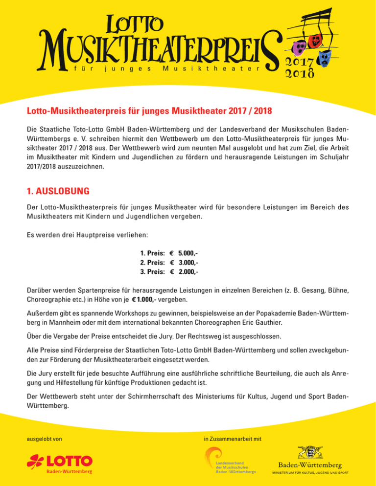 f ü r j u n g e s M u s i k t h e a t e r 2017 2018 Lotto-Musiktheaterpreis für junges Musiktheater 2017 / 2018 Die Staatliche Toto-Lotto GmbH Baden-Württemberg und der Landesverband der Musikschulen BadenWürttembergs e. V. schreiben hiermit den Wettbewerb um den Lotto-Musiktheaterpreis für junges Musiktheater 2017 / 2018 aus. Der Wettbewerb wird zum neunten Mal ausgelobt und hat zum Ziel, die Arbeit im Musiktheater mit Kindern und Jugendlichen zu fördern und herausragende Leistungen im Schuljahr 2017/2018 auszuzeichnen. 1. AUSLOBUNG Der Lotto-Musiktheaterpreis für junges Musiktheater wird für besondere Leistungen im Bereich des Musiktheaters mit Kindern und Jugendlichen vergeben. Es werden drei Hauptpreise verliehen: 1. Preis: € 5.000,2. Preis: € 3.000,3. Preis: € 2.000,Darüber werden Spartenpreise für herausragende Leistungen in einzelnen Bereichen (z. B. Gesang, Bühne, Choreographie etc.) in Höhe von je € 1.000,- vergeben. Außerdem gibt es spannende Workshops zu gewinnen, beispielsweise an der Popakademie Baden-Württemberg in Mannheim oder mit dem international bekannten Choreographen Eric Gauthier. Über die Vergabe der Preise entscheidet die Jury. Der Rechtsweg ist ausgeschlossen. Alle Preise sind Förderpreise der Staatlichen Toto-Lotto GmbH Baden-Württemberg und sollen zweckgebunden zur Förderung der Musiktheaterarbeit eingesetzt werden. Die Jury erstellt für jede besuchte Aufführung eine ausführliche schriftliche Beurteilung, die auch als Anregung und Hilfestellung für künftige Produktionen gedacht ist. Der Wettbewerb steht unter der Schirmherrschaft des Ministeriums für Kultus, Jugend und Sport BadenWürttemberg. ausgelobt von in Zusammenarbeit mit 1 f ü r j u n g e s 2017 2018 M u s i k t h e a t e r 2. TEILNAHMEBEDINGUNGEN Teilnahmeberechtigt sind alle Musikschulen, Schulen, Vereine, kirchlichen Einrichtungen sowie nicht-professionelle Gruppierungen und Einrichtungen in freier Trägerschaft in Baden-Württemberg. Kooperationen zwischen mehreren Einrichtungen werden ausdrücklich begrüßt. Die Teilnahme ist kostenfrei. 2.1 Anforderungen an die aufgeführten Stücke Die Inszenierung sollte vielfältige Aspekte des Musiktheaters vereinen: Instrumentalmusik - Gesang Schauspiel - Tanz. Bewerben können sich folgende Arten von Musiktheaterproduktionen: • Oper, Operette • Musical, Singspiel • Sprechtheaterstücke mit tragender dramaturgischer Funktion von Musik • Musiktheaterwerke experimentellen Charakters (auch mit improvisatorischen Elementen) • sowie weitere Produktionen, die dem Grundgedanken des Wettbewerbs entsprechen. Die Aufführungsdauer soll mindestens 45 Minuten betragen. Es dürfen keine Klavierreduktionen oder Playbacks als Orchester- oder Bandersatz verwendet werden. Playbacks sind in angemessenem Umfang nur zulässig, wenn sie eine dramaturgische oder künstlerische Funktion haben. Der Veranstalter muss die Aufführungsrechte erworben haben. 2.2 Wettbewerbsphasen und Bewerbungsfristen Der Wettbewerb besteht aus zwei Wettbewerbsphasen und dementsprechend aus zwei Zeiträumen, in denen eine Bewerbung um die Teilnahme an dem Wettbewerb möglich ist: Bewerbungszeitraum 1: Aufführungsphase 1: 24. April 2017 bis 7. Juli 2017 11. September 2017 bis 28. Februar 2018 Bewerbungszeitraum 2: Aufführungsphase 2: 11. September 2017 bis 31. Dezember 2017 1. März 2018 bis 25. Juli 2018 Wichtig: Die konkreten Aufführungstermine müssen zum jeweiligen Bewerbungsschluss vorliegen! 2 f ü r j u n g e s 2017 2018 M u s i k t h e a t e r 2.3 Teilnahmebedingungen in der Aufführungsphase Für die nominierten Produktionen gelten nachfolgende weitere Teilnahmebedingungen: 1. Aufnahme des Wettbewerbstitels und des Wettbewerbslogos in allen Werbemitteln und Veröffentlichungen in der folgenden Formulierung: Nominiert für den Lotto-Musiktheaterpreis 2017/2018. 2. Die Jury besucht eine von ihr ausgewählte Vorstellung der Produktion. Sie kündigt ihren Besuch entsprechend an. Dafür sind Plätze in der ersten bzw. oberen Kategorie bereitzustellen. 3. Die Jury bewertet die Arbeit in den unter Punkt 3.2 angeführten Bereichen. 4. Die Teilnehmer des Wettbewerbs erstellen für den Wettbewerb einen DVD-Mitschnitt der von der Jury besuchten Aufführung. 3. ALLGEMEINE BEMERKUNGEN ZUR DURCHFÜHRUNG 3.1 Auswahlverfahren und Nominierung Aus allen Bewerbungen werden jeweils nach Ende der Bewerbungsfrist insgesamt etwa 15 Produktionen von der Jury ausgewählt und für den Lotto-Musiktheaterpreis nominiert. Die ausgewählten Stücke werden von der Jury bei einer Aufführung vor Ort besucht. Für diese Vorauswahl sind neben dem vollständig ausgefüllten Bewerbungsformular die im Formular aufgeführten Unterlagen einzureichen. Unrichtige Angaben bei der Bewerbung können zum Ausschluss vom Wettbewerb führen. Die Unterlagen senden Sie bitte an: Landesverband der Musikschulen Baden Württembergs e. V. Lotto-Musiktheaterpreis 2017/2018 Herdweg 14 70174 Stuttgart Besonders begrüßt werden bei der Nominierung folgende Aspekte: • Kinder- bzw. Jugenddarsteller(innen) vor Erwachsenen • Kooperation z. B. zwischen Musikschulen und allgemein bildenden Schulen • Eigenkompositionen • Erstproduktion vor Wiederaufnahme (innerhalb von drei Jahren) • Vielfältigkeit der Darstellungsformen • Angemessenheit der Stückauswahl • Ausführliche und aussagekräftige Bewerbung. Wichtig: Besetzungsliste, ggf. auch vorläufig! Nach der Entscheidung der Jury über die Nominierungen werden alle Teilnehmer zeitnah benachrichtigt und die Termine für die Jurybesuche bekanntgegeben. 3 f ü r j u n g e s 2017 2018 M u s i k t h e a t e r Die Jury setzt sich zusammen aus Vertreterinnen und Vertretern von Musikschulen und allgemein bildenden Schulen sowie Künstlerinnen und Künstlern aus den Sparten Musik, Schauspiel und Tanz. Mit der Nominierung verbunden ist ein kostenfreies halbtägiges Gruppencoaching in einer der künstlerischen Sparten des Musiktheaters (einschließlich Techn