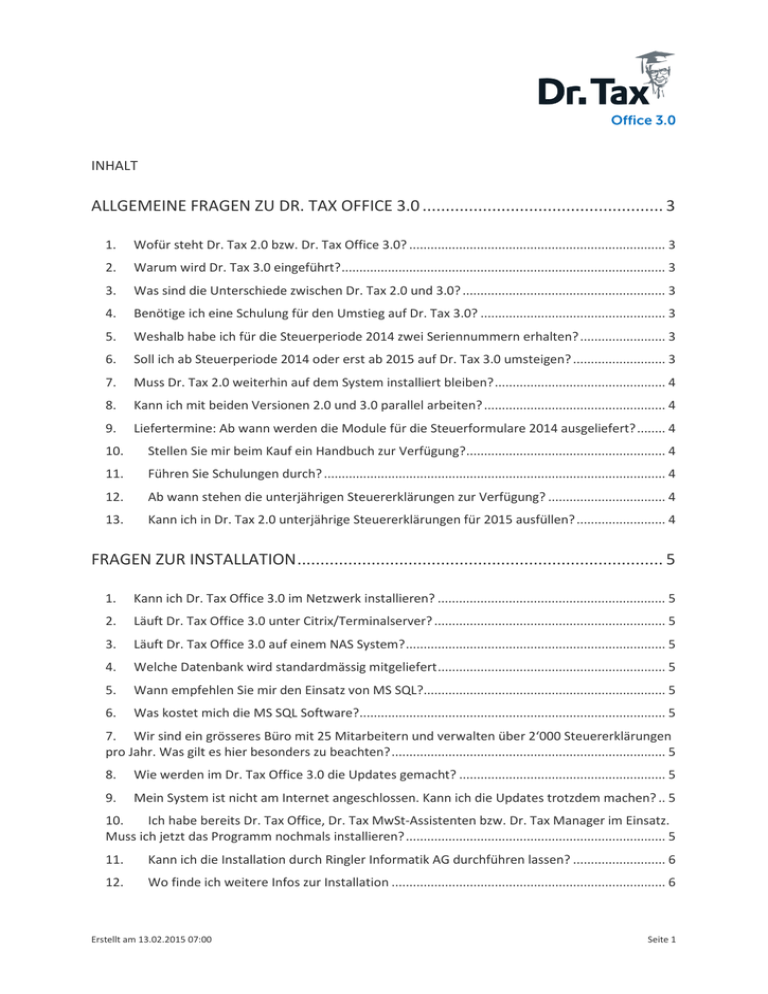 Office 3.0 INHALT ALLGEMEINE FRAGEN ZU DR. TAX OFFICE 3.0 .................................................... 3 1. Wofür steht Dr. Tax 2.0 bzw. Dr. Tax Office 3.0? ........................................................................ 3 2. Warum wird Dr. Tax 3.0 eingeführt? ........................................................................................... 3 3. Was sind die Unterschiede zwischen Dr. Tax 2.0 und 3.0? ......................................................... 3 4. Benötige ich eine Schulung für den Umstieg auf Dr. Tax 3.0? .................................................... 3 5. Weshalb habe ich für die Steuerperiode 2014 zwei Seriennummern erhalten? ........................ 3 6. Soll ich ab Steuerperiode 2014 oder erst ab 2015 auf Dr. Tax 3.0 umsteigen? .......................... 3 7. Muss Dr. Tax 2.0 weiterhin auf dem System installiert bleiben? ................................................ 4 8. Kann ich mit beiden Versionen 2.0 und 3.0 parallel arbeiten? ................................................... 4 9. Liefertermine: Ab wann werden die Module für die Steuerformulare 2014 ausgeliefert? ........ 4 10. Stellen Sie mir beim Kauf ein Handbuch zur Verfügung?........................................................ 4 11. Führen Sie Schulungen durch? ................................................................................................ 4 12. Ab wann stehen die unterjährigen Steuererklärungen zur Verfügung? ................................. 4 13. Kann ich in Dr. Tax 2.0 unterjährige Steuererklärungen für 2015 ausfüllen? ......................... 4 FRAGEN ZUR INSTALLATION ............................................................................... 5 1. Kann ich Dr. Tax Office 3.0 im Netzwerk installieren? ................................................................ 5 2. Läuft Dr. Tax Office 3.0 unter Citrix/Terminalserver? ................................................................. 5 3. Läuft Dr. Tax Office 3.0 auf einem NAS System? ......................................................................... 5 4. Welche Datenbank wird standardmässig mitgeliefert ................................................................ 5 5. Wann empfehlen Sie mir den Einsatz von MS SQL?.................................................................... 5 6. Was kostet mich die MS SQL Software?...................................................................................... 5 7. Wir sind ein grösseres Büro mit 25 Mitarbeitern und verwalten über 2‘000 Steuererklärungen pro Jahr. Was gilt es hier besonders zu beachten? ............................................................................. 5 8. Wie werden im Dr. Tax Office 3.0 die Updates gemacht? .......................................................... 5 9. Mein System ist nicht am Internet angeschlossen. Kann ich die Updates trotzdem machen? .. 5 10. Ich habe bereits Dr. Tax Office, Dr. Tax MwSt-Assistenten bzw. Dr. Tax Manager im Einsatz. Muss ich jetzt das Programm nochmals installieren? ......................................................................... 5 11. Kann ich die Installation durch Ringler Informatik AG durchführen lassen? .......................... 6 12. Wo finde ich weitere Infos zur Installation ............................................................................. 6 Erstellt am 13.02.2015 07:00 Seite 1 Office 3.0 FRAGEN ZUR MIGRATION................................................................................... 7 1. Wie wird die Migration von 2.0 auf 3.0 durchgeführt?............................................................... 7 2. Werden bei der Migration meine Daten in Dr. Tax 2.0 gelöscht?............................................... 7 3. Werden Änderungen die ich im 2.0 mache, auch automatisch im 3.0 angezeigt? ..................... 7 4. Kostet die Migration extra? ......................................................................................................... 7 5. Kann ich die Migration selbst ausführen? ................................................................................... 7 6. Welche Daten werden migriert? ................................................................................................. 7 7. Wie lange dauert die Migration? ................................................................................................ 7 8. Benötige ich Dr. Tax 2.0 nach der Migration auf 3.0 noch? ........................................................ 7 Erstellt am 13.02.2015 07:00 Seite 2 Office 3.0 Allgemeine Fragen zu Dr. Tax Office 3.0 1. Wofür steht Dr. Tax 2.0 bzw. Dr. Tax Office 3.0? Dr. Tax 2.0 beschreibt die bisherige Generation von Dr. Tax, welche unter Visual Basic entwickelt wurde und seit 1993 im Markt ist. Dr. Tax Office 3.0 ist die neue Generation von Dr. Tax Steuersoftware und wird ab Steuerperiode 2014 parallel zur bisherigen Version Dr. Tax 2.0 eingeführt. Ab Steuerperiode 2015 löst Dr. Tax Office 3.0 die bisherige Version ab. 2. Warum wird Dr. Tax 3.0 eingeführt? Die bisherige Version Dr. Tax 2.0 basiert auf einer Technologie, die bereits über 20 Jahre alt ist (Visual Basic). Die Anforderungen seitens unserer Anwender und den Steuerämtern haben sich seither stark verändert und lassen sich nur noch mit modernsten Technologien realisieren. Dr. Tax Office 3.0 ist die Antwort darauf. 3. Was sind die Unterschiede zwischen Dr. Tax 2.0 und 3.0? Dr. Tax 3.0 ist eine komplette Neuentwicklung basierend auf Java und ist somit auch unter Mac und Linux lauffähig. Die Benutzeroberflächen erlauben ein zeitgemässes und effizientes Arbeiten. Zudem unterstützt Dr. Tax 3.0 auch viele vor- und nachgelagerten Prozesse bei der Erstellung von Steuererklärungen. Dr. Tax Office 3.0 vereint zudem alle Steueranwendungen wie Steuererklärungen, Steuersimulationen, Mehrwertsteuer-Abrechnungen, Lohnausweise, etc. in einer zentralen Plattform, welche neu auch auf Mac und Linux lauffähig ist