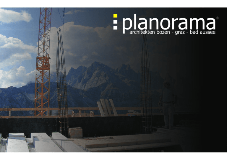 planorama architekten bozen - graz - bad aussee C planorama architekten bozen - graz Das Büro wurde Anfang 2002 von den Architekten Martin Gruber und Thomas Kopfsguter gegründet. planorama besteht aus zwei Büros mit Sitz in Graz (Österreich) und in Bozen (Italien). planorama ist Dienstleister mit Phantasie Bauen und kreatives Schaffen sind archaische Grundbedürfnisse des Menschen. Wir, das Team von planorama, sehen uns als Dienstleister, die diesem Streben professionell beiseite stehen und helfen, das Lebensumfeld zu optimieren. Wir sehen es als unsere Aufgabe bei jedem Projekt, unabhängig von der Größe, neu zu prüfen, welche Einflussfaktoren zu berücksichtigen sind. Jedes Projekt wird individuell angepasst und ausgearbeitet. In der Abwicklung greift planorama auf die eigene weit gestreute Erfahrung und ein erprobtes Netzwerk von Fachplanern und ausführenden Firmen zurück. Es gilt für uns mit Phantasie die Worte und Philosophie des Auftraggebers in kompetenter Weise und somit reibungslos in räumliche Strukturen zu übersetzen. Geschäftsführung Dr. Arch. Martin Gruber Dr. Arch. Thomas Kopfsguter Mitarbeiter Das Büro planorama verfügt über fünf Mitarbeiter. Je nach Projekt werden spezielle Teams aus einem Pool zusammengestellt, der aus selbständig tätigen, auf verschiedenen Bereichen spezialisierten Einzelunternehmern und Gesellschaften besteht. Ausstattung planorama bietet Gesamtlösungen Die Zusammenarbeit von planorama mit fachlich kompetenten Partnern in einzelnen Fachbereichen, welche Einfluss auf die „Umfeldgestaltung“ nehmen ist selbstverständlich. Die Koordination der verschiedenen Teams sehen wir gerne als unsere Aufgabe. planorama nutzt bestehende Ressourcen Der Ausgangspunkt unserer Arbeit kann es nur sein, bestehende Ressourcen zu prüfen. Dazu zählen Kontakte, bestehende Kooperationen und nicht zuletzt die Ressourcen der Natur. Ein Gesamtkonzept optimiert zu erarbeiten heißt für uns, Ressourcen zu nutzen, Synergien zu finden, zu schaffen und diese koordinativ einzubinden. Als eines der zentralen Themen in diesem Zusammenhang erweist sich die Energieoptimierung, sei es aus wirtschaftlichen, als auch aus gesellschaftspolitischen Gründen. Die bestehenden, lokalen Energieressourcen, die Energie der Sonne und der Witterung zu nutzen ist planorama ein Anliegen in der Arbeit als Planer und in seiner Ausbildungs- und Bildungstätigkeit. “Meine Erfahrung mit planorama ist die beste: Die beiden Architekten verstehen sofort was ich meine und geben meinen Ideen mit Ihrer Kreativität so Gestalt und Form, dass man die Ideen auch leicht anderen Menschen näher bringen kann.” Hon. Prof. Dr. Bernhard Pelzl, Wissenschaftlicher DirektorJoanneum Research sieben Computer Arbeitsplätze Farbdrucker, SW-Laserdrucker, Plotter, Beamer Software: Office, Autocad, Abis-AVA, Corel, Adobe Illustrator, Adobe Photoshop, U-Strich, 3DS-Max Flächen: Büroflächen 110m² LEISTUNGSBILD planorama Architekturbüro: arbeitet in den Bereichen Beratung, Planung und Bauüberwachung. Wir betreuen unsere Kunden von der ersten Idee bis zur Fertigstellung des Objektes. planorama weist Erfahrung mit Bauherren aus der öffentlichen Hand, der Wirtschaft und dem privaten Bereich auf. Leistungen im Bereich Hochbau: -Grundlagenermittlung -Entwurf und Präsentation mittels Skizzen oder photorealistischen Darstellungen -Ansuchen um behördliche Genehmigungen -Ausführungsplanung -Ausschreibung und Einholung von Anboten verschiedener Firmen -Kostenaufstellung -Erstellung des Werksvertrages für Firmen -Aufsicht und Rechnungsprüfung in Ausführungsphase -Abnahme und Prüfung der Schlussrechnungen -Übergabe an den Kunden Leistungen im Bereich Innenraumgestaltung -Grundlagenerhebung -Entwurfs-, Einreich-, und Ausführungsplanung -Ansuchen um Baugenehmigung und Förderung -Vorbereitung zur Baudurchführung -Bauaufsicht und Rechnungskontrolle Weitere Tätigkeitsbereichebereiche: -Bestandsaufnahmen -Machbarkeitsstudien -Gutachten -Energieberatung -Außenraumgestaltung: Platz- und Gartengestaltung -Animationen, photorealistische Darstellungen -- Hotel fly on Ein Restaurant mit Zimmern in einer Seehöhe von ca. 2.100m zu errichten ist eine Herausforderung. Nicht nur die landschaftliche Eingliederung ist zu bedenken, auch das touristische Umfeld und, organisatorische Notwendigkeiten, infrastrukturelle Eigenheiten und die örtlichen Traditionen beeinflussen Entwurf und Ausführung des Projektes. Das Hotel - Restaurant “Fly On” entsteht in der Provinz Belluno - Italien. Der Berghang, an dem es errichtet wird, ist vom Passo Valles aus über einen Almweg im Sommer oder mit den Skiern im Winter erreichbar. Das Hotel beherbergt acht Zimmer, die sich in einem Baukörper befinden, welcher über dem Gelände “schwebt”. Das Restaurant und die Wohnung für Betreiber sind in den Felsen gebaut. Ein Panoramafenster an der gesamten Südseite gibt den Blick auf die südlichen Dolomiten frei . Die einzigartige Lage war nebst örtlich spezifischen Faktoren ausschlaggebend für die individuelle Form und Struktur des Gebäudes. Hat man im Restaurant das Gefühl, im Berg zu sein, den Fels zu spüren, erhebt man sich beim Gang in die Zimmer über diesen und hat dann geradezu das Gefühl über dem Gelände zu “fliegen”. Bei der Gestaltung des oberirdischen Bauteiles wurde die typische Form der Almhütte thematisch in den Entwurf aufgenommen und in eine zeitgemäße Architektursprache übersetzt. Zur baulichen Umsetzung werden ortstypische, traditionelle Baumaterialien wie Naturstein (Porphyr) und Holz verwendet. Das Volumen umfasst in etwa 2.000 m³ unterirdisch und 800 m³ oberirdisch. Fertigstellung 2006. “Das Projekt “Fly on” ist ein sehr schwierig zu realisierendes Unterfangen. Der Bauplatz ist exponiert, keinerlei Infrastruktur ist vorhanden. Mit tatkräftiger Unterstützung der Architekten von planorama war es möglich, alle Hürden zu nehmen und ein innovatives Projekt zu entwickeln. Die Arbeit der A