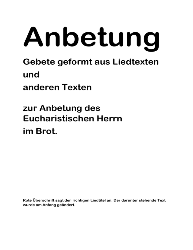 Anbetung Gebete geformt aus Liedtexten und anderen Texten zur Anbetung des Eucharistischen Herrn im Brot. Rote Überschrift sagt den richtigen Liedtitel an. Der darunter stehende Text wurde am Anfang geändert. Morgengebete Lass mich am Morgen hören deine Gnade; denn ich hoffe auf Dich. Tu mir kund den Weg, den ich gehen soll; denn mich verlangt nach dir. Ps 143,8 Txt u. Mel: Carsten Groß 1. Hör mich, wenn ich rufe zu dir, Herr ich weiß, du bist hier, weil du treu bist. Sieh doch, wie der Feind mich zerschlägt (bedrängt), Finsternis um mich legt, dass mir Angst ist. Hör mich, sieh mich, verbirg dich nicht vor mir. 2. Zeig mir welchen Weg soll ich gehen, deine Spur will ich sehn für mein Leben. Führ‘ mich, Gott, auf ebener Bahn, hilf mir, mich deinem Plan zu ergeben. Lehr mich, führ mich, denn du bist mein Gott. ganzer Txt u. Mel: Andrea_Adams Frey Wort Gottes, dessen Macht und Ruf im Urbeginn die Welt erschuf. Du bist der Anfang und das Ende. Der Himmel und die ganze Welt sind deiner Hoheit unterstellt. Du bist der Zeiten Lot und Wende. Die Weisheit baute sich ein Haus, darin spricht Gott sich selber aus, und dieses Wort hat uns getroffen. Nun ist die Welt nicht mehr so leer, nicht mehr die Last so drückend schwer: Der Weg zum Vater steht uns offen. Zeitgenössisch Melodie: GL 393 . GL 1975265· KG 534 (letzte Textzeile wird wiederholt). Ich such dich in der Frühe, mein Schutz und meine Zuflucht. Am Morgen und am Abend, mein Gott, bet ich zu dir. Vor deiner Grüße steh ich, ich stehe voller Furcht, denn alles was ich denke, ist dir, mein Gott, bekannt. Die Zunge, der Verstand, was können sie vollbringen? Was ist schon meine Kraft? Mein Geist in meinem Innern? Des Menschen Lied gefällt dir; Ich danke dir dafür, solang ich Leben habe, das du mir schenkst, o Gott. Solomon ben Jehuda ibn Gabirol, wurde 1021/22 in Málaga geboren und starb 1057 in Valencia Ich sehe, Christus, Du bist es, den die Sonne an jedem Morgen uns erneut verkündet, wenn sie das Dunkel siegreich überwindet und strahlend aufgeht. So willst Du Christus alle dunklen Mächte aus meinem Herzen, meinem Sinne bannen. Vor Deinem Lichte flieht die Macht des Bösen und weicht der Liebe. Lasst von der Liebe, Jesus, mich erfassen, dass sie im Herzen alles Harte sprenge und mich durchglühe, mich für Gott entzünde und für die Brüder. Dann wird deine Liebe, Jesus, unser schönster Hymnus, den wir begeistert dir, unserem Schöpfer singen, nicht nur am Morgen, sondern jede Stunde und ohne Ende. Lass uns dich preisen, Vater du im Himmel, der du voll Liebe deinen Sohn gesandt hast. Von deinem Geiste lass uns ganz erfasst sein an diesem Tage. Amen. nach © Bernardin Schellenberger 2013 Gebet vor dem Allerheiligsten: Jesus, das Licht Jesus, Du bist in diesem Brot mitten unter uns. Die Strahlen der Monstranz erinnern an die Sonne. Du hast gesagt: "Ich bin das Licht der Welt." Wie die Sonne mit ihrer Kraft den Weltraum, die Luft und die Wolken durchdringen kann, so bist Du da und wärmst Du uns. Durch Dich kann alles wachsen, blühen und reifen. Du gibst uns Leben. Wie wir uns freuen, wenn die Sonne scheint, so dürfen wir uns an Dir freuen. Wir danken Dir, dass wir in Deinem Licht leben. Amen. Gebet bei der Erstkommunionandacht in Rott am Inn 2017 Stille vor Jesus In der Stille angekommen 1. In der Stille angekommen, werd ich ruhig zum Gebet. Große Worte sind nicht nötig, denn Gott weiß ja, wie's mir geht. Refrain: Danken und loben, bitten und flehn. Zeit mit Gott verbringen. Die Welt mit offnen Augen sehn. Reden, hören, fragen, verstehn. Zeit mit Gott verbringen. Die Welt mit seinen Augen sehn. 2. In der Stille angekommen, leg ich meine Masken ab. Und ich sage Gott ganz ehrlich, was ich auf dem Herzen hab. 3. In der Stille angekommen, schrei ich meine Angst heraus. Was mich quält und mir den Mut nimmt, all das schütt ich vor Gott aus. 4. In der Stille angekommen, nehm ich dankbar, was er gibt. Ich darf zu ihm „Vater“ sagen, weil er mich unendlich liebt. Txt: (nach Mt 6,5-8): Christoph Zehendner, Mel: Manfred Staiger Stille vor dir, mein Vater 1. Stille vor dir, mein Jesus. Neue Stille vor dir suche ich, Herr. Stille vor dir, ich höre. Schenke mir jetzt deine Gnad. 2. Stille vor dir ist Gnade. Aus der Stille vor dir schöpfe ich Kraft. Stille vor dir, ich höre. Schenke mir jetzt deine Gnad. Refr. Ich bete Dich an, mein Jesus, heute, jetzt und hier. Gesten der Wahrheit kommen von dir. Liebe willst du, Jesus, heut schenken mir. Herr, hab Dank dafür. 3. Stille vor dir, will schweigen, und ich öffne mein Herz nun deiner Gnad‘. Stille vor dir, bin offen. Schenke mir jetzt deine Gnad. 4. Stille vor dir, ist Frieden. Und ich staune, o Herr: wirken tust du. Stille vor dir, bin offen. Schenke mir jetzt deine Gnad. nach Text: Carsten Groß + Melodie: Carsten Groß © 1998 Hänssler Verlag, D-71087 Holzgerlingen Aus: Feiert Jesus 2, Nr. 97 1) Lass du mich stille werden, mein Herr und Gott, nur deine Stimme hören in Glück und Not. 2) Bring alles eigne Wollen in mir zur Ruh, und meines Lebens Fragen entscheide du. 3) Wenn ich den Weg nicht finde in dunklem Streit, leucht mir mit ewgem Lichte durch diese Zeit. 4) Reich mir die Gnadenhände in meinem Lauf; zieh Blicke und Gedanken zu dir hinauf! 5) Bin ich in deinem Bilde dereinst erwacht, dann rühm ich deine Gnade: du hast's vollbracht. (Glaubenslebenslied, Autor: Maria Esther, Gräfin von Waldersee (1838-1914)) Ich will auf das Leise hören, Halte fern, was jetzt kann stören. Guter Gott, mach mich ganz still, weil ich auf Dich lauschen will. Text: Wolfgang Longardt, Melodie: Wolfgang Longardt Unruhig ist unser Herz Unruhig ist unser Herz, unruhig ist unser Herz, bis es Ruhe findet, Ruhe findet in dir. Kommt u mir, spricht der Herr, kommt zu mir, spricht der Herr, und dann ruht ein wenig aus. Gütig ist mein Herz, gütig ist mein Herz und mein Joch drückt nicht und mein Last ist leicht. Lernt von mir, spricht der Herr Lernt von mir, spricht der Herr und ihr we
