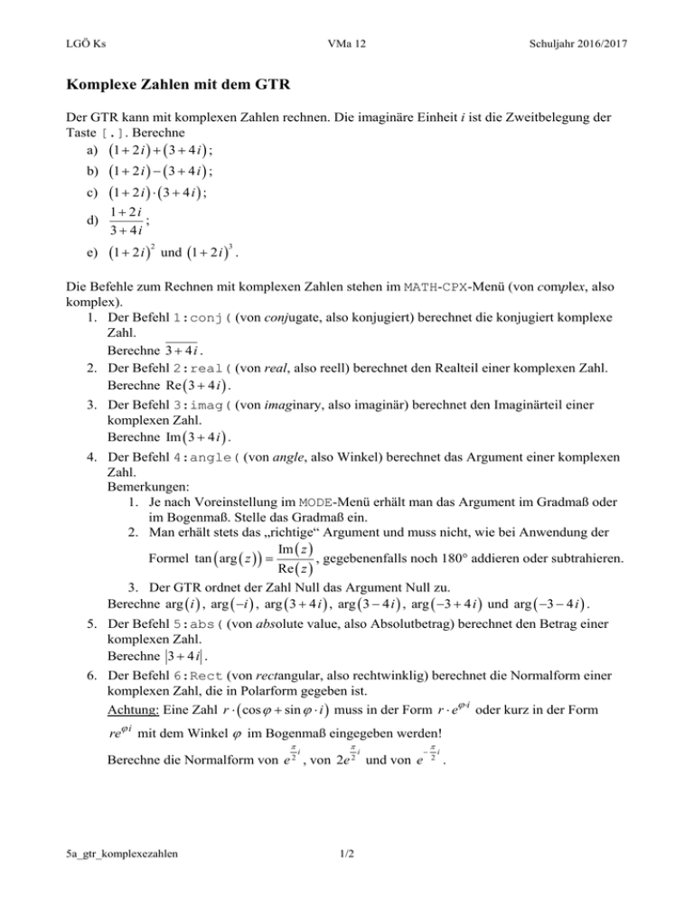 LGÖ Ks VMa 12 Schuljahr 2016/2017 Komplexe Zahlen mit dem GTR Der GTR kann mit komplexen Zahlen rechnen. Die imaginäre Einheit i ist die Zweitbelegung der Taste [.]. Berechne a) 1 2 i 3 4 i ; b) c) 1 2 i 3 4 i ; 1 2 i 3 4 i ; d) 1 2i ; 3 4i e) 1 2i 2 und 1 2i . 3 Die Befehle zum Rechnen mit komplexen Zahlen stehen im MATH-CPX-Menü (von complex, also komplex). 1. Der Befehl 1:conj( (von conjugate, also konjugiert) berechnet die konjugiert komplexe Zahl. Berechne 3 4i . 2. Der Befehl 2:real( (von real, also reell) berechnet den Realteil einer komplexen Zahl. Berechne Re 3 4i . 3. Der Befehl 3:imag( (von imaginary, also imaginär) berechnet den Imaginärteil einer komplexen Zahl. Berechne Im 3 4i . 4. Der Befehl 4:angle( (von angle, also Winkel) berechnet das Argument einer komplexen Zahl. Bemerkungen: 1. Je nach Voreinstellung im MODE-Menü erhält man das Argument im Gradmaß oder im Bogenmaß. Stelle das Gradmaß ein. 2. Man erhält stets das „richtige“ Argument und muss nicht, wie bei Anwendung der Im z , gegebenenfalls noch 180° addieren oder subtrahieren. Formel tan arg z Re z 3. Der GTR ordnet der Zahl Null das Argument Null zu. Berechne arg i , arg i , arg 3 4i , arg 3 4i , arg 3 4i und arg 3 4i . 5. Der Befehl 5:abs( (von absolute value, also Absolutbetrag) berechnet den Betrag einer komplexen Zahl. Berechne 3 4i . 6. Der Befehl 6:Rect (von rectangular, also rechtwinklig) berechnet die Normalform einer komplexen Zahl, die in Polarform gegeben ist. Achtung: Eine Zahl r cos sin i muss in der Form r e i oder kurz in der Form re i mit dem Winkel im Bogenmaß eingegeben werden! 2 i Berechne die Normalform von e , von 2e 5a_gtr_komplexezahlen 2 1/2 i und von e 2 i . LGÖ Ks VMa 12 Schuljahr 2016/2017 7. Der Befehl 7:Polar berechnet die Polarform einer komplexen Zahl, die in Normalform gegeben ist. Bemerkungen: 1. Der GTR stellt die Polarform r cos sin i in der Form re i dar. 2. Je nach Voreinstellung im MODE-Menü wird der Winkel im Gradmaß oder im Bogenmaß dargestellt. Berechne die Polarform von i, von i und von 3 4i . In der Voreinstellung kann der GTR keine komplexen Wurzeln berechnen. Wenn man versucht, 1 zu berechnen, dann erscheint die Fehlermeldung NONREAL ANS, also nichtreelle Antwort. Im MODE-Menü kann man in der 7. Zeile die Modi REAL, a+bi und re^i einstellen. 1. Im Modus Real berechnet der GTR nur reelle Wurzeln. Dieser Modus ist die Voreinstellung. 2. Im Modus a+bi berechnet der GTR auch komplexe Wurzeln und stellt sie in der Normalform dar. Stelle diesen Modus ein und berechne 1 , 3 4 i und 3 2 11i . 3. Im Modus re^i berechnet der GTR auch komplexe Wurzeln und stellt sie in Polarform dar. Stelle diesen Modus ein und berechne 1 . Bemerkungen: 1. Der GTR kann immer nur eine komplexe Wurzel berechnen. 2. Ist n gerade, dann berechnet der GTR als n-te Wurzel einer Zahl z immer diejenige arg z Wurzel w mit arg w . n 3. Ist n ungerade, dann berechnet der GTR als n-te Wurzel einer negativen reellen Zahl x immer die Wurzel n x und als Wurzel jeder anderen Zahl z diejenige Wurzel w mit arg w arg z 5a_gtr_komplexezahlen n . 2/2