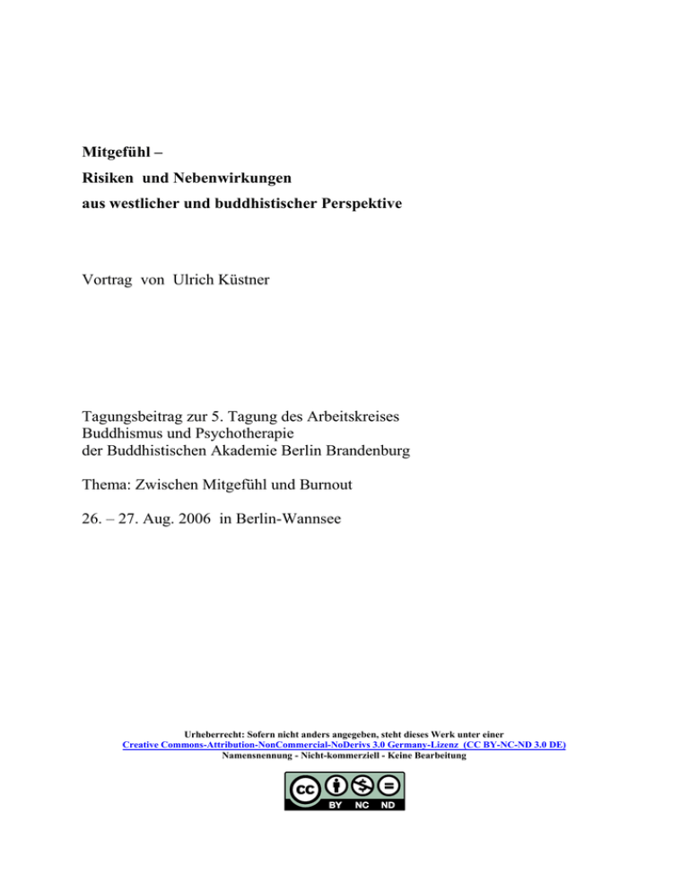 Mitgefühl – Risiken und Nebenwirkungen aus westlicher und buddhistischer Perspektive Vortrag von Ulrich Küstner Tagungsbeitrag zur 5. Tagung des Arbeitskreises Buddhismus und Psychotherapie der Buddhistischen Akademie Berlin Brandenburg Thema: Zwischen Mitgefühl und Burnout 26. – 27. Aug. 2006 in Berlin-Wannsee Urheberrecht: Sofern nicht anders angegeben, steht dieses Werk unter einer Creative Commons-Attribution-NonCommercial-NoDerivs 3.0 Germany-Lizenz (CC BY-NC-ND 3.0 DE) Namensnennung - Nicht-kommerziell - Keine Bearbeitung Mitgefühl - Risiken und Nebenwirkungen aus westlicher und buddhistischer Perspektive Ulrich Küstner Vorbemerkung In der Psychotherapie gibt es schon länger ein Umdenken, weg von einer Betonung der Symptome, der Pathologie, der Defizite, hin zu einem ressourcenorientierten Denken und einer neuen Bewertung des Nutzens positiver Emotionen und Haltungen. Aus buddhistischer Sicht ist dies eine gute Entwicklung. Sie entspricht dem, was schon seit 2500 Jahren buddhistische Lehre ist. Eine bekannte, kurze Zusammenfassung der Lehre des Buddha ist folgender Ausspruch: "Tue das Gute, Meide das Negative, Schau immer in den eigenen Geist, das ist die Lehre des Buddha." Die praktische Erfahrung zeigt, dass nicht wenige Menschen dies folgendermaßen verstehen: "Sei immer nur lieb und mitfühlend, unterdrücke jeden Ärger und jede Wut, und pflege exzessive Selbstbeobachtung." Weder der Buddha noch die nach ihm kommenden buddhistischen Lehrer waren naiv oder eindimensional. Ihre primäre Intention war weder moralisch noch ordnungspolitisch, sondern emanzipatorisch und damit letztlich revolutionär. Falsch verstandenes "Gutes" kann uns und unseren Klienten mehr schaden als nützen. Die These dieses Beitrags ist: Universelles Mitgefühl ist wunderbar, AlltagsMitgefühl kann krankmachen. Verbale, intellektuelle Begriffsdefinitionen reichen genauso wenig wie stures Üben, um das Problem zu lösen. Denn es geht um Erfahrungen und Haltungen, die den ganzen Menschen umfassen. Nur das Zusammenspiel von Üben, Beobachten, Lernen und Denken hilft uns, persönliche Sackgassen zu vermeiden. Und wenn wir gleichzeitig westliche Psychologie, Physiologie und buddhistische Lehren berücksichtigen, können wir vielleicht leichter verstehen, was geschieht. TEIL 1 Risiken und Nebenwirkungen aus westlicher Sicht Mitgefühl ist ein zentrales Konzept des Mahayana-Buddhismus. In allen Hochreligionen wird Mitgefühl als Tugend hochgehalten und eingefordert. Im Buddhismus wird es darüber hinaus auch als Weg zum Ziel gesehen. Mitgefühl und Weisheit sind zwei Aspekte von Bodhicitta, der Geisteshaltung, von der der tibetische Meister Patrul Rinpoche (19. Jh.) sagte, sie wäre der "einzige Weg zur Erleuchtung, den alle Buddhas gingen". Unter verschiedenen Namen und Bezeichnungen nimmt Mitgefühl auch in der Psychotherapie eine zentrale Rolle ein. Carl Rogers beschreibt in den drei zentralen Therapeuteneigenschaften die Empathie. Campbell Purton und David Brazier denken dies weiter und sehen Empathie als karuna, bedingungsfreie Akzeptanz als maitri und Echtheit als prajna, und somit als die direkten Gegenstücke der Geistesgifte Hass, Gier, und Verblendung. Fast alle Psychotherapeuten sind sich einig darüber, daß ohne ein gewisses Maß an Empathie eine Therapie nicht möglich ist. Mitgefühl ist jedoch nicht nur etwas, das Therapeuten freiwillig und aus eigenem inneren Antrieb erbringen oder zumindest anstreben, sondern etwas, was Patienten, Klienten und Institutionen erwarten und einfordern. Von Psychotherapeuten und Ärzten wird selbstverständlich erwartet, daß sie weiter mitfühlend und aufopfernd behandeln, auch wenn sie nur schlecht oder für einen Teil ihrer Arbeit bezahlt werden. Wir werden wohl nicht mehr lange darauf warten müssen, daß Empathie und Mitgefühl im Rahmen von Qualitätssicherungsmaßnahmen eingefordert werden. Mitgefühl wird auch als ethischer Imperativ und moralische Keule gebraucht, als selbstverständlich eingesetztes Mittel, um aus Angestellten und Mitarbeitern Arbeitsleistung herauszuholen. Diese komplexe Mischung gilt es zu entflechten, wenn wir uns und anderen nutzen, und nicht schaden, wollen. Buddhistisch orientierte PsychotherapeutInnen stehen zusätzlich unter Druck, unter Mitgefühls-Druck: Wahrscheinlich bringen sie eine natürliche Neigung dazu mit, die schon bei der Berufswahl eine Rolle spielte. Dann sagen Buddha und buddhistische Lehrer, daß sie Mitgefühl entwickeln müssen, erstens als ethische Forderung und zweitens als Weg, ohne den sie ihr Ziel nicht erreichen. Dann wird Mitgefühl als Teil ihrer Berufsbeschreibung von der Gesellschaft erwartet und von Patienten und Institutionen eingefordert. Und zuletzt gibt es noch einen subtilen sozialen Druck unter Buddhisten, der Achtsamkeit, Mitgefühl und was nicht sonst noch alles erwartet. Es genügt, sich verschiedene Sanghas und buddhistische Gruppen und deren Umgang miteinander anzuschauen, um zu wissen daß in jedem dieser buddhistischen Kontexte nur ein gewisses Ausmaß an Ärger, Frustration, Äußerungen von Zweifeln oder depressiver Stimmungslage zugelassen ist. Der Gruppenerwartung zuwiderlaufendes eigenes Erleben ist oft nur in engen Grenzen verbalisierbar oder gar lebbar. Es ist nicht verwunderlich, daß Therapeuten mit verschiedenen Bewältigungs- und Abwehrmechanismen reagieren, oder diesem Druck nicht standhalten und ausbrennen. Der angebliche Zynismus der Ärzte ist legendär, über die Hilflosen Helfer schrieb Schmidbauer bereits 1977. Im angelsächsischen Sprachraum wurde der Begriff "compassion fatigue" von Figley 1995 geprägt. Es ist einleuchtend, daß solche Entwicklungen niemandem nützen und auch nicht das sein können, was buddhistische Lehrer mit ihrer Betonung von Mitgefühl erreichen wollen. Aber nutzt es uns, dann einfach noch intensiver zu meditieren, mehr buddhistische Texte studieren und "Mitgefühl zu üben", damit es dann wieder besser wird? Oder besteht eher die Gefahr,