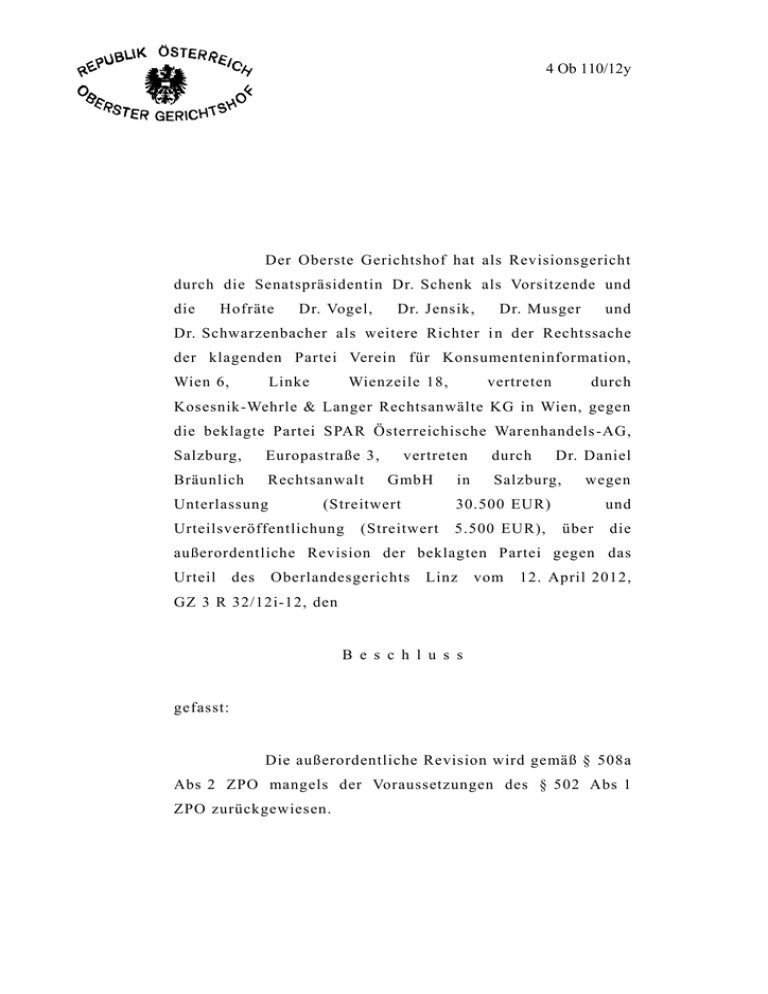 4 Ob 110/12y Der Oberste Gerichtshof hat als Revisionsgericht durch die Senatspräsidentin Dr. Schenk als Vorsitzende und die Hofräte Dr. Vogel, Dr. Jensik, Dr. Musger und Dr. Schwarzenbacher als weitere Richter i n der Rechtssache der klagenden Partei Verein für Konsumenteninformation, Wien 6, Linke Wienzeile 18, vertreten durch Kosesnik-Wehrle & Langer Rechtsanwälte KG in Wien, gegen die beklagte Partei SPAR Österreichische Warenhandels -AG, Salzburg, Europastraße 3, Bräunlich Rechtsanwalt Unterlassung vertreten GmbH (Streitwert Urteilsveröffentlichung in durch Dr. Daniel Salzburg, wegen 30.500 EUR) (Streitwert 5.500 EUR), und über die außerordentliche Revision der beklagten Partei gegen das Urteil des Oberlandesgerichts Linz vom 12. April 2012, GZ 3 R 32/12i-12, den B e s c h l u s s gefasst: Die außerordentliche Revision wird gemäß § 508a Abs 2 ZPO mangels der Voraussetzungen des § 502 Abs 1 ZPO zurückgewiesen. 2 4 Ob 110/12y B e g r ü n d u n g : Die Vorinstanzen trugen der Beklagten aufgrund von Z 28 des Anhangs zum UWG auf, es im geschäftlichen Verkehr zu unterlassen, in ihrer Werbung, insbesondere auf Werbeplakaten, die sie in ihren Filialen affichiert, unmündige Minderjährige, insbesondere Volksschulkinder, zum Kauf bestimmter beworbener Produkte direkt aufzufordern, insbesondere durch Aufforderungen wie „Hol´ dir hier das Buch dazu! Stickersammelbuch zum Sensationspreis“ oder sinngleiche Aufforderungen. Grundlage des Verbots war die Werbung der Beklagten für ein Stickeralbum. Sie hatte auf dem Kopfteil eines zur Aufnahme solcher Alben bestimmten Kartonständers blickfangartig folgende Aussage abgedruckt: „Die Entdeckungsreise zu den Wüsten und Steppen beginnt! Hol' dir hier das Buch dazu. Stickersammelbuch zum Sensationspreis € 1,99.“ Die Vorinstanzen werteten das als direkte Aufforderung an Kinder, das Album zu kaufen. Damit sei der Tatbestand von Z 28 Anh UWG (Nr 28 Anh RL-UGP) erfüllt. Die dagegen gerichtete außerordentliche Revision der Beklagten zeigt keine erhebliche Rechtsfrage auf. 1. Trotz Fehlens einer ausdrücklichen Rechtsprechung des Obersten Gerichtshofs zu einer konkreten Fallgestaltung liegt dann keine erhebliche Rechtsfrage vor, wenn das Gesetz selbst eine eindeutige Regelung trifft (RIS-Justiz RS0042656) oder ein Streitfall trotz neuer Sachverhaltselemente bereits mit Hilfe vorhandener Leitlinien höchstgerichtlicher Rechtsprechung gelöst werden kann (Zechner in Fasching/Konecny 2 § 502 ZPO Rz 70 mwN). Ein 3 Indiz für die eindeutige 4 Ob 110/12y Regelung eines bestimmten Sachverhalts ist die insofern übereinstimmende Auslegung der strittigen Bestimmung in der rechtswissenschaftlichen Literatur. Ein solcher Fall liegt hier vor. 2. Zum Begriff „Kinder“ 2.1. Die Beklagte vertritt die Auffassung, der Begriff „Kinder“ sei im Sinn der früheren Definition des § 21 ABGB (idF vor dem KindRÄG 2001, BGBl I 135/2000) zu verstehen. Z 28 Anh UWG erfasse daher nur Minderjährige unter sieben Jahren, die, des Lesens unkundig, von der hier beanstandeten Werbung nicht angesprochen worden seien. 2.2. Z 28 Anh UWG beruht allerdings auf der gleichlautenden Nr 28 richtlinienkonform Begriffe des RL-UGP auszulegen Unionsrechts und ist (RIS-Justiz sind daher RS0075866). wiederum - außer bei Vorliegen eines ausdrücklichen Verweises auf nationales Recht - autonom auszulegen (EuGH C-357/98, Yaa Konadu Yiadom, Slg 2000 Kletečka/Schauer, I-9265, Rz 26 ABGB-ON 1.00 mwN; § 6 Schauer Rz 30; Posch in in Schwimann/Kodek, ABGB 4 § 6 Rz 33). Das gilt nach praktisch einhelliger Lehre auch für den Begriff „Kinder“ in Nr 28 Anh UWG (Burgstaller in Wiebe/G. Kodek, UWG [2009] Anh § 1a Rz 83; Köhler/Bornkamm in Köhler/Bornkamm, UWG 3 0 [2012] §3 Abs 3 Rz 28.5; WRP 2007, 1398 f; Mankowski, Apetz, Das Geschäftspraktiken [2011] Begründung deutschen des BT-Drucks 16/10145; Wer 646 ist Verbot mwN; RegE tendenziell ein aggressiver vgl zu „Kind“? auch die Anh Nr 28, anders nur Prunbauer- Glaser, Kinder, Kinder! - Zum „Kind“ in der Werbung nach der UWG-Nov 2007, ÖBl 2008, 164 [167], die jedoch aus österreichischer Sicht sogar Sechzehnjährige als Kinder ansehen will). Ausreichende Gründe für einen 4 4 Ob 110/12y Rückgriff auf - noch dazu nicht mehr geltendes - nationales Recht zeigt die Beklagte nicht auf. 2.3. Als Ergebnis dieser autonomen Auslegung ist - dem Schutzzweck der Bestimmung entsprechend - ebenfalls völlig unbestritten, dass jedenfalls Minderjährige unter vierzehn Jahren unter Nr 28 Anh RL-UGP und damit auch unter die richtlinienkonform auszulegenden Bestimmungen der jeweiligen Umsetzungsgesetze fallen (Burgstaller in Wiebe/Kodek, UWG [2009] Anh § 1a Rz 87, 91; Duursma/Duursma-Kepplinger in Gumpoldsberger/ Baumann, UWG Ergänzungsband [2009] Anhang Aggressive Geschäftspraktiken Rz 103; Wiltschek/Majchrak, Die UWG-Novelle 2007, ÖBl 2008, 4 [8 FN 26]; Apetz, Das Verbot aggressiver Geschäftspraktiken [2011] 655 ff; Fuchs, Wettbewerbsrechtliche Schranken bei der Werbung gegenüber Minderjährigen, Werbung WRP 2009, gegenüber Kindern: 255 [256 f, Welche 263]; Grenze Köhler, zieht die Richtlinie über unlautere Geschäftspraktiken? WRP 2008, 700 [702]; Scherer, Kinder als Konsumenten und Kaufmotivatoren, WRP 2008, 430, 432; dies, „Case law“ in Gesetzesform - Die „Schwarze Liste“ als neuer UWG -Anhang, NJW 2009, 324, 330; dies in Fezer, UWG (2010) Anhang Nr. 28 Rz 9; Sosnitza in Piper/Ohly/Sosnitza, UWG 5 [2010] Rz 59; Steinbeck, Die Zukunft der aggressiven Geschäftspraktik, WRP 2008, 865, 867 f). Strittig ist nur, ob auch ältere Minderjährige erfasst sein könnten (dafür insb Mankowski, WRP 2007, 1403 ff, Prunbauer-Glaser, ÖBl 2008, 167). An der Richtigkeit der Auslegung durch die Vorinstanzen bestehen daher keine vernünftigen Zweifel. 3. Zur „Aufforderung“ an Kinder 3.1. Die Beklagte vertritt die Auffassung, dass eine „direkte Aufforderung“ iSv Z 28 Anh UWG (Nr 28 5 Anh RL-UGP) nur vorliege, 4 Ob 