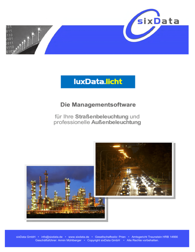 luxData.licht Die Managementsoftware für Ihre Straßenbeleuchtung und professionelle Außenbeleuchtung sixData GmbH • info@sixdata.de • www.sixdata.de • Gesellschaftssitz: Prien • Amtsgericht Traunstein HRB 14666 Geschäftsführer: Armin Mühlberger • Copyright sixData GmbH • Alle Rechte vorbehalten. Inhaltsverzeichnis luxData.licht Seite Warum luxData®? Überblick Struktur Beleuchtungsnetz Leuchtstellen Schaltschränke / Leitungszüge Instandhaltung Aufbau Wartung Störungen / Unfälle Katalogdaten Zuordnungen / Gruppierungen Basisdaten Standorte / Adressen Schaltprogramme Wartungsvorschriften Abrechnungsvorschriften / Stromverträge / Bewertungen / Ausschreibungsverfahren / Vertragsdaten Verschiedene Funktionen im Überblick Statistiken, Auswertungen, Analysen Filter / Abfragen Bild– und Dokumentenarchiv / Formular-Referenzen Terminplanung / Verbrauchsabrechnung / EULUMDAT Wartungsvorschriften organisieren / Materialdisposition Benutzeroberfläche Ansichten Formulare individualisieren Benutzerverwaltung Benutzergruppen, Benutzer / Rechtevergabe Vererbung von Rechten Berichte luxData.GIS GIS-Statistik Schnittstellen SAP / GIS Optionen Technik Allgemeines Systemvoraussetzungen Architektur Referenzen Copyright sixData GmbH 3 4 5 6 7 9 10 11 12 14 15 16 17 18 19 20 21 22 23 24 25 26 27 28 29 30 31 32 33 34 35 36 37 Seite 2 luxData.licht Warum luxData®? Aufgaben Anforderungen Die Straßenbeleuchtung ist eine kommunale Aufgabe, die dem Allgemeinwohl dient. Details sind in der DIN-EN 13201 geregelt. mehr in den Vordergrund gerückt. Das Ziel der Kommunen muss es sein, dass das Ziel Kosten/Leistungsverhältnis für den Unterhalt der Straßenbeleuchtung reduziert oder auf Dauer möglichst niedrig gehalten wird. Voraussetzung hierfür ist der technisch einwandfreie Betrieb der Straßenbeleuchtung, ohne dabei die strengen wirtschaftlichen Gesichtspunkte zu vernachlässigen. In diesem Zusammenhang sind die Anforderungen im Bezug auf das Management der Straßenbeleuchtung gestiegen. Zudem sind die betriebswirtschaftlichen und technischen Aufgaben komplexer und bedeutsamer geworden. Entscheidungen erfordern deshalb verstärkt ein Höchstmaß an verlässlichen, aussagekräftigen und rechtzeitig verfügbaren Informationen. Die nachstehende Grafik zeigt wesentliche Aufgaben und Anforderungen, die im Verwaltungsbereich der Straßenbeleuchtung auftreten können. Besonders steigende Energiekosten sowie das Thema CO2, haben die Straßenbeleuchtung immer Unsere Lösung luxData.licht ist Ihr Schlüssel für Effizienz im Management der Straßenbeleuchtung und der professionellen Außenbeleuchtung! luxData.licht - ist ein modular aufgebautes System. luxData.licht - wird seit vielen Jahren erfolgreich in der Beleuchtungsbranche eingesetzt. luxData.licht - deckt alle Anforderungen in der Verwaltung der Straßen- und der professionellen Außenbeleuchtung ab. luxData.licht - wird kontinuierlich weiterentwickelt. Copyright sixData GmbH Seite 3 Überblick luxData.licht Wichtige Funktionen in der Übersicht O = Optional Dokumentation des Anlagenbestandes mit lückenloser Historisierung Typenkatalog für alle erforderlichen Bauteile Instandhaltungsmanagement inkl. Störung, Wartung, Unfälle, Kostenkontrolle Berichtspool mit zahlreichen Vorlagen und integriertem Berichtsgenerator Statistik-, Auswertungs– und Analyse-Werkzeuge Umfangreiche Filterwerkzeuge Abfragen per Drag&Drop Wertelisten Materialdisposition Verbrauchsabrechnung inkl. Schaltprogramme, Stromvertragsdaten, Abrechnungsvorschriften Dämmerungskalender Terminverwaltung GIS mit GIS-Statistik Benutzerverwaltung hierarchisch Benutzerfilter Auftragsbearbeitung extern stoerung24 Schnittstelle zu MS-Office (z.B. Excel) Datenbankexport SQL-Interface Script-Editor (VB.NET und C#) O Lastkurve O Störungen extern bearbeiten O Wartungsarbeiten extern bearbeiten O GIS-Schnittstellen O SAP-Schnittstellen O Copyright sixData GmbH Seite 4 luxData.licht Struktur Für die Abwicklung der Aufgaben zur Verwaltung der Straßenbeleuchtung gliedert sich luxData.licht in vier wesentliche Bereiche. Basis– und Katalogdaten Beleuchtungsnetz Instandhaltung / Instandsetzung Auswertungen / Optimierung luxData.licht Copyright sixData GmbH Diese können mit Hilfe von optionalen Modulen und verschiedenen Schnittstellen erweitert werden. Mit luxData.licht können so selbst komplexe Anforderungen leicht erfüllt werden. Optionale Module Seite 5 Beleuchtungsnetz luxData.licht Sie verfügen über Daten in elektronischer Form? Ihnen liegen Anlagendaten (Leuchtstellen, Schaltschränke, Leitungszüge, Standortangaben) in elektronischer und tabellarischer Form vor (z.B. Excel, Access, GIS oder ähnliches)? Natürlich können diese von uns zu 100% in das System von luxData.licht importiert werden. Bilden Sie in luxData.licht Ihr komplettes Beleuchtungsnetz mit allen für Sie relevanten Informationen ab. Werden alle Möglichkeiten ausgenutzt, setzt sich Ihr vollständiges Beleuchtungsnetz aus Leuchtstellen, Schaltschränken, Leitungszügen und Zählern zusammen. Alle erforderlichen Informationen werden aus den Basisdaten und Katalogdaten bereitgestellt. Als Minimalanforderung würde es genügen, wenn nur ein paar wesentliche Angaben zu den Leuchtstellen in luxData.licht hinterlegt werden. Wie viele Angaben Sie letztendlich in einer Leuchtstelle hinterlegen, hängt einzig und alleine davon ab, wie viele Informationen Sie am Ende aus luxData.licht für Ihre Entscheidungen „herausziehen“ wollen. Es gilt die Regel: Es können nur Informationen aus einer Datenbank herausgeholt werden, die vorher eingepflegt wurden. Im Umkehrschluss bedeutet das: Je mehr Daten in einer Datenbank hinterlegt werden, um so mehr Fragen können Sie später beantworten. Die flexible Standortstruktur in luxData.licht erlaubt es auch mehrere Orte gleichzeitig zu verwalten. Dabei können Orte (oder auch andere Teile der Standorthierachie) nach Benutzer oder Benutzergruppen getrennt dargestellt werden. Cop