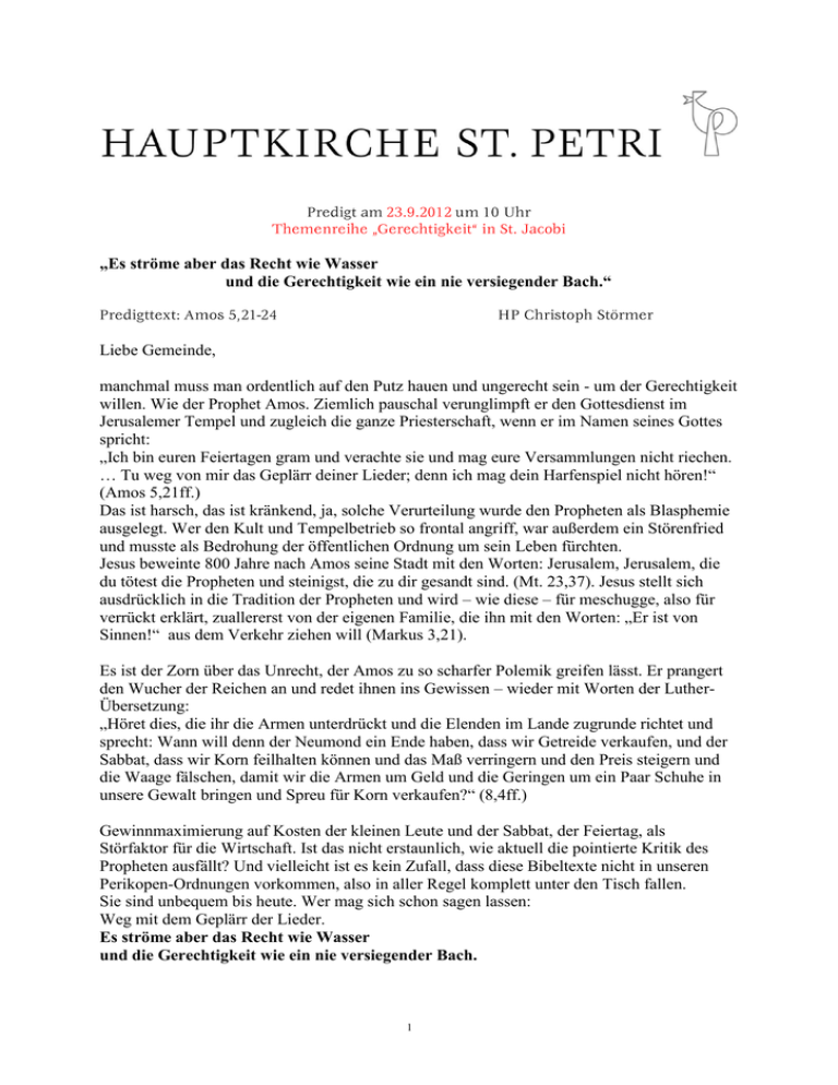 „Es ströme aber das Recht wie Wasser und die Gerechtigkeit wie ein nie versiegender Bach.“ Liebe Gemeinde, manchmal muss man ordentlich auf den Putz hauen und ungerecht sein - um der Gerechtigkeit willen. Wie der Prophet Amos. Ziemlich pauschal verunglimpft er den Gottesdienst im Jerusalemer Tempel und zugleich die ganze Priesterschaft, wenn er im Namen seines Gottes spricht: „Ich bin euren Feiertagen gram und verachte sie und mag eure Versammlungen nicht riechen. … Tu weg von mir das Geplärr deiner Lieder; denn ich mag dein Harfenspiel nicht hören!“ (Amos 5,21ff.) Das ist harsch, das ist kränkend, ja, solche Verurteilung wurde den Propheten als Blasphemie ausgelegt. Wer den Kult und Tempelbetrieb so frontal angriff, war außerdem ein Störenfried und musste als Bedrohung der öffentlichen Ordnung um sein Leben fürchten. Jesus beweinte 800 Jahre nach Amos seine Stadt mit den Worten: Jerusalem, Jerusalem, die du tötest die Propheten und steinigst, die zu dir gesandt sind. (Mt. 23,37). Jesus stellt sich ausdrücklich in die Tradition der Propheten und wird – wie diese – für meschugge, also für verrückt erklärt, zuallererst von der eigenen Familie, die ihn mit den Worten: „Er ist von Sinnen!“ aus dem Verkehr ziehen will (Markus 3,21). Es ist der Zorn über das Unrecht, der Amos zu so scharfer Polemik greifen lässt. Er prangert den Wucher der Reichen an und redet ihnen ins Gewissen – wieder mit Worten der LutherÜbersetzung: „Höret dies, die ihr die Armen unterdrückt und die Elenden im Lande zugrunde richtet und sprecht: Wann will denn der Neumond ein Ende haben, dass wir Getreide verkaufen, und der Sabbat, dass wir Korn feilhalten können und das Maß verringern und den Preis steigern und die Waage fälschen, damit wir die Armen um Geld und die Geringen um ein Paar Schuhe in unsere Gewalt bringen und Spreu für Korn verkaufen?“ (8,4ff.) Gewinnmaximierung auf Kosten der kleinen Leute und der Sabbat, der Feiertag, als Störfaktor für die Wirtschaft. Ist das nicht erstaunlich, wie aktuell die pointierte Kritik des Propheten ausfällt? Und vielleicht ist es kein Zufall, dass diese Bibeltexte nicht in unseren Perikopen-Ordnungen vorkommen, also in aller Regel komplett unter den Tisch fallen. Sie sind unbequem bis heute. Wer mag sich schon sagen lassen: Weg mit dem Geplärr der Lieder. Es ströme aber das Recht wie Wasser und die Gerechtigkeit wie ein nie versiegender Bach. 1 Beides wird zurückgehalten. Doch beides soll wieder in Fluss, in Umlauf gebracht werden wie eine gute neue Währung. Im hebräischen Text stehen die Worte Mischpat und Zedaka. Beides muss in den Blick kommen. Mischpat ist das jüdische Recht, dass sich die Mächtigen gern zum eigenen Nutzen zurecht biegen. Und was dann geschriebenes Recht ist, dient oft genug nicht der Zedaka, der Gerechtigkeit. Diese zielt immer auf das Gemeinwohl zielt, weshalb man das Wort auch mit Wohltätigkeit übersetzen kann. Das Konzept Zedaka bedeutet, dass Juden verpflichtet sind, von dem zu geben, was Gott ihnen anvertraut hat, um es zu teilen und die Welt zu heilen. Das geltende Recht soll also dem Gemeinwohl, nicht den Privilegien des Einzelnen dienen. So fordert der 94. Psalm, dass Gott das Unrecht auf die zurückwenden möge, die gewalttätig auftrumpfen. Und dann heißt es voller Zuversicht und Emphase (Vers 15): „Zur Gerechtigkeit wird zurückkehren das Recht.“ (Elberfelder Bibel) Man stelle sich das vor: Alle Gesetze bei uns kämen auf den Prüfstand. Kriterium für jede Rechtsprechung wäre das Gemeinwohl, die soziale Gerechtigkeit! Manchmal muss man ungerecht sein, um der Gerechtigkeit willen. Denn wenn Letztere – die soziale Gerechtigkeit, das Gemeinwohl, auf der Strecke bleibt, ja unter die Räder kommt, dann sind fromme Gottesdienste hohl und verlogen, ja, sie verspotten den Schöpfer. Es ist die Gefahr jeder Institution, auch des Tempels in Jerusalem, auch unserer verfassten Kirche, dass sich ihre Vertreter in die eigenen Wände zurück ziehen und nur noch versuchen, den eigenen Bestand sichern, je schärfer der Wind draußen weht. Wir, sage ich jetzt erstmal etwas pauschal und doch sehr speziell auf die Hamburger Hauptkirchen bezogen, haben uns, teils aus kluger Einsicht, teils aus fragwürdiger Selbstbescheidung, besonnen auf unsere Marke und offensichtliche Kernkompetenz. Aber leider haben wir uns dabei auch reduziert und einen Teil unseres Auftrages aus dem Blick verloren. Wir pflegen unser symbolisches Kapital, was ja auch ein reales Alleinstellungsmerkmal ist, nämlich unsere fünf Türme und die Gotteshäuser darunter, und halten sie täglich offen als Fluchtburgen für die gestressten Seelen. Wir sind Ander-Orte, wir sind anders als die kommerzielle Welt da draußen. Wir geben unser Bestes mit schönen und einladenden Gottesdiensten, mit unserer hervorragenden Kirchenmusik. Wir haben ein Ohr für die seelischen Nöte des Einzelnen, wir sind Stützpunkte für die Entwurzelten unserer Stadt. Und wir haben mit Herz As und der Bahnhofsmission, mit dem Kirchencafe und der Rathauspassage, mit dem Beratungs- und Seelsorgezentrum und dem Mitternachtsbus Anlaufstellen geschaffen, wo mit Herz und Kompetenz geholfen wird in allen möglichen Nöten. Wer zu uns kommt, findet uns in unserem Element – als Priester, Seelsorger, Diakone. Alles wunderbar. Und ist das nicht unsere Aufgabe? Oder ist das die nahe liegende Rolle, die man uns als religiöser Institution zuweist und die wir gern annehmen? Amos’ scharfe Kritik des religiösen Betriebes, der sich von der Welt zurückzieht in die Innerlichkeit, in heilige Rituale und Festgesänge, ist bei näherem Hinschauen nicht ungerecht, sondern ein notwendiger, die Not wenden wollender Zwischenruf. Wir verraten das Ganze, sagt er, wir verraten Gott und die Welt, wenn wir nur den Innenraum des Glaubens, den Seelenbereich, bespielen, bestenfalls Einzelfallhilfe leisten, aber ansonsten die Welt mit ihren politischen Läufen sich selbst überlassen. Jed