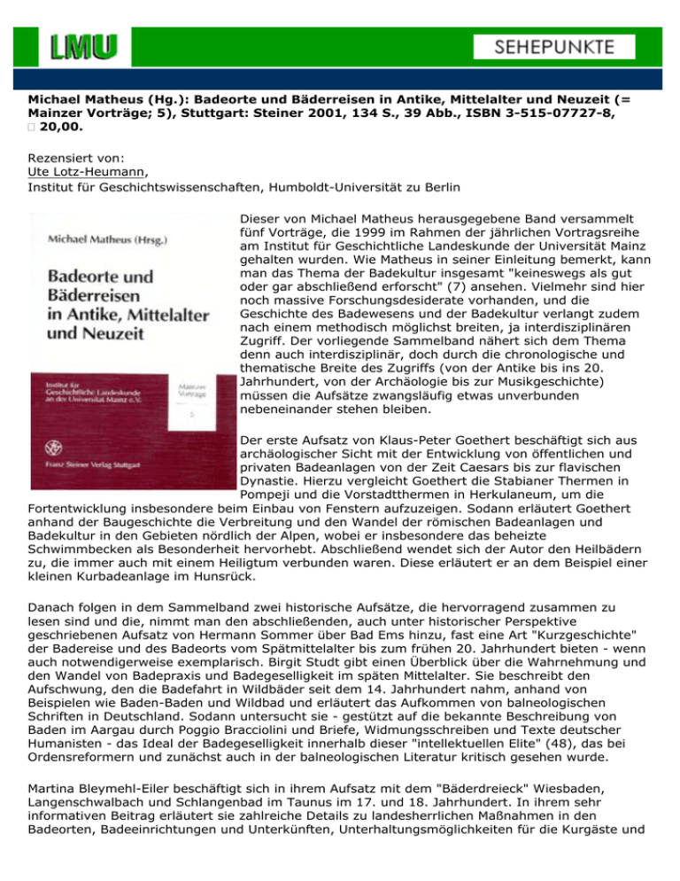 Michael Matheus (Hg.): Badeorte und Bäderreisen in Antike, Mittelalter und Neuzeit (= Mainzer Vorträge; 5), Stuttgart: Steiner 2001, 134 S., 39 Abb., ISBN 3-515-07727-8, 20,00. Rezensiert von: Ute Lotz-Heumann, Institut für Geschichtswissenschaften, Humboldt-Universität zu Berlin Dieser von Michael Matheus herausgegebene Band versammelt fünf Vorträge, die 1999 im Rahmen der jährlichen Vortragsreihe am Institut für Geschichtliche Landeskunde der Universität Mainz gehalten wurden. Wie Matheus in seiner Einleitung bemerkt, kann man das Thema der Badekultur insgesamt "keineswegs als gut oder gar abschließend erforscht" (7) ansehen. Vielmehr sind hier noch massive Forschungsdesiderate vorhanden, und die Geschichte des Badewesens und der Badekultur verlangt zudem nach einem methodisch möglichst breiten, ja interdisziplinären Zugriff. Der vorliegende Sammelband nähert sich dem Thema denn auch interdisziplinär, doch durch die chronologische und thematische Breite des Zugriffs (von der Antike bis ins 20. Jahrhundert, von der Archäologie bis zur Musikgeschichte) müssen die Aufsätze zwangsläufig etwas unverbunden nebeneinander stehen bleiben. Der erste Aufsatz von Klaus-Peter Goethert beschäftigt sich aus archäologischer Sicht mit der Entwicklung von öffentlichen und privaten Badeanlagen von der Zeit Caesars bis zur flavischen Dynastie. Hierzu vergleicht Goethert die Stabianer Thermen in Pompeji und die Vorstadtthermen in Herkulaneum, um die Fortentwicklung insbesondere beim Einbau von Fenstern aufzuzeigen. Sodann erläutert Goethert anhand der Baugeschichte die Verbreitung und den Wandel der römischen Badeanlagen und Badekultur in den Gebieten nördlich der Alpen, wobei er insbesondere das beheizte Schwimmbecken als Besonderheit hervorhebt. Abschließend wendet sich der Autor den Heilbädern zu, die immer auch mit einem Heiligtum verbunden waren. Diese erläutert er an dem Beispiel einer kleinen Kurbadeanlage im Hunsrück. Danach folgen in dem Sammelband zwei historische Aufsätze, die hervorragend zusammen zu lesen sind und die, nimmt man den abschließenden, auch unter historischer Perspektive geschriebenen Aufsatz von Hermann Sommer über Bad Ems hinzu, fast eine Art "Kurzgeschichte" der Badereise und des Badeorts vom Spätmittelalter bis zum frühen 20. Jahrhundert bieten - wenn auch notwendigerweise exemplarisch. Birgit Studt gibt einen Überblick über die Wahrnehmung und den Wandel von Badepraxis und Badegeselligkeit im späten Mittelalter. Sie beschreibt den Aufschwung, den die Badefahrt in Wildbäder seit dem 14. Jahrhundert nahm, anhand von Beispielen wie Baden-Baden und Wildbad und erläutert das Aufkommen von balneologischen Schriften in Deutschland. Sodann untersucht sie - gestützt auf die bekannte Beschreibung von Baden im Aargau durch Poggio Bracciolini und Briefe, Widmungsschreiben und Texte deutscher Humanisten - das Ideal der Badegeselligkeit innerhalb dieser "intellektuellen Elite" (48), das bei Ordensreformern und zunächst auch in der balneologischen Literatur kritisch gesehen wurde. Martina Bleymehl-Eiler beschäftigt sich in ihrem Aufsatz mit dem "Bäderdreieck" Wiesbaden, Langenschwalbach und Schlangenbad im Taunus im 17. und 18. Jahrhundert. In ihrem sehr informativen Beitrag erläutert sie zahlreiche Details zu landesherrlichen Maßnahmen in den Badeorten, Badeeinrichtungen und Unterkünften, Unterhaltungsmöglichkeiten für die Kurgäste und zum Verhältnis von Kurgästen und einheimischer Bevölkerung. Insgesamt kategorisiert sie die drei Badeorte nach ihrem Badepublikum: "Wiesbaden verkörpert stark vereinfacht gesagt das Kleinbürgerbad, Langenschwalbach das multiständische Bad und Schlangenbad das Fürstenbad." (79) Zudem hebt sie hervor, dass Badeorte nur auf Grund landesherrlicher Förderung wirklich erfolgreich sein konnten. Christoph-Hellmut Mahling konzentriert sich in seinem Aufsatz auf einen Aspekt des Badelebens, nämlich Konzert und Theater, wobei er - ungeachtet des Titels ("Residenzen des Glücks". Konzert Theater - Unterhaltungen in Kurorten des 19. und frühen 20. Jahrhunderts") - durchaus auch das 18. Jahrhundert in seine Darstellung mit einbezieht. Er zeigt, welch wichtige Rolle die Musik bereits seit dem Mittelalter für die Funktion von Kurorten als Stätten der Erholung und des Vergnügens hatte. Im 18. Jahrhundert brachten Adelige ihre Musiker mit in den Badeort, und Komponisten hatten dort die Möglichkeit, Stücke zu verkaufen und Kontakte zu knüpfen. Gegen Ende des 18. Jahrhunderts wurde dann der "öffentliche, bürgerliche Musikbetrieb" (86) immer wichtiger, und Stadtmusiker, Militärmusiker und "freie Ensembles" übernahmen die Konzessionen für die Kurmusik. Mahlig ordnet sodann die Kurmusik in den allgemeinen Zusammenhang der Unterhaltungsmöglichkeiten an Badeorten (Theater, Tanz, Glücksspiel et cetera) ein, die in hohem Maße ihre Popularität bestimmten. Abschließend erläutert er die Funktion der Badeorte als "Treffpunkte von ... musikalischen Eliten" (94) im 19. Jahrhundert und illustriert an einigen konkreten Orten das Musik-, Theater- und Opernprogramm dieser Zeit. Im letzten Aufsatz des Sammelbandes nimmt Hermann Sommer die Entwicklung von Bad Ems vom frühen 19. bis zum frühen 20. Jahrhundert in den Blick. Sommer analysiert den Aufstieg von Bad Ems zu einem Weltbad und die damit verbundenen architektonischen und infrastrukturellen Veränderungen. Daneben widmet er sich vor allem einer sozialgeschichtlichen Analyse der Badegäste, die er mit einer Periodisierung der Emser Geschichte verbindet. Das "Weltbad" Ems war bis über die Mitte des 19. Jahrhunderts stark von Ausländern (Franzosen, Russen, Engländern) frequentiert. Als "Kaiserbad" Wilhelms I. zog es zunächst viele Aristokraten an, das deutsche Bürgertum zog dann nach. Um 1900 entwickelte es sich jedoch zu einem "kleinbürgerlichen Bad mit dem Hautgout der Industriegesellschaft" (125), sodass die so genannten "Sozialgäste" "Kurgäste, deren Kur [
