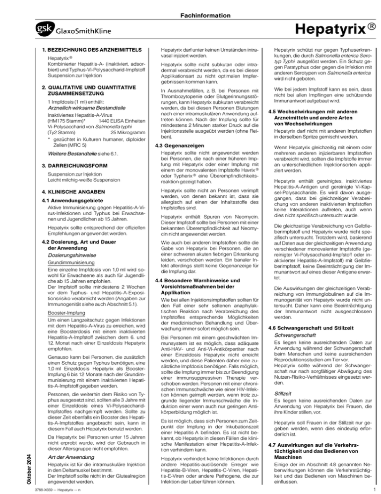 Fachinformation Hepatyrixy 1. BEZEICHNUNG DES ARZNEIMITTELS Hepatyrix y Kombinierter Hepatitis-A- (inaktiviert, adsorbiert) und Typhus-Vi-Polysaccharid-Impfstoff Suspension zur Injektion 2. QUALITATIVE UND QUANTITATIVE ZUSAMMENSETZUNG 1 Impfdosis (1 ml) enthält: Arzneilich wirksame Bestandteile Inaktiviertes Hepatitis-A-Virus (HM175 Stamm)* 1440 ELISA Einheiten Vi-Polysaccharid von Salmonella typhi (Ty2 Stamm) 25 Mikrogramm * gezüchtet in Kulturen humaner, diploider Zellen (MRC 5) Weitere Bestandteile siehe 6.1. 3. DARREICHUNGSFORM Suspension zur Injektion Leicht milchig-weiße Suspension 4. KLINISCHE ANGABEN 4.1 Anwendungsgebiete Aktive Immunisierung gegen Hepatitis-A-Virus-Infektionen und Typhus bei Erwachsenen und Jugendlichen ab 15 Jahren. Hepatyrix sollte entsprechend der offiziellen Empfehlungen angewendet werden. 4.2 Dosierung, Art und Dauer der Anwendung Dosierungshinweise Grundimmunisierung Eine einzelne Impfdosis von 1,0 ml wird sowohl für Erwachsene als auch für Jugendliche ab 15 Jahren empfohlen. Der Impfstoff sollte mindestens 2 Wochen vor dem Typhus- und Hepatitis-A-Expositionsrisiko verabreicht werden (Angaben zur Immunogenität siehe auch Abschnitt 5.1). Booster-Impfung Um einen Langzeitschutz gegen Infektionen mit dem Hepatitis-A-Virus zu erreichen, wird eine Boosterdosis mit einem inaktivierten Hepatitis-A-Impfstoff zwischen dem 6. und 12. Monat nach einer Einzeldosis Hepatyrix empfohlen. Genauso kann bei Personen, die zusätzlich einen Schutz gegen Typhus benötigen, eine 1,0 ml Einzeldosis Hepatyrix als BoosterImpfung 6 bis 12 Monate nach der Grundimmunisierung mit einem inaktivierten Hepatitis-A-Impfstoff gegeben werden. Personen, die weiterhin dem Risiko von Typhus ausgesetzt sind, sollten alle 3 Jahre mit einer Einzeldosis eines Vi-PolysaccharidImpfstoffes nachgeimpft werden. Sollte zu dieser Zeit ebenfalls ein Booster des Hepatitis-A-Impfstoffes angebracht sein, kann in diesem Fall auch Hepatyrix benutzt werden. Oktober 2004 Da Hepatyrix bei Personen unter 15 Jahren nicht erprobt wurde, wird der Gebrauch in dieser Altersgruppe nicht empfohlen. Art der Anwendung Hepatyrix ist für die intramuskuläre Injektion in den Deltamuskel bestimmt. Der Impfstoff sollte nicht in der Glutealregion angewendet werden. 3788-X659 -- Hepatyrix -- n Hepatyrix darf unter keinen Umständen intravasal injiziert werden. Hepatyrix sollte nicht subkutan oder intradermal verabreicht werden, da es bei dieser Applikationsart zu nicht optimalen Impfergebnissen kommen kann. In Ausnahmefällen, z. B. bei Personen mit Thrombozytopenie oder Blutgerinnungsstörungen, kann Hepatyrix subkutan verabreicht werden, da bei diesen Personen Blutungen nach einer intramuskulären Anwendung auftreten können. Nach der Impfung sollte für mindestens 2 Minuten starker Druck auf die Injektionsstelle ausgeübt werden (ohne Reiben). 4.3 Gegenanzeigen Hepatyrix sollte nicht angewendet werden bei Personen, die nach einer früheren Impfung mit Hepatyrix oder einer Impfung mit einem der monovalenten Impfstoffe Havrix y oder Typherix y eine Überempfindlichkeitsreaktion gezeigt haben. Hepatyrix sollte nicht an Personen verimpft werden, von denen bekannt ist, dass sie allergisch auf einen der Inhaltsstoffe des Impfstoffes sind. Hepatyrix enthält Spuren von Neomycin. Dieser Impfstoff sollte bei Personen mit einer bekannten Überempfindlichkeit auf Neomycin nicht angewendet werden. Wie auch bei anderen Impfstoffen sollte die Gabe von Hepatyrix bei Personen, die an einer schweren akuten fiebrigen Erkrankung leiden, verschoben werden. Ein banaler Infekt allerdings stellt keine Gegenanzeige für die Impfung dar. 4.4 Besondere Warnhinweise und Vorsichtsmaßnahmen bei der Applikation Wie bei allen Injektionsimpfstoffen sollten für den Fall einer sehr seltenen anaphylaktischen Reaktion nach Verabreichung des Impfstoffes entsprechende Möglichkeiten der medizinischen Behandlung und Überwachung immer sofort möglich sein. Bei Personen mit einem geschwächten Immunsystem ist es möglich, dass adäquate Anti-HAV- und Anti-Vi-Antikörpertiter nach einer Einzeldosis Hepatyrix nicht erreicht werden, und diese Patienten daher eine zusätzliche Impfdosis benötigen. Falls möglich, sollte die Impfung immer bis zur Beendigung einer immunsuppressiven Therapie verschoben werden. Personen mit einer chronischen Immunschwäche wie einer HIV-Infektion können geimpft werden, wenn trotz zugrunde liegender Immunschwäche die Induktion einer wenn auch nur geringen Antikörperbildung möglich ist. Es ist möglich, dass sich Personen zum Zeitpunkt der Impfung in der Inkubationszeit einer Hepatitis A befinden. Es ist nicht bekannt, ob Hepatyrix in diesen Fällen die klinische Manifestation einer Hepatitis-A-Infektion verhindern kann. Hepatyrix verhindert keine Infektionen durch andere Hepatitis-auslösende Erreger wie Hepatitis-B-Viren, Hepatitis-C-Viren, Hepatitis-E-Viren oder andere Pathogene, die zur Infektion der Leber führen können. Hepatyrix schützt nur gegen Typhuserkrankungen, die durch Salmonella enterica Serotyp Typhi ausgelöst werden. Ein Schutz gegen Paratyphus oder gegen die Infektion mit anderen Serotypen von Salmonella enterica wird nicht geboten. Wie bei jedem Impfstoff kann es sein, dass nicht bei allen Impflingen eine schützende Immunantwort aufgebaut wird. 4.5 Wechselwirkungen mit anderen Arzneimitteln und andere Arten von Wechselwirkungen Hepatyrix darf nicht mit anderen Impfstoffen in derselben Spritze gemischt werden. Wenn Hepatyrix gleichzeitig mit einem oder mehreren anderen injizierbaren Impfstoffen verabreicht wird, sollten die Impfstoffe immer an unterschiedlichen Injektionsorten appliziert werden. Hepatyrix enthält gereinigtes, inaktiviertes Hepatitis-A-Antigen und gereinigte Vi-Kapsel-Polysaccharide. Es wird davon ausgegangen, dass bei gleichzeitiger Verabreichung von anderen inaktivierten Impfstoffen keine Interaktionen auftreten, auch wenn dies nicht spezifisch untersucht wurde. Die gleichzeitige Verabrei
