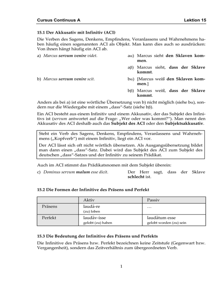 Cursus Continuus A Lektion 15 15.1 Der Akkusativ mit Infinitiv (ACI) Die Verben des Sagens, Denkens, Empfindens, Veranlassens und Wahrnehmens haben häufig einen sogenannten ACI als Objekt. Man kann dies auch so ausdrücken: Von ihnen hängt häufig ein ACI ab. aα) Marcus sieht den Sklaven kommen. a) Marcus servum venire videt. aβ) Marcus sieht, dass der Sklave kommt. bα) [Marcus weiß den Sklaven kommen.] b) Marcus servum venire scit. bβ) Marcus weiß, dass der Sklave kommt. Anders als bei a) ist eine wörtliche Übersetzung von b) nicht möglich (siehe bα), sondern nur die Wiedergabe mit einem „dass“-Satz (siehe bβ). Ein ACI besteht aus einem Infinitiv und einem Akkusativ, der das Subjekt des Infinitivs ist (servum antwortet auf die Frage: „Wer oder was kommt?“). Man nennt den Akkusativ des ACI deshalb auch das Subjekt des ACI oder den Subjektsakkusativ. Steht ein Verb des Sagens, Denkens, Empfindens, Veranlassens und Wahrnehmens („Kopfverb“) mit einem Infinitiv, liegt ein ACI vor. Der ACI lässt sich oft nicht wörtlich übersetzen. Als Ausgangsübersetzung bildet man dann einen „dass“-Satz. Dabei wird das Subjekt des ACI zum Subjekt des deutschen „dass“-Satzes und der Infinitiv zu seinem Prädikat. Auch im ACI stimmt das Prädikatsnomen mit dem Subjekt überein: c) Dominus servum malum esse dicit. Der Herr sagt, schlecht ist. dass der Sklave 15.2 Die Formen der Infinitive des Präsens und Perfekt Präsens Aktiv Passiv laudā-re … (zu) loben Perfekt laudāv-ísse laudātum esse gelobt (zu) haben gelobt worden (zu) sein 15.3 Die Bedeutung der Infinitive des Präsens und Perfekts Die Infinitive des Präsens bzw. Perfekt bezeichnen keine Zeitstufe (Gegenwart bzw. Vergangenheit), sondern das Zeitverhältnis zum übergeordneten Verb. 1 Lektion 15 Cursus Continuus A (Übergeordnetes Verb nennt man das Verb, von dem der Infinitiv abhängt: Bei dem Satz video te venire „Ich sehe, dass du kommst“ ist video das übergeordnete Verb zu venire, da der ACI te venire das Akkusativobjekt zu video ist.) 1. Ein Infinitiv Präsens drückt aus, dass die Handlung gleichzeitig zur Handlung des übergeordneten Verbs ist; er bezeichnet die Gleichzeitigkeit. a) Gaius Marcum venire dicit. Gaius sagt, dass Marcus kommt. [Konjunktiv: komme] b) Gaius Marcum venire dixit. Gaius sagte, dass Marcus kam. [Konjunktiv: komme] 2. Ein Infinitiv Perfekt drückt aus, dass die Handlung zeitlich vor der Handlung des übergeordneten Verbs liegt; er bezeichnet die Vorzeitigkeit. a) Gaius Marcum venisse dicit. Gaius sagt, dass Marcus gekommen ist [Konjunktiv: gekommen sei]. b) Gaius Marcum venisse dixit. Gaius sagte, dass Marcus gekommen war [Konjunktiv: gekommen sei]. 15.4 Die Verwendung des Reflexivpronomens und suus, a, um 1. Im einfachen Satz beziehen sich das Reflexivpronomen und suus, a, um auf das Subjekt. a) Marcus se laudat. Marcus lobt sich. b) Dominus servam suam laudat. Der Herr lobt seine Sklavin. 2. Im ACI können sich das Reflexivpronomen und suus, a, um sowohl auf das Subjekt des übergeordneten Verbs beziehen (übergeordnetes Verb nennt man das Verb, von dem der ACI abhängt) als auch auf das Subjekt des ACI (den Subjektsakkusativ). Wenn das Reflexivpronomen den Subjektsakkusativ darstellt (siehe Satz c und d), kann es sich nur auf das Subjekt des übergeordneten Verbs beziehen; in allen anderen Fällen (siehe Satz e) wird erst aufgrund des Zusammenhanges klar, wer gemeint ist. c) Dominus se servam laudavisse dicit. Der Herr sagt, dass er die Sklavin gelobt habe. d) Romani se cunctis populis praestare dixerunt. Die Römer sagten, dass sie alle Völker überträfen. e) Gaius Marcum a se laudatum esse dicit. eα) Gaius sagt, dass Marcus von ihm gelobt worden sei [se bezieht sich auf Gaius, das Sujekt von dicit, von dem der ACI abhängt]. eβ) Gaius sagt, dass Marcus von sich gelobt worden sei [= dass Marcus sich gelobt habe; se bezieht sich auf Marcum, den Subjektsakkusativ des ACI]. 2
