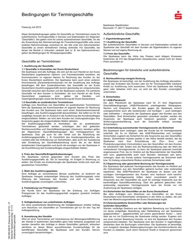 Bedingungen für Termingeschäfte Fassung Juli 2012 Diese Sonderbedingungen gelten für Geschäfte an Terminbörsen sowie für außerbörsliche Termingeschäfte in Devisen und Edelmetallen (im folgenden "Geschäfte"). Sie gelten nicht für solche außerbörslichen Geschäfte, für die die Anwendung des Rahmenvertrags für Finanztermingeschäfte oder eines anderen Rahmenvertrags vereinbart ist, der alle unter ihm dokumentierten Geschäfte zu einem einheitlichen Vertrag verbindet. Für Geschäfte, bei denen die Rechte in Urkunden verbrieft sind (z. B. bei Optionsscheinen), gelten die Bedingungen für Wertpapiergeschäfte. Geschäfte an Terminbörsen Sparkasse Saarbrücken Neumarkt 17, 66117 Saarbrücken Außerbörsliche Geschäfte 7. Eigenhändlergeschäft 7.1 Ausführung der Geschäfte Bei außerbörslichen Geschäften in Devisen und Edelmetallen schließt die Sparkasse das Geschäft mit dem Kunden als Eigenhändlerin im eigenen Namen und auf eigene Rechnung ab. 7.2 Preis des Geschäfts Die Sparkasse kann die Höhe des Preises nach billigem Ermessen bestimmen (§ 315 des Bürgerlichen Gesetzbuchs), soweit nicht ein fester Preis vereinbart ist. 1. Ausführung der Geschäfte 1.1 Geschäfte in Kontrakten der Eurex Deutschland Die Sparkasse wird alle Aufträge, die sich auf die zum Handel an der Eurex Deutschland zugelassenen Options- und Futureskontrakte beziehen, als Kommissionärin im eigenen Namen für Rechnung des Kunden an der Eurex Deutschland ausführen. Die Sparkasse kann auch einen anderen Kommissionär (Zwischenkommissionär) mit der Ausführung des Auftrags beauftragen. Mit dem Zustandekommen des Geschäfts an der Eurex Deutschland (Ausführungsgeschäft) kommt gleichzeitig ein entsprechendes Geschäft zwischen dem Kunden und der Sparkasse zustande. Für sämtliche Geschäfte mit dem Kunden in Kontrakten, die zum Handel an der Eurex Deutschland zugelassen sind, gelten die Handelsund Clearingbedingungen sowie die Börsenordnung der Eurex Deutschland. 1.2 Geschäfte an ausländischen Terminbörsen Aufträge zum Abschluss von Geschäften an ausländischen Terminbörsen führt die Sparkasse als Kommissionärin im eigenen Namen für Rechnung des Kunden aus. Die Sparkasse kann auch einen Zwischenkommissionär beauftragen, das Ausführungsgeschäft abzuschließen. Sie haftet nur für die sorgfältige Auswahl der im Ausland in die Ausführung des Kundenauftrages eingeschalteten Stellen; sie wird dem Kunden bei Leistungsstörungen ihre Ansprüche gegen die eingeschalteten Stellen abtreten. Die Ausführungsgeschäfte in Kontrakten, die an ausländischen Terminbörsen gehandelt werden, unterliegen den dort geltenden Rechtsvorschriften und Geschäftsbedingungen (Usancen); daneben gelten die Allgemeinen Geschäftsbedingungen des Vertragspartners der Sparkasse. Dies gilt auch für den Inhalt und die Abwicklung der Ausführungsgeschäfte, z. B. hinsichtlich des Ausübungszeitpunktes, der Laufzeit oder der Anforderung von Sicherheiten, aber auch der Aussetzung oder Einstellung der Geschäftsabwicklung durch die an der Börse bestehenden Clearingstellen und durch die sonstigen von der Sparkasse in die Durchführung des Kundenauftrages eingeschalteten Stellen. 2. Preis des Geschäfts/Entgelt/Aufwendungen Die Sparkasse rechnet gegenüber dem Kunden den Preis des Ausführungsgeschäfts ab. Sie ist berechtigt, ihr Entgelt in Rechnung zu stellen. Der Ersatz von Aufwendungen der Sparkasse richtet sich nach den gesetzlichen Vorschriften. 3. Wahl des Ausführungsplatzes Sind Aufträge an verschiedenen Börsen ausführbar, so bestimmt die Sparkasse mangels anderweitiger Weisung den Ausführungsplatz unter Wahrung der Interessen des Kunden und wird ihn über den Ausführungsplatz unverzüglich unterrichten. 160 050.000 D1 (Fassung Juli 2012) - V1 Deutscher Sparkassenverlag - f3 r1.0 Urheberrechtlich geschützt 4. Festsetzung von Preisgrenzen Der Kunde kann der Sparkasse bei der Erteilung von Aufträgen Preisgrenzen für das Ausführungsgeschäft vorgeben (preislich limitierte Aufträge). 5. Gültigkeitsdauer von unbefristeten Aufträgen Ein ohne ausdrückliche Bestimmung der Gültigkeitsdauer erteilter Auftrag zum Abschluss von Geschäften an Terminbörsen gilt nur für den Tag der Auftragserteilung. 6. Aussetzung des Handels Wird an einer Terminbörse auf Veranlassung der Börsengeschäftsführung der Handel in bestimmten Geschäften ganz oder teilweise ausgesetzt und werden daraufhin alle Aufträge in diesen Geschäften gelöscht, erlöschen sämtliche an dieser Börse auszuführenden Kundenaufträge für die betreffenden Geschäfte; die Sparkasse wird den Kunden hiervon unverzüglich benachrichtigen. Bestimmungen für börsliche und außerbörsliche Geschäfte 8. Nichtausführung mangels Deckung Die Sparkasse ist berechtigt, von der Ausführung des Auftrags abzusehen, soweit das Guthaben des Kunden oder ein für Termingeschäfte nutzbarer Kredit zur Ausführung nicht ausreichen. Führt die Sparkasse den Auftrag ganz oder teilweise nicht aus, so wird sie den Kunden unverzüglich unterrichten. 9. Sicherheiten 9.1 AGB-Pfandrecht Die dem Pfandrecht der Sparkasse nach Nr. 21 ihrer Allgemeinen Geschäftsbedingungen (AGB-Pfandrecht) unterliegenden Wertpapiere, Sachen und Ansprüche des Kunden gegen die Sparkasse sichern uneingeschränkt auch alle bestehenden und künftigen – auch bedingten oder befristeten – Ansprüche der Sparkasse gegen den Kunden aus den Geschäften. Sind Sicherheiten gesondert vereinbart worden, werden die Ansprüche der Sparkasse auch hierdurch gesichert, soweit die Sicherungszweckerklärung auch die Geschäfte erfasst (sonstige Sicherheiten). 9.2 Unterhaltung ausreichender Vermögenswerte als Sicherheit Die Sparkasse kann verlangen, dass der Kunde bei ihr Vermögenswerte unterhält, die ihr im Rahmen des AGB-Pfandrechtes und sonstiger Sicherheiten zugleich als Sicherheit für alle Ansprüche aus den Geschäften dienen. Sicherheiten müssen jeweils in der Höhe bestellt werden, die die
