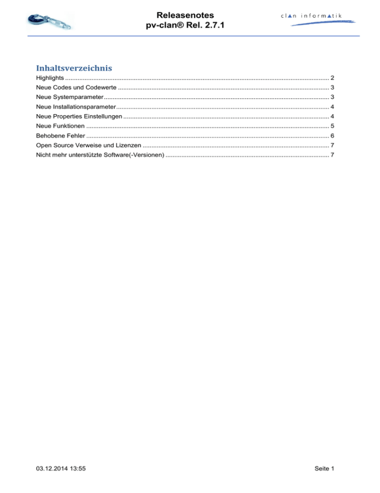 Releasenotes pv-clan® Rel. 2.7.1 Inhaltsverzeichnis Highlights ...................................................................................................................................................... 2 Neue Codes und Codewerte ........................................................................................................................ 3 Neue Systemparameter ................................................................................................................................ 3 Neue Installationsparameter ......................................................................................................................... 4 Neue Properties Einstellungen ..................................................................................................................... 4 Neue Funktionen .......................................................................................................................................... 5 Behobene Fehler .......................................................................................................................................... 6 Open Source Verweise und Lizenzen .......................................................................................................... 7 Nicht mehr unterstützte Software(-Versionen) ............................................................................................. 7 03.12.2014 13:55 Seite 1 Releasenotes pv-clan® Rel. 2.7.1 Highlights JIRA PV-1898 Zusammenfassung Suche unabhängig von Gross-/Kleinschreibung möglich Aktuell muss bei einer Sucheingabe, z.B. beim Namen, mit Gross- und Kleinbuchstaben gearbeitet werden. Neu ist es möglich, die Suche an bestimmten Stellen unabhängig von Gross-/Kleinschreibungen auszuführen. In einem solchen Fall wird sowohl "Müller" als auch "müller" gefunden. Die Suche unabhängig von Gross-/Kleinschreibung ist nicht automatisch aktiv und muss auf Wunsch konfiguriert und im Release kundenspezifisch eingebunden werden. Bitte wenden Sie sich bei Bedarf an Ihren Kundenbetreuer. 03.12.2014 13:55 Seite 2 Releasenotes pv-clan® Rel. 2.7.1 Neue Codes und Codewerte JIRA Schema Code Wert Beschreibung Neue Systemparameter JIRA Name 03.12.2014 13:55 Default Wert Beschreibung Seite 3 Releasenotes pv-clan® Rel. 2.7.1 Neue Installationsparameter Ist ein Installationsparameter nicht erfasst, zieht entweder der angekreuzte Default oder die Applikation verhaltet sich wie bis anhin. JIRA Name Default Wert Beschreibung Wert Beschreibung Neue Properties Einstellungen JIRA Name 03.12.2014 13:55 Seite 4 Releasenotes pv-clan® Rel. 2.7.1 Neue Funktionen JIRA Zusammenfassung Siehe Highlights 03.12.2014 13:55 Seite 5 Releasenotes pv-clan® Rel. 2.7.1 Behobene Fehler JIRA COM-1863 PV-1624 PV-1772 PV-1850 PV-1857 PV-1864 PV-1865 PV-1867 PV-1869 PV-1876 PV-1881 PV-1882 PV-1884 PV-1885 PV-1902 PV-1903 BASE-31 CLIEN-49 CLIEN-69 CLIEN-78 CLIEN-82 B-1815 B-1849 B-1878 S-365 S-391 Zusammenfassung Log-Entry: Zeitanzeige präziser als Sekunden, Sortierung Dynamische Queries Kurzname einer Adresse wird nur in Grossschrift gespeichert Anpassen Felder "Avisierung" und "Dienstvermerk" auf Zahlungsinfo-GUIs Rentenauszahlung mit Selektionsproblemen unter Oracle 11.2.0.4 Abschluss eines Rentenauslösers verhindern, nicht nur bei manuellem Sperrgrund Personenstammdaten sind, auch ohne aktiven Versicherten, im Rententeil nicht veränderbar Verbesserte Bedingung für Systemmeldung bei Rentenfreigabe in die Zukunft mit Lücken Fakturaerfassung: Fehlermeldungen erscheint wieder Mutationen von Personenstammdaten auf Rentenbezüger werden z.T. nicht gespeichert Fehlende Spalten für Todesdatum in History-GUIs Simulation: Fehler beim Zuweisen von bestimmten Versicherten Fehler beim Aufbereiten der FZ-OUT-Schnittstelle Simulation: Bei der Erfassung einer Buchung, welche manuell getätigt wird und ein Code als Wert zu Grunde liegt, kann keine Auswahl getroffen werden Fehler wenn Codewertbezeichnung vom Code "IBANSIZE" in mehreren Sprachen vorhanden ist Rentenzahlung: falsche QST-Angaben bei zwei Renten mit unterschiedlichen QST-Pflichtigkeiten Rentenlauf: Performanceverbesserung Ländereinstellungen im Windows können in der Anzeige zu falschen Zahlenformaten führen Meldung "Wollen Sie speichern" fehlt beim Löschen über Auswahlfenster Jahresabschluss aus Objekte - Mandant kommt auf Fehler Fensterbenennung in Simulation fehlerhaft History-Button auf Versicherten-GUI (Objekt Versicherte) funktioniert nicht Doppelte Mandanten nach OE-Übertritt eines Arbeitgebers in ein anderes Vorsorgewerk Zahlungsposition kann im CallCenter nicht mehr aufgerufen werden Das Erfassen einer OE-Einheit auf oberster Ebene ist fehlerhaft Fehler beim Erfassen von Ausland-IBAN-Nummern auf Zahlweise 29 Löschung Endbegünstigten Adresse mit Zahlweise 20 (Bank) muss möglich sein 03.12.2014 13:55 Seite 6 Releasenotes pv-clan® Rel. 2.7.1 Open Source Verweise und Lizenzen Die Produkte der clan Informatik ag enthalten Bausteine, die folgenden Lizenzen unterliegen: Lizenz Bibliotheken BSD Antlr W3C Source License DOM-Level 3 API Lesser General Public Tiny LAF License, Version 2.1 unknown TableLayout The Apache Software Apache FOP, Apache Log4j, Apache XML Graphics Commons, Avalon Framework API, Avalon Framework Implementation, Barcode4J, Batik License, Version 2.0 AWT utilities, Batik CSS engine, Batik DOM implementation, Batik GUI utility classes, Batik GVT (Graphics Vector Tree), Batik Java2D SVG generator, Batik SVG DOM implementation, Batik SVG Swing components, Batik SVG microsyntax parser library, Batik SVG transcoder classes, Batik XML utility library, Batik animation engine, Batik bridge classes, Batik extension classes, Batik external code, Batik scripting language classes, Batik utility library, IO, Lang, Logging, XML Commons External Components XML APIs, XML Commons External Components XML APIs Extensions, Xalan Java, Xalan Java Serializer clan Informatik ag, clan, client, database-common, 