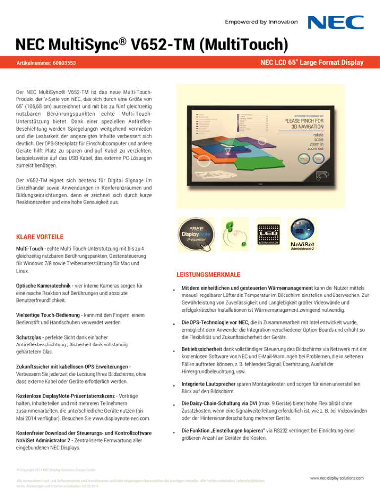 NEC MultiSync® V652-TM (MultiTouch) NEC LCD 65" Large Format Display Artikelnummer: 60003553 Der NEC MultiSync® V652-TM ist das neue Multi-TouchProdukt der V-Serie von NEC, das sich durch eine Größe von 65" (106,68 cm) auszeichnet und mit bis zu fünf gleichzeitig nutzbaren Berührungspunkten echte Multi-TouchUnterstützung bietet. Dank einer speziellen AntireflexBeschichtung werden Spiegelungen weitgehend vermieden und die Lesbarkeit der angezeigten Inhalte verbessert sich deutlich. Der OPS-Steckplatz für Einschubcomputer und andere Geräte hilft Platz zu sparen und auf Kabel zu verzichten, beispielsweise auf das USB-Kabel, das externe PC-Lösungen zumeist benötigen. Der V652-TM eignet sich bestens für Digital Signage im Einzelhandel sowie Anwendungen in Konferenzräumen und Bildungseinrichtungen, denn er zeichnet sich durch kurze Reaktionszeiten und eine hohe Genauigkeit aus. KLARE VORTEILE Multi-Touch - echte Multi-Touch-Unterstützung mit bis zu 4 gleichzeitig nutzbaren Berührungspunkten, Gestensteuerung für Windows 7/8 sowie Treiberunterstützung für Mac und Linux. Optische Kameratechnik - vier interne Kameras sorgen für eine rasche Reaktion auf Berührungen und absolute Benutzerfreundlichkeit. LEISTUNGSMERKMALE • Vielseitige Touch-Bedienung - kann mit den Fingern, einem Bedienstift und Handschuhen verwendet werden. Mit dem einheitlichen und gesteuerten Wärmemanagement kann der Nutzer mittels manuell regelbarer Lüfter die Temperatur im Bildschirm einstellen und überwachen. Zur Gewährleistung von Zuverlässigkeit und Langlebigkeit großer Videowände und erfolgskritischer Installationen ist Wärmemanagement zwingend notwendig. • Schutzglas - perfekte Sicht dank einfacher Antireflexbeschichtung ; Sicherheit dank vollständig gehärtetem Glas. Die OPS-Technologie von NEC, die in Zusammenarbeit mit Intel entwickelt wurde, ermöglicht dem Anwender die Integration verschiedener Option-Boards und erhöht so die Flexibilität und Zukunftssicherheit der Geräte. • Betriebssicherheit dank vollständiger Steuerung des Bildschirms via Netzwerk mit der kostenlosen Software von NEC und E-Mail-Warnungen bei Problemen, die in seltenen Fällen auftreten können, z. B. fehlendes Signal, Überhitzung, Ausfall der Hintergrundbeleuchtung, usw. • Integrierte Lautsprecher sparen Montagekosten und sorgen für einen unverstellten Blick auf den Bildschirm. • Die Daisy-Chain-Schaltung via DVI (max. 9 Geräte) bietet hohe Flexibilität ohne Zusatzkosten, wenn eine Signalweiterleitung erforderlich ist, wie z. B. bei Videowänden oder der Hintereinanderschaltung mehrerer Geräte. • Die Funktion „Einstellungen kopieren“ via RS232 verringert bei Einrichtung einer größeren Anzahl an Geräten die Kosten. Zukunftssicher mit kabellosen OPS-Erweiterungen Verbessern Sie jederzeit die Leistung Ihres Bildschirms, ohne dass externe Kabel oder Geräte erforderlich werden. Kostenlose DisplayNote-Präsentationslizenz - Vorträge halten, Inhalte teilen und mit mehreren Teilnehmern zusammenarbeiten, die unterschiedliche Geräte nutzen (bis Mai 2014 verfügbar). Besuchen Sie www.displaynote-nec.com. Kostenfreier Download der Steuerungs- und Kontrollsoftware NaViSet Administrator 2 - Zentralisierte Fernwartung aller eingebundenen NEC Displays. © Copyright 2014 NEC Display Solutions Europe GmbH. Alle verwendeten Hard- und Softwarenamen sind Handelsnamen und/oder eingetragene Warenzeichen der jeweiligen Hersteller. Alle Rechte vorbehalten. Liefermöglichkeiten, techn. Änderungen und Irrtümer vorbehalten. 03.02.2014 www.nec-display-solutions.com NEC MultiSync® V652-TM (MultiTouch) TECHNISCHE SPEZIFIKATIONEN NEC MultiSync® V652-TM (MultiTouch) DISPLAY Panel Technologie 1.428,5 x 803,5 Größe [Zoll/cm] 64,5 / 163,9 Seitenverhältnis 16:9 Helligkeit (Lieferung) [cd/m2] 320, (450 max.) Kontrastverhältnis (typ.) 4000:1 Betrachtungswinkel [°] 89 horizontal / 89 vertikal (typ. bei Kontrastverhältnis 10:1) Reaktionszeit (typ.) [ms] 8 (grey-to-grey) Bildwiederholungsfrequenz [Hz] 60 SYNCHRONISATIONSRATE Horizontalfrequenz [kHz] 1. RGB/HV IN [R, G, B, H, V] (BNC) 2. DISPLAYPORT connector 3. HDMI connector 4. DVI connector (DVI-D) 5. VGA IN (mini D-Sub 15 pin) 6. VIDEO1 IN connector (BNC) 7. LAN port (RJ-45) 8. RS-232C (D-Sub 9 pin) 9. REMOTE IN (Black) 10. AUDIO OUT (Blue) 11. AUDIO IN 1 (Blue) 12. EXTERNAL SPEAKER TERMINAL 13. Internal/External speaker switch BESONDERE EIGENSCHAFTEN Automatische Alarm-E-Mails, Benutzerdefinierte Input - Priorität, Bildschirmschoner-Funktionen, DICOM-Unterstützung, Erweiterte Lüftersteuerung, FREE DisplayNote Presenter, Hardwarebasierte Farbkalibrierung möglich, kopieren der Bildschirmeinstellungen durch eine RS232 Schnittstelle, Matrixspeicher, Namen des Eingangs anpassen, PIN als Diebstahlsicherung, Schnelle InputÄnderung, TileMatrix (10 x 10), Verschiedene Bild-im-BildOptionen, Zeitplaner Bildfrequenz [Hz] AUFLÖSUNG Native Auflösung Materialeinsparungen optionale Standfüsse; Handbücher auf CD 25,2 - 85 1920 x 1080 bei 60 Hz 1920 x 1080; 1680 x 1050; 1600 x 1200; 1400 x 1050; 1366 x 786; 1280 x 1024; 1280 x 960; 1280 x 800; 1280 x 768; 1280 x 720; 1024 x 768; 800 x 600; 720 x 576; 720 x 400; 640 x 480 Supported on digital inputs (Video) 1920 x 1080i (59.94/60)16:9; 1920 x 1080i (50)16:9; 1920 x 1080p (59.94/60) 16:9; 1920 x 1080p (50)16:9; 1920 x 1080p (23.97/24)16:9; 1920 x 1080p (25) 16:9; 1920 x 1080p (29.97/30)16:9; 1280 x 720p (59.94/60)16:9; 1280 x 720p (50) 16:9; 720 x 576p (50)16:9; 720 x 480p (59.94/60)16:9 KONNEKTIVITÄT Analoger Videoeingang 1 x D-sub 15 pin; Composite (BNC); RGBHV für Computer und Komponenten-/ Kompositvideo (BNC) Digitaler Videoeingang 1 x DVI-D (mit HDCP); 1 x HDMI 1.3 (HDCP); 1 x DisplayPort (HDCP) Analoger Audioeingang 1 x 3,5 mm jack Digitaler Audioeingang DisplayPort; 1 x HDMI Eingangssignalsteuerung Fernbedienungskabel (3,5 mm-Buchse); LAN 100 Mbit; RS232 Digitaler Videoausgang 1 x DVI-D (HDCP) Analoger Audioausgang 3,5 