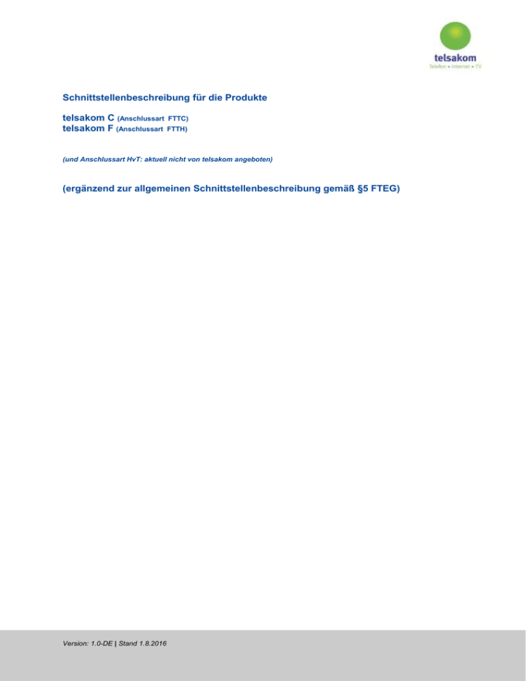 Schnittstellenbeschreibung für die Produkte telsakom C (Anschlussart FTTC) telsakom F (Anschlussart FTTH) (und Anschlussart HvT: aktuell nicht von telsakom angeboten) (ergänzend zur allgemeinen Schnittstellenbeschreibung gemäß §5 FTEG) Version: 1.0-DE | Stand 1.8.2016 Schnittstellenbeschreibung für telsakom Produkte 1 Das Endgerät der telsakom wird verwendet (Anwendungsfall 1) Das Endgerät wird von telsakom für die Vertragsdauer bereitgestellt. Alle für die Nutzung der vertraglich zugesicherten Leistungen notwendigen Einstellungen werden durch ein automatisches Netzmanagement durchgeführt. Hierfür wird das Protokoll TR-069 verwendet. Der Betrieb, die korrekte Konfiguration und die Aktualisierung der Software liegen im Verantwortungsbereich der telsakom. 1.1 Schnittstellen und Verantwortungsbereiche Verantwortungsbereich der telsakom Verantwortungsbereich des Kunden Anschlussart FTTC VDSL 1.TAE S0-Schnittstelle + analoge Schnittstelle KVz + DSLAM Kernnetz des Netzbetreibers Ethernet-Schnittstelle Ethernet ONT Anschlussart FTTH Telefonanschluss: Der beauftragte Telefonanschluss wird von telsakom sowohl an der S0-Schnittstelle als auch an der analogen Schnittstelle des Endgerätes bereitgestellt. telsakom ist nicht verantwortlich für Konfiguration und Betrieb der im Verantwortungsbereich des Kunden angeschlossenen Kundengeräte (z.B. PCs oder Telefone). S0-Schnittstelle: elektrische (RJ45-Buchse), S0-Bus-Schnittstelle nach ITU-T I.430. Der Mehrgeräteanschluss (Punkt zu Mehrpunkt) wird auf Grundlage der Empfehlungen ITU-T Q.921 und ITU-T Q.931 bereitgestellt. analoge Schnittstelle: Die analoge Schnittstelle wird nach 1TR110-1 an einer RJ11- und einer TAE-Buchse bereitgestellt. Internetanschluss: Die Nutzung der Internetverbindung erfolgt über die integrierte elektrische Ethernet-Schnittstelle gemäß der IEEE 802.3 Standardisierung. Die IP-Adressvergabe an IP-Endgeräte des Kunden erfolgt per DHCP nach RFC2131. Version: 1.0-DE | Stand 1.8.201 Schnittstellenbeschreibung für telsakom Produkte 2 Ein kundeneigenes Endgerät wird verwendet (Anwendungsfall 2) Der Kunde hat die Möglichkeit sein eigenes Endgerät an die Übergabeschnittstellen der telsakom anzuschließen und damit die beauftragten Dienste (Telefon und Internet) zu nutzen. Das Endgerät wird in diesem Fall vom Kunden bereitgestellt. Der Betrieb, die korrekte Konfiguration und die Aktualisierung der Software liegen im Verantwortungsbereich des Kunden. Insbesondere obliegt der Schutz des Endgerätes und der Zugangsdaten vor Missbrauch dem Kunden. 2.1 Schnittstellen und Verantwortungsbereiche Verantwortungsbereich der telsakom Verantwortungsbereich des Kunden Anschlussart FTTC VDSL KVz+ DSLAM 1.TAE S0-Schnittstelle analoge Schnittstelle Kernnetz des Netzbetreibers EthernetSchnittstelle Ethernet ONT Anschlussart FTTH 2.1.1 Anschlussart FTTC Die Übergabe der beauftragten Dienste erfolgt an der 1.TAE im Gebäude des Kunden. Die Verantwortung der telsakom endet dort. Das verwendete Endgerät muss entweder „Vectoring friendly“ sein oder die Vectoring Technologie vollständig unterstützen. Ist dies nicht der Fall, so kann die maximale Bandbreite durch die telsakom auf maximal 16Mbit/s limitiert werden um die Störung anderer Kundenanschlüsse zu vermeiden. Die Dienste werden technisch wie folgt übergeben: Netzschicht gemäß ISO-OSI-Referenzmodell Verwendete Technik / Protokoll / Beschreibung 5,6,7 Signalisierung: beliebige Anwendungen Kommunikationssteuerung ,Darstellung, SIP Session Initiation Protocol Anwendung (RFC3261) Transport der Audiodaten: RTP Real-Time Transport Protocol (RFC3550) 4 Transport UDP(RFC768) beliebige TCP- und UDP Verbindungen zur Internetnutzung 3 Vermittlung ICMP,IP,IGMP IP-Adressvergabe nach DHCPv4 (RFC2131) TCP(RFC1323) und UDP(RFC768) 2 Sicherung Ethernet nach IEEE802.1q Ethernet nach IEEE802.1q VLAN 232: Sprachdaten VLAN 132: Internetdaten EFM (IEEE802.3ah) 1 Bitübertragung VDSL2+ (ITU-T G.993.2) / VDSL2-Vectoring (ITU-T G993.5) physikalischer Zugang: 2-Draht-Verbindung als TAE-Anschlussdose (Pin1+2) bzw. als RJ45-Buchse (Pin 4+5) Version: 1.0-DE | Stand 1.8.201 Schnittstellenbeschreibung für telsakom Produkte 2.1.2 Anschlussart FTTH Die Übergabe der beauftragten Dienste erfolgt am optischen Netzabschluss (ONT= Optical Network Termination) des Netzanbieters. Die Verantwortung des Netzbetreibers endet dort. Die Dienste werden technisch wie folgt übergeben: Netzschicht gemäß ISO-OSI-Referenzmodell Verwendete Technik / Protokoll / Beschreibung Dienst: Telefonie Dienst: Internet 5 ,6,7 Kommunikationssteuerung, Signalisierung: beliebige TCP- und UDP Darstellung, Anwendung SIP Session Initiation Protocol Verbindungen zur Internetnutzung (RFC3261) Transport der Audiodaten: RTP Real-Time Transport Protocol (RFC3550) 4 Transport UDP(RFC768) TCP(RFC 1323) UDP(RFC 768) 3 Vermittlung ICMP,IP,IGMP TCP(RFC1323) und DP(RFC768) IP-Adressvergabe nach DHCPv4 (RFC2131) 2 Sicherung 1 Bitübertragung Ethernet nach IEEE802.1q Ethernet nach IEEE802.1q VLAN 232: Sprachdaten VLAN132 Internetdaten Übergabe am ONT (Optical Network Termination) des Anbieters: an einem RJ45-Port (10/100/1000Base-T, IEEE802.3) 2.1.3 VoIP-Zugangsdaten für die Nutzung des Telefonanschlusses (FTTC und FTTH): Die VoIP-Zugangsdaten sind für die Nutzung des Telefonanschlusses zwingend erforderlich. Es können alle VoIP-Endgeräte angeschlossen werden die zu den oben genannten Protokollen kompatibel sind. SIP-Login 06811234567 SIP-Domain/Realm domain.de SIP-Passwort alphanumerisches Passwort (15 Stellen) Registrar-IP IPv4-Adresse des Registrars (z.B. 172.21.1.1) Parameter für die Sprachverbindungen Paketisierungszeit (ptime) 20ms Codec für die Sprachübertragung G711-A-Law DTMF-Signalisierung: Inband Faxverbindungen T38 oder G711-A-Law minimale Registrierungszeit 600s CLIR RFC3325 Die hervorgehobenen persönlichen Zugangsdaten werden Ihnen in einem Schreiben gesondert mitgeteilt. Version: 1.0-DE | Stand 1.8.201 Schnittstellenbeschr