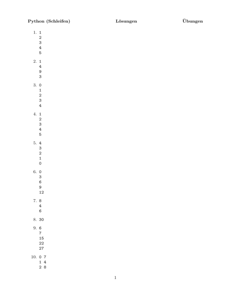 Python (Schleifen) Lösungen 1. 1 2 3 4 5 2. 1 4 9 3 3. 0 1 2 3 4 4. 1 2 3 4 5 5. 4 3 2 1 0 6. 0 3 6 9 12 7. 8 4 6 8. 30 9. 6 7 15 22 27 10. 0 7 1 4 2 8 1 Übungen 11. 66 12. 89 13. 5 4 36 14. 9 15. 2 2 2 3 3 3 4 4 4 4 5 6 4 5 6 4 5 6 16. [28, 12, 32, 49, 21, 56] 17. 18. 2 3 19. 5 20. [1, 1, 2, 3, 5, 8, 13] 2