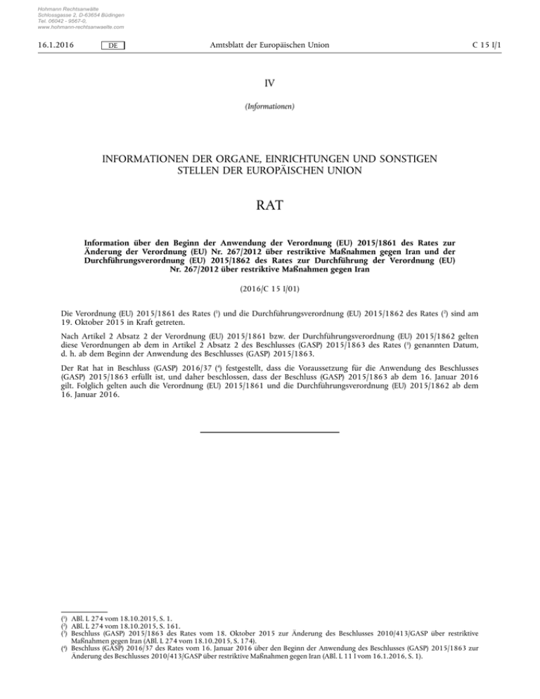 Hohmann Rechtsanwälte Schlossgasse 2, D-63654 Büdingen Tel. 06042 - 9567-0, www.hohmann-rechtsanwaelte.com 16.1.2016 DE Amtsblatt der Europäischen Union C 15 I/1 IV (Informationen) INFORMATIONEN DER ORGANE, EINRICHTUNGEN UND SONSTIGEN STELLEN DER EUROPÄISCHEN UNION RAT Information über den Beginn der Anwendung der Verordnung (EU) 2015/1861 des Rates zur Änderung der Verordnung (EU) Nr. 267/2012 über restriktive Maßnahmen gegen Iran und der Durchführungsverordnung (EU) 2015/1862 des Rates zur Durchführung der Verordnung (EU) Nr. 267/2012 über restriktive Maßnahmen gegen Iran (2016/C 15 I/01) Die Verordnung (EU) 2015/1861 des Rates (1) und die Durchführungsverordnung (EU) 2015/1862 des Rates (2) sind am 19. Oktober 2015 in Kraft getreten. Nach Artikel 2 Absatz 2 der Verordnung (EU) 2015/1861 bzw. der Durchführungsverordnung (EU) 2015/1862 gelten diese Verordnungen ab dem in Artikel 2 Absatz 2 des Beschlusses (GASP) 2015/1863 des Rates (3) genannten Datum, d. h. ab dem Beginn der Anwendung des Beschlusses (GASP) 2015/1863. Der Rat hat in Beschluss (GASP) 2016/37 (4) festgestellt, dass die Voraussetzung für die Anwendung des Beschlusses (GASP) 2015/1863 erfüllt ist, und daher beschlossen, dass der Beschluss (GASP) 2015/1863 ab dem 16. Januar 2016 gilt. Folglich gelten auch die Verordnung (EU) 2015/1861 und die Durchführungsverordnung (EU) 2015/1862 ab dem 16. Januar 2016. (1) ABl. L 274 vom 18.10.2015, S. 1. (2) ABl. L 274 vom 18.10.2015, S. 161. (3) Beschluss (GASP) 2015/1863 des Rates vom 18. Oktober 2015 zur Änderung des Beschlusses 2010/413/GASP über restriktive Maßnahmen gegen Iran (ABl. L 274 vom 18.10.2015, S. 174). (4) Beschluss (GASP) 2016/37 des Rates vom 16. Januar 2016 über den Beginn der Anwendung des Beschlusses (GASP) 2015/1863 zur Änderung des Beschlusses 2010/413/GASP über restriktive Maßnahmen gegen Iran (ABl. L 11 I vom 16.1.2016, S. 1).