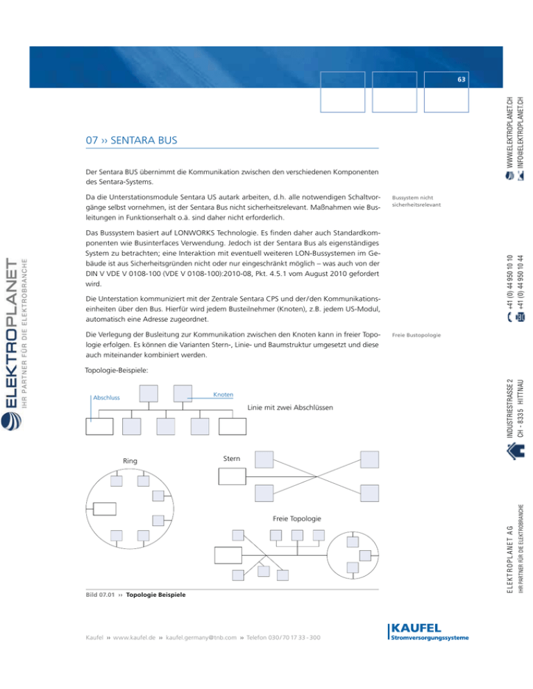 WWW.ELEKTROPLANET.CH INFO@ELEKTROPLANET.CH 63 07 ›› SENTARA BUS Der Sentara BUS übernimmt die Kommunikation zwischen den verschiedenen Komponenten des Sentara-Systems. Da die Unterstationsmodule Sentara US autark arbeiten, d.h. alle notwendigen Schaltvorgänge selbst vornehmen, ist der Sentara Bus nicht sicherheitsrelevant. Maßnahmen wie Busleitungen in Funktionserhalt o.ä. sind daher nicht erforderlich. Bussystem nicht sicherheitsrelevant +41 (0) 44 950 10 10 +41 (0) 44 950 10 44 Das Bussystem basiert auf LONWORKS Technologie. Es finden daher auch Standardkomponenten wie Businterfaces Verwendung. Jedoch ist der Sentara Bus als eigenständiges System zu betrachten; eine Interaktion mit eventuell weiteren LON-Bussystemen im Gebäude ist aus Sicherheitsgründen nicht oder nur eingeschränkt möglich – was auch von der DIN V VDE V 0108-100 (VDE V 0108-100):2010-08, Pkt. 4.5.1 vom August 2010 gefordert wird. Die Unterstation kommuniziert mit der Zentrale Sentara CPS und der/den Kommunikationseinheiten über den Bus. Hierfür wird jedem Busteilnehmer (Knoten), z.B. jedem US-Modul, automatisch eine Adresse zugeordnet. Die Verlegung der Busleitung zur Kommunikation zwischen den Knoten kann in freier Topologie erfolgen. Es können die Varianten Stern-, Linie- und Baumstruktur umgesetzt und diese auch miteinander kombiniert werden. Freie Bustopologie Knoten Linie mit zwei Abschlüssen Ring Stern Bild 07.01 ›› Topologie Beispiele Kaufel ›› www.kaufel.de ›› kaufel.germany@tnb.com ›› Telefon 030 / 70 17 33 - 300 ELEKTROPLANET AG Freie Topologie IHR PARTNER FÜR DIE ELEKTROBRANCHE Abschluss INDUSTRIESTRASSE 2 CH - 8335 HITTNAU Topologie-Beispiele: 64 Verschiedene Bus-Topologien Die dargestellten Abschlüsse des Busses sind bereits in den jeweiligen Sentara-Komponenten (Sentara CPS und Sentara Routebus) enthalten. WWW.ELEKTROPLANET.CH INFO@ELEKTROPLANET.CH Planungsgrundlagen Sicherheitsbeleuchtung Empfohlene Leitungen und die zugehörigen maximalen Leitungslängen entnehmen Sie bitte der nachfolgenden Tabelle. Max. Busleitungslängen KABEL BUS (ALS LINIE MIT ZWEI ABSCHLUSSWIDERSTÄNDEN) FREIE TOPOLOGIE Knoten zu Knoten* Absolute Länge 900 m 320 m 500 m alternativ Cat5 0,51mm 24 AWG 900 m 250 m 450 m Belden 1,3 mm 16 AWG 2700 m 400 m 500 m Level 4 0,65 mm 22 AWG 1400 m 400 m 500 m +41 (0) 44 950 10 10 +41 (0) 44 950 10 44 empfohlen J-Y(st)Y 2 x 2 x 0.8 20 AWG *Knoten: Sentara CPS/Sentara US / Sentara mobile Werden die in der Tabelle aufgeführten Bus-Leitungslängen je Kanal erreicht oder ist die Knotenanzahl größer als 64, können durch den Einsatz von sogenannten Routern weitere Kanäle geschaffen werden. Im Zusammenhang mit dem Aufbau der Busstruktur sind also folgende Punkte zu überprüfen: Sentara Routebus (Repeater) Max. 255 Knoten / System Erweiterung mittels Sentara Routebus Busabschluss ›› Übersteigt die Anzahl Knoten die 64, d.h. üblicherweise bei mehr als 62 Unterstationen Sentara US, muss die Option „Routebus“ eingesetzt werden. Ein Sentara-System ist insgesamt erweiterbar auf bis zu 255 Knoten. ›› In Abhängigkeit der eingesetzten Bustopologie: Übersteigt die maximal zwischen 2 Knoten auftretende Buskabellänge die o.g. Länge, muss die Option „Routebus“ eingesetzt werden. ›› In Abhängigkeit der eingesetzten Bustopologie: Übersteigt die absolute Buskabellänge (gesamte Länge aufsummiert) die o.g. Länge, muss die Option „Routebus“ eingesetzt werden. Die in der Darstellung der Topologie-Beispiele gezeigten Abschlüsse des Busses sind bereits in den jeweiligen Sentara-Komponenten (Sentara CPS und Sentara Routebus) enthalten. Im Falle einer Linie ohne Einsatz der Option Routebus muss jedoch der zweite Abschluss zusätzlich berücksichtigt werden. Kaufel ›› www.kaufel.de ›› kaufel.germany@tnb.com ›› Telefon 030 / 70 17 33 - 300 IHR PARTNER FÜR DIE ELEKTROBRANCHE Es können maximal 64 Knoten auf einem Kanal gleichzeitig arbeiten. ELEKTROPLANET AG Max. 64 Knoten / Kanal INDUSTRIESTRASSE 2 CH - 8335 HITTNAU Tabelle 07.01 ›› Maximale Leitungslängen Sentara Bus