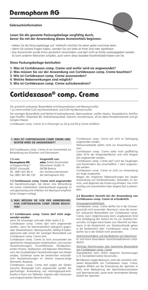 Dermapharm AG Gebrauchsinformation Lesen Sie die gesamte Packungsbeilage sorgfältig durch, bevor Sie mit der Anwendung dieses Arzneimittels beginnen. – Heben Sie die Packungsbeilage auf. Vielleicht möchten Sie diese später nochmals lesen. – Wenn Sie weitere Fragen haben, wenden Sie sich bitte an Ihren Arzt oder Apotheker. – Das Arzneimittel wurde Ihnen persönlich verschrieben und darf nicht an Dritte weitergegeben werden. Es kann anderen Menschen schaden, auch wenn diese dasselbe Krankheitsbild haben wie Sie. Diese Packungsbeilage beinhaltet: 1. Was ist Cortidexason comp. Creme und wofür wird sie angewendet? 2. Was müssen Sie vor der Anwendung von Cortidexason comp. Creme beachten? 3. Wie ist Cortidexason comp. Creme anzuwenden? 4. Welche Nebenwirkungen sind möglich? 5. Wie ist Cortidexason comp. Creme aufzubewahren? Cortidexason® comp. Creme Die arzneilich wirksamen Bestandteile sind Dexamethason und Neomycinsulfat. 1 g Creme enthält 0,20 mg Dexamethason und 5,00 mg Neomycinsulfat. Die sonstigen Bestandteile sind Methyl-4-hydroxybenzoat, Natriumedetat, weißes Vaselin, Stearylalkohol, dickflüssiges Paraffin, Polysorbat 80, Sorbitansesquioleat, Glycerol, Ascorbinsäure, all-rac-alpha-Tocopherolacetat und gereinigtes Wasser. Cortidexason comp. Creme ist in Packungen zu 20 g und 50 g Creme erhältlich. 1. WAS IST CORTIDEXASON COMP. CREME UND WOFÜR WIRD SIE ANGEWENDET? 1.1 Cortidexason comp. Creme ist ein Arzneimittel zur Behandlung von Ekzemen und Dermatosen. 1.2 von: Dermapharm AG Lil-Dagover-Ring 7 82031 Grünwald Tel.: 089 / 641 86- 0 Fax: 089 / 641 86-130 hergestellt von: mibe GmbH Arzneimittel Münchener Straße 15 06796 Brehna (ein Tochterunternehmen der Dermapharm AG) 1.3 Cortidexason comp. Creme wird angewendet bei Hauterkrankungen, bei denen eine Behandlung mit einem mittelstarken Glukokortikoid angezeigt ist und gleichzeitig eine Infektion mit Neomycin-empfindlichen Erregern vorliegt. 2. WAS MÜSSEN SIE VOR DER ANWENDUNG VON CORTIDEXASON COMP. CREME BEACHTEN? 2.1 Cortidexason comp. Creme darf nicht angewendet werden wenn Sie schwanger sind oder stillen (siehe 2.2). Cortidexason comp. Creme darf nicht angewendet werden, wenn Sie überempfindlich (allergisch) gegenüber Dexamethason, Neomycinsulfat, Methyl-4-hydroxybenzoat oder einem der sonstigen Bestandteile von Cortidexason comp. Creme sind. Cortidexason comp. Creme ist nicht anzuwenden bei spezifischen Hautprozessen (tuberkulösen und luischen Hauterkrankungen), Virusinfektionen, Windpocken, echten Pocken, Impfpocken und Mykosen (Pilzinfektionen), bei virusbedingten Hauterkrankungen wie Herpes simplex, Gürtelrose sowie bei bestimmten entzündlichen Hauterkrankungen im Gesicht (rosacea-artige Dermatitis, Rosacea). Cortidexason comp. Creme darf wegen der Gefahr toxischer Blutspiegel nicht angewendet werden bei gleichzeitiger Anwendung von Aminoglykosid-Antibiotika in Form von Tabletten, Kapseln oder Infusionen und eingeschränkter Nierenfunktion. Cortidexason comp. Creme soll nicht im Gehörgang angewendet werden. Okklusivverbände sollten nicht zur Anwendung kommen. Cortidexason comp. Creme sollte nicht großflächig (über 20 % der Körperoberfläche) und nicht längere Zeit angewendet werden. Cortidexason comp. Creme darf nicht bei Säuglingen und Kleinkindern (bis einschließlich 1 Jahr) angewendet werden. Cortidexason comp. Creme ist nicht zur Anwendung am Auge vorgesehen. Wegen der möglichen Nebenwirkungen bei lokaler Anwendung von Kortikosteroiden, besonders im Gesicht, wird allgemein die Forderung erhoben, hier nicht unnötig und unkontrolliert über längere Zeit zu behandeln. 2.2 Besondere Vorsicht bei der Anwendung von Cortidexason comp. Creme ist erforderlich: Schwangerschaft/Stillzeit Cortidexason comp. Creme dürfen Sie in der Schwangerschaft nicht anwenden. Neomycin, einer der arzneilich wirksamen Bestandteile von Cortidexason comp. Creme, kann möglicherweise beim ungeborenen Kind eine Schädigung des Gehörs bis hin zur Taubheit hervorrufen. Es liegen keine Daten zum Übertritt von Neomycin in die Muttermilch vor. Glukokortikoide gehen in die Muttermilch über. Cortidexason comp. Creme dürfen Sie in der Stillzeit nicht anwenden. Verkehrstüchtigkeit und das Bedienen von Maschinen Es sind keine besonderen Vorsichtsmaßnahmen erforderlich. Wichtige Warnhinweise über bestimmte Bestandteile von Cortidexason comp. Creme Stearylalkohol kann örtlich begrenzt Hautreizungen (z. B. Kontaktdermatitis) hervorrufen. Bei Männern zeigte Neomycin, einer der arzneilich wirksamen Bestandteile von Cortidexason comp. Creme, negative Effekte auf die Entwicklung der Spermien in Form einer Reduzierung der Spermienkonzentration und Spermienanzahl, sowie einer verminderten Beweglichkeit der Spermien. Die äußerliche Anwendung von Neomycin bei Hautinfektionen birgt das Risiko allergischer Reaktionen. Die Sensibilisierungsgefahr nimmt mit zunehmender Behandlungsdauer zu. Zwischen Neomycin und anderen Aminoglykosiden wie Gentamicin und Kanamycin bestehen kreuzallergische Beziehungen. Bei Sensibilisierung ist dann eine spätere systemische Anwendung von Gentamicin und anderen Aminoglykosiden ausgeschlossen. Aufgrund der neuromuskulär-blockierenden Wirkung von Aminoglykosiden bei systemischer Resorption ist Vorsicht geboten bei Patienten mit Myasthenia gravis, Parkinson, anderen Erkrankungen mit muskulärer Schwäche oder gleichzeitiger Anwendung von anderen Arzneimitteln mit neuromuskulär-blockierender Wirkung. Bei der Behandlung mit Cortidexason comp. Creme im Genital- oder Analbereich kann es wegen der sonstigen Bestandteile weißes Vaselin und dickflüssiges Paraffin bei gleichzeitiger Anwendung von Kondomen aus Latex zu einer Verminderung der Reißfestigkeit und damit zur Beeinträchtigung der Sicherheit von Kondomen kommen. Bei der Behandlung akut entzündeter Hautflächen müssen mögliche Störungen der Wundheilung durch Hemmung der Epithelproliferation beachtet werden. 2.3 Wechselwirkungen mit anderen Arznei