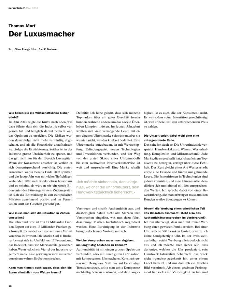 03 März 2010 Thomas Morf Der Luxusmacher Text: Oliver Prange Bilder: Carl F. Bucherer Wie haben Sie die Wirtschaftskrise bisher erlebt? Im Jahr 2003 zeigte die Kurve nach oben, was dazu führte, dass sich die Industrie selbst ver­ gessen hat und lediglich darauf bedacht war, das Optimum zu erreichen. Die Risiken wur­ den demzufolge nicht mehr vernünftig abge­ schätzt, und als die Finanzkrise unaufhaltsam war, folgte die Ernüchterung. Seither ist in der Industrie grosse Unsicherheit zu spüren, und das gilt nicht nur für den Bereich Luxusgüter. Wenn der Konsument unsicher ist, verhält er sich dementsprechend vorsichtig. Die ersten Anzeichen waren bereits Ende 2007 spürbar, und das letzte Jahr war mit vielen Tiefschlägen verbunden. 2010 sieht wieder etwas besser aus, und es scheint, als würden wir ein wenig Bo­ den unter den Füssen gewinnen. Zudem gestal­ tet sich die Entwicklung in den europäischen Märkten zunehmend positiv, und im Fernen Osten läuft das Geschäft gar sehr gut. Wie muss man sich die Situation in Zahlen vorstellen? Die Uhrenindustrie ist von 17 Milliarden Fran­ ken Export auf etwa 13 Milliarden Franken ge­ schrumpft. Es handelt sich also um einen Verlust von circa 25 Prozent. Die Marke Carl F. Buche­ rer bewegt sich im Umfeld von 17 Prozent, und das bedeutet, dass wir Marktanteile gewonnen haben. Wenn jedoch ein Viertel der Industrie re­ gelrecht in die Knie gezwungen wird, muss man von einem wahren Erdbeben sprechen. Kann man hiermit auch sagen, dass sich die Spreu allmählich vom Weizen trennt? 18 Definitiv. Ich habe gehört, dass sich manche Topmarken über ein gutes Geschäft freuen können, während andere um das nackte Über­ leben kämpfen müssen. Im letzten Jahrzehnt wollten sich viele vermögende Leute mit ei­ ner eigenen Uhrenmarke schmücken, aber sie wussten nicht, was das konkret bedeutet. Eine Uhrenmarke aufzubauen, ist mit Wertschöp­ fung, Erfindungsgeist, neuen Technologien und Investitionen verbunden, und der Weg von der ersten Skizze eines Uhrenmodells bis zum weltweiten Nachverkaufservice ist weit und anspruchsvoll. Eine Marke schafft «Ich möchte sicher sein, dass derjenige, welcher die Uhr produziert, sein Handwerk tatsächlich beherrscht.» Vertrauen und strahlt Authentizität aus, und diesbezüglich haben nicht alle Marken ihre Versprechen eingelöst, was nun dazu führt, dass einige Marken buchstäblich wegradiert werden. Eine Bereinigung in der Industrie bringt jedoch auch Vorteile mit sich. Welche Versprechen muss man abgeben, um langfristig bestehen zu können? Authentizität ist mit einem grossen Spektrum verbunden, also mit einer guten Fabrikation, mit kompetenten Uhrmachern, Konstrukteu­ ren und Designern. Statt nur auf kurzfristige Trends zu setzen, sollte man echte Kompetenz nachhaltig beweisen können, und die Langle­ bigkeit ist es auch, die der Konsument sucht. Er weiss, dass seine Investition gerechtfertigt ist, weil er bereit ist, den entsprechenden Preis zu zahlen. Die Uhrzeit spielt dabei wohl eher eine untergeordnete Rolle. Das sehe ich auch so. Die Uhrenindustrie ver­ spricht Handwerkskunst, Wissen, Werterhal­ tung, Komplexität und Mikromechanik. Jede Marke, die es geschafft hat, sich auf einem Top­ niveau zu bewegen, verfügt über diese Echt­ heit. Der Rest gleicht einer Art Westernstadt: vorne eine Fassade und hinten nur gähnende Leere. Die Investitionen in Technologien sind jedoch vonnöten, und eine Uhrenmarke iden­ tifiziert sich nun einmal mit den entsprechen­ den Werten. Ich spreche dabei von einer Be­ weisführung, die man erbringen muss, um den Kunden restlos überzeugen zu können. Obwohl die Werbung einen erheblichen Teil des Umsatzes ausmacht, steht also das Authentizitätsversprechen im Vordergrund? Ich bin überzeugt, dass man mit reiner Wer­ bung einen gewissen Punkt erreicht. Bei einer Uhr, welche 500 Franken kostet, erwarte ich keine handgefertigte Uhr. Ist der Preis weit­ aus höher, reicht Werbung allein jedoch nicht aus, und ich möchte auch sicher sein, dass derjenige, welcher die Uhr produziert, sein Handwerk tatsächlich beherrscht, das Stück nicht irgendwo zugekauft hat, unter einem Label betreibt und mir dadurch ein falsches Bild vermittelt. Ab einem gewissen Preisseg­ ment hat vieles mit Zeitlosigkeit zu tun, und Thomas Mor f Der Luxusmacher marketing & management Carl-F.-Bucher-CEO Thomas Mor f: Absage an Filmstar Val Kilmer. 19 03 März 2010 das Markenversprechen, welches man abgibt, muss unter allen Umständen eingehalten wer­ den. Kurzfristig muss dieses nicht unbedingt eingelöst werden, aber langfristig kommt man nicht drumherum. Lügen haben ja bekannt­ lich kurze Beine. Wie setzt man eine Kollektion zusammen? Man muss wissen, wofür man als Marke steht, was man damit erreichen und welches Ziel­ publikum man ansprechen möchte. Darauf­ hin folgen die entsprechenden Analysen, und die «DNA» einer Marke wird definiert. Nach der Entwicklung des Markenkerns stellt man eine Kollektion auf die Beine, welche diesen erarbeiteten Werten entspricht. Wenn ich bei­ spielsweise eine technologische Führerschaft anstrebe, kann ich nicht etwas Anspruchsloses entwickeln, sondern muss ein entsprechendes Produkt anbieten, welches diesem Anspruch gerecht wird. Wie viele verschiedene Marken sind verbunden sind, was vor allem in der Haute Horlogerie eine zentrale Rolle spielt. Es ist natürlich einfacher, wenn man auf eine Ge­ schichte zurückgreifen kann. Hinzu kommt, dass heutzutage nahezu alle geschichtlichen Bereiche «besetzt» sind. Wenn jedoch sämtli­ che Produkte nur aus Tradition bestehen wür­ den, könnten wir keine neuen Marken mehr lancieren. Zugehörigkeiten entstehen aus der Geschichte. Die einen identifizieren sich mit der Fliegerei, während andere die Schifffahrt bevorzugen. Entsteht dies aus Zufall? Ich glaube nicht, dass man diesbezüglich be­ wusst Marketing betrieben hat. Piloten be­ nötigten Uhren, und bald wurden entspre­ chende Modelle ko