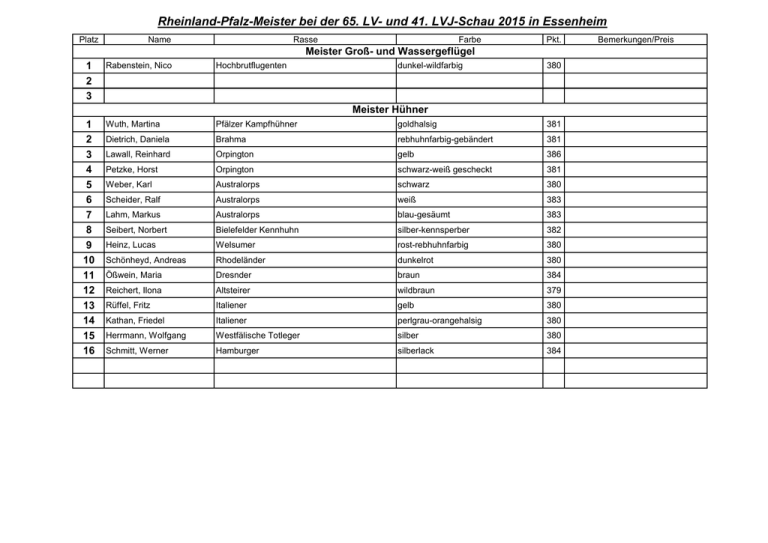 Rheinland-Pfalz-Meister bei der 65. LV- und 41. LVJ-Schau 2015 in Essenheim Platz Name Rasse Farbe Pkt. Meister Groß- und Wassergeflügel 1 2 3 Rabenstein, Nico Hochbrutflugenten dunkel-wildfarbig 380 Wuth, Martina Pfälzer Kampfhühner goldhalsig 381 Dietrich, Daniela Brahma rebhuhnfarbig-gebändert 381 Lawall, Reinhard Orpington gelb 386 Petzke, Horst Orpington schwarz-weiß gescheckt 381 Weber, Karl Australorps schwarz 380 Scheider, Ralf Australorps weiß 383 Lahm, Markus Australorps blau-gesäumt 383 Seibert, Norbert Bielefelder Kennhuhn silber-kennsperber 382 Heinz, Lucas Welsumer rost-rebhuhnfarbig 380 Schönheyd, Andreas Rhodeländer dunkelrot 380 Ößwein, Maria Dresnder braun 384 Reichert, Ilona Altsteirer wildbraun 379 Rüffel, Fritz Italiener gelb 380 Kathan, Friedel Italiener perlgrau-orangehalsig 380 Herrmann, Wolfgang Westfälische Totleger silber 380 Schmitt, Werner Hamburger silberlack 384 Meister Hühner 1 2 3 4 5 6 7 8 9 10 11 12 13 14 15 16 Bemerkungen/Preis Rheinland-Pfalz-Meister bei der 65. LV- und 41. LVJ-Schau 2015 in Essenheim Platz Name Rasse Farbe Pkt. Meister Zwerghühner 1 2 3 4 5 6 7 8 9 10 11 12 13 Gallasch, Maik Zw.-Cochin braun-gebändert 477 Sauer, Jürgen Antwerpener Bartzwerge schwarz 475 Werling, Arno Zw.-Wyandotten gold-schwarzgesäumt 476 Priester, Werner Zw.-Wyandotten gelb 479 Binger, Norbert Dt. Zw.-Reichshühner weiß-schwarzcolumbia 474 Kumb, Michael Zw.-Minorka schwarz 481 Gräf, Siglinde Zw.-La Fléche schwarz 476 Bemerkungen/Preis Rheinland-Pfalz-Meister bei der 65. LV- und 41. LVJ-Schau 2015 in Essenheim Platz Name Rasse Farbe Pkt. Bemerkungen/Preis Meister Tauben 1 2 3 4 5 6 7 8 9 10 11 Frank, Kurt-Dieter Giertaube Blau mit schwarzen Binden 475 Schulz, Friedhelm Coburger Lerchen gelercht 474 Backe, Wolfgang Coburger Lerchen silber mit Binden 477 Schulz, Friedhelm Coburger Lerchen silber ohne Binden 478 Roginek, Robert Hessische Kröpfer schwarz 478 Walz, Hans Schlesische Kröpfer weiß 474 Saueressig, Friedrich Brünner Kröpfer weiß 481 Kathan, Friedel Brünner Kröpfer schwarz 474 Röckel, Dieter Altdeutsche Mövchen weiß 474 Bloth, Thorsten Kölner Tümmler weiß 476 Saueressig, Mario Orientalische Roller Sprenkel-schwarz 478 < Rheinland-Pfalz-Meister bei der 65. LV- und 41. LVJ-Schau 2015 in Essenheim Platz Name Jugendmeister Hühner 1 Vollmer, Marcel 2 Heinz, Eric Rasse Italiener schwarz Lakenfelder Jugendmeister Zwerghühner Zw.-Cochin 1 Dweyer, Lukas 2 ZG Jockers, Geschwister Antwerpener Bartzwerge Zw.-Asil 3 Schrauth, Felix Moderne Englische Zwerg-Kämpfer 4 Scheider, Kiara Zw.-Orpington 5 ZG Schäfer, Niclas/Felix Zw.-'Orpington 6 Strack, Jeremy Scheider, Michelle Zw.-Australorps 7 Zw.-Barnevelder 8 ZG Schäfer, Niclas/Felix Zw.-Seidenhühner mit Bart 9 Hollschuh, Michelle Jugendmeister Tauben 1 Backe, Lukas 2 Flickinger, Tristan 3 Kammerknecht, Leon 4 Roginek, Lana 5 Vollmer, Marcel 6 Vollmer, Marcel Farbe Pkt. 380 378 schwarz 482 schwarz 474 gelbbunt 474 goldhalsig 476 gelb 475 schwarz 473 schwarz 476 dunkelbraun 472 weiß 472 Coburger Lerchen silber ohne Binden 475 Dt. Modeneser Schietti blau ohne Binden 477 Dt. Modeneser Schietti blau mit schwarzen Binden 474 Hessische Kröpfer weiß 476 Stargarder Zitterhälse rot 476 Stargarder Zitterhälse gelb 477 Bemerkungen/Preis
