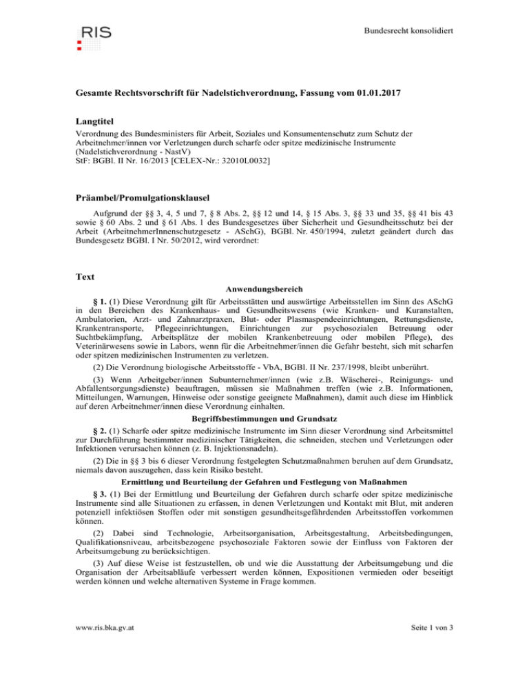 Bundesrecht konsolidiert Gesamte Rechtsvorschrift für Nadelstichverordnung, Fassung vom 01.01.2017 Langtitel Verordnung des Bundesministers für Arbeit, Soziales und Konsumentenschutz zum Schutz der Arbeitnehmer/innen vor Verletzungen durch scharfe oder spitze medizinische Instrumente (Nadelstichverordnung - NastV) StF: BGBl. II Nr. 16/2013 [CELEX-Nr.: 32010L0032] Präambel/Promulgationsklausel Aufgrund der §§ 3, 4, 5 und 7, § 8 Abs. 2, §§ 12 und 14, § 15 Abs. 3, §§ 33 und 35, §§ 41 bis 43 sowie § 60 Abs. 2 und § 61 Abs. 1 des Bundesgesetzes über Sicherheit und Gesundheitsschutz bei der Arbeit (ArbeitnehmerInnenschutzgesetz - ASchG), BGBl. Nr. 450/1994, zuletzt geändert durch das Bundesgesetz BGBl. I Nr. 50/2012, wird verordnet: Text Anwendungsbereich § 1. (1) Diese Verordnung gilt für Arbeitsstätten und auswärtige Arbeitsstellen im Sinn des ASchG in den Bereichen des Krankenhaus- und Gesundheitswesens (wie Kranken- und Kuranstalten, Ambulatorien, Arzt- und Zahnarztpraxen, Blut- oder Plasmaspendeeinrichtungen, Rettungsdienste, Krankentransporte, Pflegeeinrichtungen, Einrichtungen zur psychosozialen Betreuung oder Suchtbekämpfung, Arbeitsplätze der mobilen Krankenbetreuung oder mobilen Pflege), des Veterinärwesens sowie in Labors, wenn für die Arbeitnehmer/innen die Gefahr besteht, sich mit scharfen oder spitzen medizinischen Instrumenten zu verletzen. (2) Die Verordnung biologische Arbeitsstoffe - VbA, BGBl. II Nr. 237/1998, bleibt unberührt. (3) Wenn Arbeitgeber/innen Subunternehmer/innen (wie z.B. Wäscherei-, Reinigungs- und Abfallentsorgungsdienste) beauftragen, müssen sie Maßnahmen treffen (wie z.B. Informationen, Mitteilungen, Warnungen, Hinweise oder sonstige geeignete Maßnahmen), damit auch diese im Hinblick auf deren Arbeitnehmer/innen diese Verordnung einhalten. Begriffsbestimmungen und Grundsatz § 2. (1) Scharfe oder spitze medizinische Instrumente im Sinn dieser Verordnung sind Arbeitsmittel zur Durchführung bestimmter medizinischer Tätigkeiten, die schneiden, stechen und Verletzungen oder Infektionen verursachen können (z. B. Injektionsnadeln). (2) Die in §§ 3 bis 6 dieser Verordnung festgelegten Schutzmaßnahmen beruhen auf dem Grundsatz, niemals davon auszugehen, dass kein Risiko besteht. Ermittlung und Beurteilung der Gefahren und Festlegung von Maßnahmen § 3. (1) Bei der Ermittlung und Beurteilung der Gefahren durch scharfe oder spitze medizinische Instrumente sind alle Situationen zu erfassen, in denen Verletzungen und Kontakt mit Blut, mit anderen potenziell infektiösen Stoffen oder mit sonstigen gesundheitsgefährdenden Arbeitsstoffen vorkommen können. (2) Dabei sind Technologie, Arbeitsorganisation, Arbeitsgestaltung, Arbeitsbedingungen, Qualifikationsniveau, arbeitsbezogene psychosoziale Faktoren sowie der Einfluss von Faktoren der Arbeitsumgebung zu berücksichtigen. (3) Auf diese Weise ist festzustellen, ob und wie die Ausstattung der Arbeitsumgebung und die Organisation der Arbeitsabläufe verbessert werden können, Expositionen vermieden oder beseitigt werden können und welche alternativen Systeme in Frage kommen. www.ris.bka.gv.at Seite 1 von 3 Bundesrecht konsolidiert (4) Aufgrund dieser Ermittlung und Beurteilung sind die Maßnahmen der Gefahrenverhütung unter Berücksichtigung der in Abs. 2 genannten Kriterien und der Grundsätze des § 7 ASchG systematisch zu planen und sichere Arbeitsregelungen festzulegen. Expositionsvermeidung § 4. (1) Arbeitsverfahren sind so zu gestalten, dass das Risiko von Verletzungen und Infektionen verhindert oder zumindest minimiert wird und Expositionen vermieden werden. (2) Ergibt sich aus der Ermittlung und Beurteilung der Gefahren ein Risiko der Verletzung oder Infektion durch scharfe oder spitze medizinische Instrumente, sind, zusätzlich zu § 5 VbA, folgende Maßnahmen zu treffen: 1. Die Verwendung von scharfen oder spitzen medizinischen Instrumenten ist durch Änderung der Verfahren zu vermeiden und es sind medizinische Instrumente mit integrierten Sicherheits- und Schutzmechanismen zur Verfügung zu stellen sowie für deren Verwendung zu sorgen, sofern nicht die Ermittlung und Beurteilung der Gefahren ergeben hat, dass für eine konkrete Tätigkeit keine geeigneten medizinischen Instrumente mit integrierten Sicherheits- und Schutzmechanismen erhältlich sind, mit denen ein gleichwertiges Arbeitsergebnis erzielt werden kann. 2. Das Wiederaufsetzen der Schutzkappe auf die gebrauchte Nadel ist verboten. 3. Es sind sichere Verfahren für den Umgang mit und für die Entsorgung von scharfen oder spitzen medizinischen Instrumenten festzulegen und umzusetzen. Für die Entsorgung solcher Instrumente sind, so nah wie möglich an den Bereichen, an denen sie verwendet oder vorgefunden werden können, deutlich gekennzeichnete Behälter in ausreichender Anzahl bereit zu stellen, die ausreichend stich- und bruchfest, flüssigkeitsdicht, fest verschließbar und undurchsichtig sind. Information und Unterweisung § 5. (1) Bei der Information und der Unterweisung der Arbeitnehmer/innen (§§ 12 und 14 ASchG) sind insbesondere auch folgende Inhalte abzudecken: 1. die richtige Verwendung von scharfen oder spitzen medizinischen Instrumenten mit integrierten Schutzmechanismen, 2. Risiken im Zusammenhang mit Verletzungen durch scharfe oder spitze medizinische Instrumente und dem dadurch möglichen Kontakt mit Blut oder anderen potenziell infektiösen Stoffen oder sonstigen gesundheitsgefährdenden Arbeitsstoffen, 3. Schutzmaßnahmen unter Berücksichtigung der am Arbeitsplatz üblichen Vorgehensweisen, einschließlich grundlegender Schutzmaßnahmen, sicherer Arbeitsverfahren, korrekter Verwendungs- und Entsorgungsverfahren sowie Bedeutung einer möglichen Schutzimpfung, 4. Meldepflichten und Meldeverfahren gemäß § 6 Abs. 1, 5. im Verletzungsfall zu treffende Maßnahmen gemäß § 6 Abs. 2, 6. die Verfahren nach § 4 Abs. 2 Z 3. (2) Diese Information und Unterweisung der Arbeitnehmer/innen, einschließl