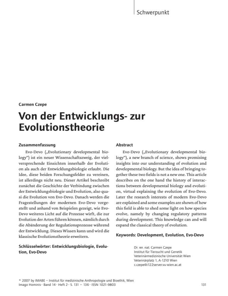 Schwerpunkt Carmen Czepe Von der Entwicklungs- zur Evolutionstheorie Zusammenfassung Abstract Evo-Devo („Evolutionary developmental biology“) ist ein neuer Wissenschaftszweig, der vielversprechende Einsichten innerhalb der Evolution als auch der Entwicklungsbiologie erlaubt. Die Idee, diese beiden Forschungsfelder zu vereinen, ist allerdings nicht neu. Dieser Artikel beschreibt zunächst die Geschichte der Verbindung zwischen der Entwicklungsbiologie und Evolution, also quasi die Evolution von Evo-Devo. Danach werden die Fragestellungen der modernen Evo-Devo vorgestellt und anhand von Beispielen gezeigt, wie EvoDevo weiteres Licht auf die Prozesse wirft, die zur Evolution der Arten führen können, nämlich durch die Abänderung der Regulationsprozesse während der Entwicklung. Dieses Wissen kann und wird die klassische Evolutionstheorie erweitern. Evo-Devo („Evolutionary developmental biology“), a new branch of science, shows promising insights into our understanding of evolution and developmental biology. But the idea of bringing together these two fields is not a new one. This article describes on the one hand the history of interactions between developmental biology and evolution, virtual explaining the evolution of Evo-Devo. Later the research interests of modern Evo-Devo are explained and some examples are shown of how this field is able to shed some light on how species evolve, namely by changing regulatory patterns during development. This knowledge can and will expand the classical theory of evolution. Keywords: Development, Evolution, Evo-Devo Schlüsselwörter: Entwicklungsbiologie, Evolution, Evo-Devo © 2007 by IMABE – Institut für medizinische Anthropologie und Bioethik, Wien Imago Hominis · Band 14 · Heft 2 · S. 131 – 136 · ISSN 1021-9803 Dr. rer. nat. Carmen Czepe Institut für Tierzucht und Genetik Veterinärmedizinische Universität Wien Veterinärplatz 1, A-1210 Wien c.czepe@i122server.vu-wien.ac.at 131 Schwerpunkt · Evolution II Entwicklungs- und Evolutionsbiologie – zwei voneinander unabhängige Fachdisziplinen? Zunächst erscheint es, als wären die Entwicklungs- und die Evolutionsbiologie zwei zwar verwandte, aber dennoch unterschiedliche Wissenschaftsbereiche. Der größte Unterschied liegt in der Fragestellung. Im Zentrum der entwicklungsbiologischen Forschung liegt die unveränderte Weitergabe des Körperbauplans von den Eltern an die Nachkommen, oder anderes formuliert: Wie entsteht aus einer befruchteten Eizelle ein Adulttier, das genau wie seine Elterntiere aussieht? Dasselbe gilt im Übrigen auch für die Pflanzen. Die Evolutionsbiologie hingegen ist genau an diesen Abänderungen im Körperbauplan interessiert. Als kleines Beispiel ist das Pferd geeignet. Aus dem kleinen Urpferd entstand durch kleine Mutationen und Selektionen ein großes Tier, das zum Tragen von Lasten und Ziehen von Wägen geeignet war. Durch den Menschen erfolgte dann eine gezielte Züchtung (d. h. wieder Selektion) zu einer Form, die befähigt war, auch Reiter zu tragen.1 Bei diesem Beispiel geht es um vergleichsweise geringe Abänderungen, wenn man die Unterschiede zwischen einem einzelligen Lebewesen und einem Wirbeltier bedenkt, z. B. dem Menschen. (Abb. 1) Wie oder besser gesagt, wann entsteht aber die Veränderung? Es ist ja nicht so, dass ein erwachse- nes Tier oder eine Pflanze plötzlich eine neue Eigenschaft entwickelt. Es sind immer die Nachkommen, die durch Mutation und Rekombination ihres genetischen Materials sich von ihren Eltern unterscheiden. Im vorher genannten Beispiel wäre das eine verstärkte Wirbelsäule und Muskulatur des Pferdes. François Jacob (1977) formulierte dieses so: „Die Evolution arbeitet mit dem, was sie hat. Sie kombiniert existierende Teile auf neue Arten miteinander. Dies passiert auf der Ebene der Gene, die die Entwicklung steuern und nicht der der Adultgene.“2 Natürlich gibt es auch hier einige Ausnahmen. So können zum Beispiel Bakterien und Viren genetisches Material an andere Bakterien oder befallene Lebewesen weitergeben und diese somit verändern. Antibiotikaresistenzen werden auf diese Art und Weise zwischen Bakterien ausgetauscht.3 Eine weitere Ausnahme könnte bei der Entstehung der Eukaryonten vorliegen. In jeder eukaryontischen Zelle, d. h. Zellen mit echtem Zellkern, gibt es Mitochondrien und in pflanzlichen auch noch Chloroplasten. Die Mitochondrien sind verantwortlich für den Energiestoffwechsel und die Chloroplasten für die Photosynthese. Diese beiden Arten von Zellorganellen besitzen eigene DNA. Diese zeigt nun in genetischen Vergleichen Eigenschaften von prokaryontischer DNA. Man nimmt daher an, dass prokaryontische Zellen in die Vorform der Abb. 1: A zeigt den Lebenszyklus eines Frosches. Die Entwicklung vom Ei über die Kaulquappe zum Frosch ist ein Beispiel für die Entwicklungsbiologie. Der phylogenetische Baum in B zeigt hingegen die frühe Evolution aller Lebewesen (Bildnachweis B: Carl Woese) 132 Imago Hominis · Band 14 · Heft 2 C. Czepe: Von der Entwicklungs- zur Evolutionstheorie Evolution Entwicklung Änderung im Körperbauplan Weitergabe des unveränderten Körperbauplans von den Eltern an die Nachkommen Evolution beinhaltet auch die Änderungen in der Embryonalentwicklung Aus einfachen Lebewesen (Einzeller) entwickeln sich höhere Lebewesen (z. B. Wirbeltiere) Eine Zelle entwickelt sich in verschiedene Arten von spezialisierten Zellen (Differenzierung) Tab. 1: Vergleich zwischen Evolution und Entwicklung eukaryontischen Zellen eingewandert sind und dort nicht verdaut wurden, sondern eine Symbiose mit der Wirtszelle eingegangen sind. Diese Theorie wird als Endosymbiontheorie bezeichnet.4 Ein weiterer Berührungspunkt der beiden Disziplinen kann gefunden werden, wenn man bedenkt, dass während der Evolution aus einem einzelligen Lebewesen höher entwickelte vielzellige Arten entstanden sind und während der Entwicklung ebenfalls aus einem Einzeller (hier die befruchtete Eizelle) viele spezialis