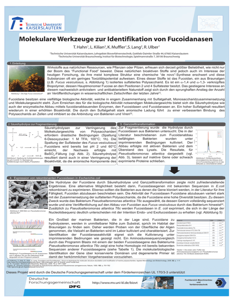 Molekulare Werkzeuge zur Identifikation von Fucoidanasen T. Hahn1, L. Kilian2, K. Muffler1,S. Lang2, R. Ulber1 1 Technische Universität Kaiserslautern, Lehrgebiet Bioverfahrenstechnik, Gottlieb-Daimler-Straße 44, 67663 Kaiserslautern 2 Technische Universität Braunschweig, Institut für Biotechnologie, Spielmannstraße 7, 38106 Braunschweig 1. Einleitung Wirkstoffe aus natürlichen Ressourcen, wie Pflanzen oder Pilzen, erfreuen sich derzeit größter Beliebtheit, wie nicht nur der Boom des “Functional Food” beweist. Diese natürlichen bioaktiven Stoffe sind jedoch auch im Interesse der heutigen Forschung, da ihre meist komplexe Struktur eine chemische “de novo”-Synthese erschwert und diese Substanzen oft ein geringes Toxizitätspotential aufweisen. Eines dieser Stoffe ist das Fucoidan, ein aus Braunalgen (z.B. Fucus vesiculosus, s. Abbildung 1) isoliertes sulfatiertes Polysaccharid. Es ist ein α-1,4 und α-1,3- verknüpftes Biopolymer, dessen Hauptmonomer Fucose an den Positionen 2 und 4 Sulfatester besitzt. Das gestiegene Interesse an diesem nachweislich antiviralem und antibakteriellem Naturstoff zeigt sich durch den sprunghaften Anstieg der Anzahl an Veröffentlichungen in wissenschaftlichen Zeitschriften der letzten Jahre[1]. Abbildung 1: Die Alge Fucus vesiculosus[2] Fucoidane besitzen eine vielfältige biologische Aktivität, welche in engem Zusammenhang mit Sulfatgehalt, Monosaccharidzusammensetzung und Molekulargewicht steht. Zum Erreichen des für die biologische Aktivität notwendigen Molekulargewichts bietet sich die Säurehydrolyse wie auch der enzymatische Abbau mittels fucoidanabbauenden Enzymen, den Fucosidasen und Fucoidanasen an. Ein hoher Sulfatgehalt resultiert wiederum in einer erhöhten Bioaktivität. Die durch den Sulfatgehalt stark anionische Ladung führt zu einer verbesserten Bindung des Polysaccharids an Zellen und inhibiert so die Anbindung von Bakterien und Viren[3]. . 3. Ganzzelltransformation 2. Säurehydrolyse zur Fragmentierung OH O S O O OH 60°C, pH 2 O R S O O R O O O S H 2O O SO 42 - HO S OH O B a 2+ B aSO 4 Abbildung 2: Spaltung der Sulfatesterbindungen bei pH 2 und 60 °C; Nachweis der Sulfatbindungen durch BaSO4-Präziptiation Säurehydrolysen zur Verringerung des Molkekulargewichts von Polysacchariden erfordern drastische Bedingungen (Spaltung 6-Desoxyzucker: 1 M TFA; 100°C; 1h). Die Spaltung der Sulfatester des Fucus vesiculosus Fucoidans wird bereits bei pH 2 und 60°C erreicht, der Nachweis erfolgte mit BaSO4-Fällung (vgl. Abb. 2). Säurehydrolyse resultiert damit auch in einer Verringerung der Bioaktivität, da die anionische Komponente des Zur Fragmentierung wurde die Hydrolyse durch Fucosidasen aus Bakterien untersucht. Die in der Literatur beschriebenen zum Fucoidanabbau befähigten Bakterien wurden unter imprimierenden Bedingungen kultiviert. Der Abbau erfolgte mit aktiven Bakterien und dem Überstand des Lysats. Die Resultate, für Pseudoalteromonas atlantica dargestellt (vgl. Abb. 3), lassen auf inaktive Gene oder schwach exprimierte Proteine schließen. Abbildung 3: Größemausschlusschromatigramme des Abbaus einer 2,5 ml Fucoidanlösungmit 0,5 ml des Zelllysats zu verschiedenen Zeiten 4. Expression von rekombinanten Fucosidasen in Escherichia coli Abbildung 4: SEM Bild von Pseudoalteromonas atlantica t6c[5] Abbildung 5: Fucosidasegene von M. fucanivorans und P. atlantica T6c aus der Datenbank NCBI dargestellt mit dem Programm pdraw32 Die Hydrolyse der Fucoidane durch Säurehydrolyse und Ganzzelltransformation zeigte nicht zufriedenstellende Ergebnisse. Eine alternative Möglichkeit besteht darin, Fucosidasegenen mit bekannten Sequenzen in E.coli rekombinant zu exprimieren. Ebenso sollten die Bakterien aus denen die Gene kloniert werden, in der Literatur für ihre Fähigkeit, Fucoidan abzubauen beschrieben sein. Die Aktivität der Fucosidasen Fucoidane abzubauen variiert stark mit der Zusammensetzung der sulfatierten Polysaccharide, da die Fucoidane eine hohe Diversität besitzen. Zu diesem Zweck wurde das Bakterium Pseudoalteromonas atlantica T6c ausgewählt, da dessen Genom vollständig sequenziert wurde und eine Veröffentlichung auf den Abbau von Fucoidan aus Fucus vesiculosus durch das Bakterium hinweist[4]. Zusätzlich zu Pseudoalteromonas atlantica T6c werden Fucosidasen in E. coli exprimiert, die sich in der Länge der Nucleotidsequenz deutlich unterscheiden mit der Intention Endo- und Exofucosidasen zu erhalten (vgl. Abbildung 5) Ein Großteil der marinen Bakterien, die in der Lage sind, Fucoidane zu 6. Conclusion hydrolysieren, werden in unmittelbarer Nähe zum Substrat, sprich im Habitat der Braunalgen zu finden sein. Daher werden Proben von der Oberfläche der Algen genommen, die Vielzahl an Bakterien wird im Labor kultiviert und charakterisiert. Zur Identifikation der Fucoidanaseaktivität eignet sich die Kultivierung unter imprimierenden Bedinungen wie gezeigt nicht. Ein Aminosäuresequenzvergleich durch das Programm Blastx mit einem der beiden Fucosidasegene des Bakteriums Pseudoalteromonas atlantica T6c zeigt eine hohe Homologie mit bereits bekannten Sequenzen anderer Fucosidasegene (siehe Tabelle 1). Die molekularbiologische Identifikation der Gene über konservierte Domänen und degenerierte Primer ist damit der herkömmlichen Vorgehensweise vorzuziehen. B akterium Gramella forsetii K T0803 Treffer 430 -110 Rhodopirellula baltica S H 1 403 3·10 P seudoalteromonas atlantica T6c 391 1·10 Thermobaculum terrenum A TC C B A A -798 386 3·10 Thermoanaerobacterium thermosaccharolyticum D S M 571 375 8·10 D ictyoglomus turgidum D S M 6724 370 7·10 D ictyoglomus thermophilum H-6-12 369 1·10 C aldivirga maquilingensis IC -167 366 1·10 [C andidatus K oribacter versatilis E llin345 365 9·10 B acteroides cellulosilyticus D S M 14838] 358 1·10 Tabelle 1: Die ersten zehn Treffer des Aminosäureequenzvergleichs von Pseudoalteromonas atlantica T6c mit Blastx (Datenbank NCBI) [1] A.Holtkamp, S. Kelly, R. Ulber, S. La
