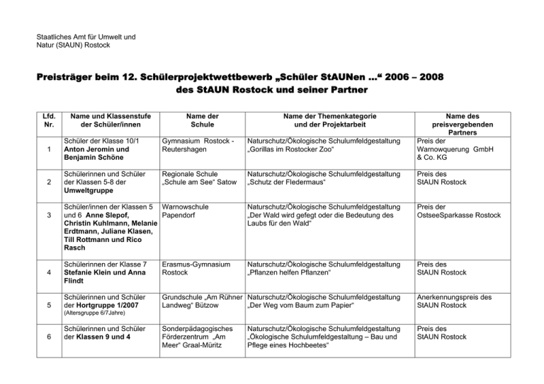 Staatliches Amt für Umwelt und Natur (StAUN) Rostock Preisträger beim 12. Schülerprojektwettbewerb „Schüler StAUNen ...“ 2006 – 2008 des StAUN Rostock und seiner Partner Lfd. Nr. Name und Klassenstufe der Schüler/innen Name der Schule Name der Themenkategorie und der Projektarbeit Name des preisvergebenden Partners Preis der Warnowquerung GmbH & Co. KG 1 Schüler der Klasse 10/1 Anton Jeromin und Benjamin Schöne Gymnasium Rostock Reutershagen Naturschutz/Ökologische Schulumfeldgestaltung „Gorillas im Rostocker Zoo“ 2 Schülerinnen und Schüler der Klassen 5-8 der Umweltgruppe Regionale Schule „Schule am See“ Satow Naturschutz/Ökologische Schulumfeldgestaltung „Schutz der Fledermaus“ Preis des StAUN Rostock Schüler/innen der Klassen 5 Warnowschule Papendorf und 6 Anne Slepof, Christin Kuhlmann, Melanie Erdtmann, Juliane Klasen, Till Rottmann und Rico Rasch Naturschutz/Ökologische Schulumfeldgestaltung „Der Wald wird gefegt oder die Bedeutung des Laubs für den Wald“ Preis der OstseeSparkasse Rostock Schülerinnen der Klasse 7 Stefanie Klein und Anna Flindt Erasmus-Gymnasium Rostock Naturschutz/Ökologische Schulumfeldgestaltung „Pflanzen helfen Pflanzen“ Preis des StAUN Rostock Schülerinnen und Schüler der Hortgruppe 1/2007 Grundschule „Am Rühner Naturschutz/Ökologische Schulumfeldgestaltung Landweg“ Bützow „Der Weg vom Baum zum Papier“ Anerkennungspreis des StAUN Rostock Sonderpädagogisches Förderzentrum „Am Meer“ Graal-Müritz Preis des StAUN Rostock 3 4 5 (Altersgruppe 6/7Jahre) 6 Schülerinnen und Schüler der Klassen 9 und 4 Naturschutz/Ökologische Schulumfeldgestaltung „Ökologische Schulumfeldgestaltung – Bau und Pflege eines Hochbeetes“ Schülerinnen und Schüler der Klassen 2a und 2b Grundschule „Kleine Birke“ Rostock 8 Schülerinnen und Schüler der Abschlussstufe 1 der SiL und der Klassen 6 und 8 Allgemeine Förderschule Naturschutz/Ökologische Schulumfeldgestaltung Teterow „Grün macht Schule – Weiterführung“ Anerkennungspreis der OstseeSparkasse Rostock 9 Schülerinnen und Schüler der Hortgruppe 4/2007 Grundschule „Am Rühner Unser täglich Wasser ... Landweg“ Bützow „Erforschen des Wasserkreislaufes“ Preis der EURAWASSER Nord GmbH Fritz-Reuter-Grundschule Unser täglich Wasser ... Kühlungsborn „Wasser um uns herum – Theaterstück ´Die Reise der Wassertropfen´ „ Preis der EURAWASSER Nord GmbH 7 Naturschutz/Ökologische Schulumfeldgestaltung „Schick den Igel in den Winterschlaf“ Preis des StAUN Rostock (Altersgruppen 9/10 und 6/7Jahre) 10 11 12 13 14 15 Schülerinnen und Schüler der Klasse 2a des Schuljahres 2006/2007 Fritz-Reuter-Grundschule Unser täglich Wasser ... Schülerinnen und Schüler Kühlungsborn „Wasser um uns herum – Kunstprojekt Wasser“ der Kunstprojektgruppe der Klassen 1-4 des Schuljahres 2006/2007 Anerkennungspreis der EURAWASSER Nord GmbH Schülerinnen und Schüler der Experimentiergruppe der Klassen 3 und 4 des Schuljahres 2006/2007 Fritz-Reuter-Grundschule Unser täglich Wasser ... Kühlungsborn „Wasser um uns herum – Wasserexperimente“ Preis der EURAWASSER Nord GmbH Schülerin der Klasse 13/1 Annemarie Ulbricht Ostseegymnasium Rostock Abfall/Regenerative Energien „Erneuerbare Energien in MecklenburgVorpommern“ Preis der Conergy Wärmepumpen GmbH Schüler der Klasse 11-4 Björn Lampe Käthe-KollwitzGymnasium Rostock Abfall/Regenerative Energien „Das Energieproblem der Erde“ Preis der OstseeSparkasse Rostock Schülerin der Klasse 10/2 Susanne Bartels Gymnasium Reuterhagen Küstenschutz/Küstenzonenmanagement „Entdeckerzone – Umgestaltungsvorschlag zum Strandabschnitt des Hotelkomplexes Yachthafenresidenz Hohe Düne“ Preis des StAUN Rostock 16 17 18 Schüler der Klassen 10 und 13 Norman Günther, Markus Karsten und Sven Vanselow sowie der Klasse XTA 71 Jan Dvorak John-BrinckmanGymnasium Güstrow, Beruflichen Schule Elektrotechnik/Elektronik Rostock Abfall/Regenerative Energien „Abwässer als Energiequelle für die wirtschaftliche Betreibung von effizienten Straßenbeleuchtungen bei gleichzeitiger Minimierung der Klimakiller und der Luftverschmutzung“ Preis der EVG Entsorgungs- und Verwertungsgesellschaft mbH Rostock Schülerinnen und Schüler der Klassenstufe 8 Erasmus-Gymnasium Rostock Abfall/Regenerative Energien „Nachhaltig leben lernen / Erneuerbare Energien“ Sonderpreis des StAUN Rostock Schüler/innen der Klassen 11 und 12 Jan-Ole Höppner, Alina Schröder und Stefanie Albrecht Innerstädtisches Gymnasium Rostock, Erasmus-Gymnasium Rostock, John-BrinckmannGymnasium Güstrow Abfall/Regenerative Energien „Hydrothermale Karbonisierung“ Preis der Stadtwerke Rostock AG