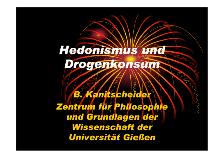 Hedonismus und Drogenkonsum B. Kanitscheider Zentrum für Philosophie und Grundlagen der Wissenschaft der Universität Gießen Historische Karriere des Hedonismus Älteste Erwähnung vermutlich bei Demokrit: <Das Beste für den Menschen ist es, sich so viel als möglich zu freuen und so wenig als möglich zu betrüben.> (Frag. 189) Demokrit beeinflußte Epikur mit seiner atomistischen Naturlehre, mit einer sensualistischen Erkenntnislehre, und mit einer Ethik die auf dem Lustbegriff gründet. Eigentliche Begründer des Hedonismus: Kyrenaiker Aristippos von Kyrene: Körperliche Lust hat absoluten Wert, ist Selbstzweck und oberstes Strebungsziel. [Diog. Laert. II, 65] Erstrebenswert ist dabei die momentane Empfindung, nicht der erinnerte und antizipierte Sinneseindruck. Die zeitliche Summe der einzelnen Lustgefühle ist die Glückseligkeit, diese hat ihren Wert aber um der punktuellen Einzelempfindung willen. Symposion Erste Begründungen Alle Lebewesen (Tiere, Kinder, Erwachsene) streben von Natur nach Lust und vermeiden den Schmerz. Der deskriptive oder psychologische Hedonismus ist die faktische Basis für die hedonistische Normierung. Eudoxos von Knidos: Argumente für das Streben nach freudvollen Erleben erscheinen uns unsinnig. [Arist.: Nik. Ethik 10,2] Niemand fragt nach einer Begründung, warum er mit seiner Geliebten vereint sein möchte. So auch Platon: <Und weiter zu fragen bedarf es nicht, weshalb denn der glücklich sein will, der es will, sondern die Antwort scheint vollendet zu sein>. [Symp. 104d] Knabenliebe Aristippos‘ Kennzeichnungen Lust: sanfter Vorgang gegenüber dem Schmerz einer rauhen harschen Bewegung. Keine Werthierarchie zwischen den Lustarten begründbar, geistige Freude ist der körperlichen nicht axiologisch überlegen. Lust ist wertvoll, unabhängig davon wie sie zustande gekommen ist. Lust ist nicht gleichwertig der Beseitigung des Schmerzes und Lustlosigkeit ist noch kein Schmerz. Schmerzfreiheit und Lustlosigkeiten fehlt beiden das Bewegungsmoment, es sind mittlere Zustände. Aristippos´ Wertung: Körperliches Empfinden rangiert höher. Manche Lust kann nur durch das Akzeptieren von freudlosen Geschehnissen erreicht werden Glückseligkeit unerreichbar. Deskriptiver und präskriptiver Hedonismus • Die Natürlichkeit des Luststrebens suggeriert, aber erzwingt nicht, deren Erhebung zur normativen Leitlinie, man könnte auch den Schmerz wählen. (Algonismus) • Wenn man aber die Lust zur ethischen Norm erhebt, werden nur Verbote für lustvolle Tätigkeiten begründungsbedürftig. • Bei Fehlen von Gründen – Schädigung Dritter – gilt das permissive Prinzip des Gewährenslassens. • Restriktionen des individuellen Luststrebens sind legitimationspflichtig. • Das Individuum muß nicht begründen noch verteidigen, warum es nach Dingen strebt die ihm Freude bringen. • Niemand muß sich rechtfertigen, daß er ein gutes erfreuliches Leben führen will. Hedoné und Phrónesis Die Folgen jeder Handlung müssen bedacht werden Ein blindes Ausleben der Strebungen kann ins Unglück führen. Dazu hat der Mensch den Verstand, phronéo, von der Natur mitbekommen. Damit wird der Hedonismus mit dem Konsequentialismus , der folgenorientierten Handlungsstrategie verbunden. Aristipp war ein Freund der Hetairen, und lebte lange Zeit mit der älteren Lais zusammen. Er kommentierte die Zweifel der Umgebung: écho kaì ouk échomai, ich besitze, werde aber nicht besessen. Der lebenskluge Weise vergnügt sich, aber nicht so, daß er die sophrosýne, die Besonnenheit, verliert. Jüngling mit Hetäre Epikurs Transformation des Hedonismus Epikouros von Athen verschiebt den Begriff der Hedoné in Richtung auf den neutralen Nullpunkt der Empfindung. Katastematische Lust ist der ausgeglichene Zustand der Zufriedenheit, ohne extreme Pole von Freude und Schmerz Ataraxía, die Gemütsruhe. Nicht die sanfte Bewegung, sondern die statische schmerzfreie Befindlichkeit. Noch stärker als Aristipp sah er ein, daß man öfter die Egkráteia, die Zurückhaltung üben muß, um den Weg zu größeren Freuden nicht zu verbauen. Paradoxon der Lust: Obwohl sie immer erstrebenswert ist, darf sie nicht immer angestrebt werden. Aphrodite • Die Göttin war für alle Arten von Liebe zuständig: • Ehe, Hetären, Knabenliebe, Homosexualität, Prostitution • Praxiteles‘ AphroditeStatue Modell Hetäre Phryne Aphroditegruppe • Der lüsterne Pan bedrängt die nackte Aphrodite, die sich mit ihrer Sandale wehrt. Eros eilt ihr zu Hilfe. • Aphrodite war für alle Formen der Sexualität zuständig Kritik am negativen Hedonismus Bereits in der Antike: Ist es möglich die Aktivität und Spontaneität aus dem Lustbegriff zu entfernen? Negative Bestimmung, Fehlen von Hunger, Durst, Trauer, Einsamkeit drängt den Begriff in die Nähe asketischer Selbstgenügsamkeit. Die Stoiker, bei denen der Weise unempfindlich gegen Schicksalsschläge werden soll, hielten ihn für akzeptabler als Aristipp. Cicero: Die Epikureer sind zwar bescheidener, aber die Kyrenaiker konsequenter. [De fin. II,114] Clemens v. Alexandria: Die katastemische Lust ist eine Beschreibung des Befindens lebendiger Leichen. [Stromateis II,21] Dionysischer Lebensstil Eros und Droge Lustvolle Tätigkeiten Gratwanderung Irreversible Abhängigkeit vs. freudlose Langeweile Prinzip der Besonnenheit Alle Lüste haben ein psychisches Suchtpotential. Ethische Skeptiker halten die Vernunft für schwach. Später Platon Körperfeindlichkeit <Körper ist das Grab der Seele> Platon als <der große Verleumder des Lebens> (Nietzsche) Christliche asketische Weltflüchtigkeit Ambivalenz der Tugenden Hedonismus gilt in der christlichen Tradition als lasterhaft, amoralisch, tugendresistent. (Augustinus: Epikuros, quem ipsi philosophi porcum nominaverunt) Neuer Aufbruch im Renaissance - Humanismus Lorenzo Valla (1400) fragt: Motive hinter den Tugenden? Welchen Ersatz erhält jemand, der tugendhaften Verzicht auf Sinnesfreuden leistet, Ehre, Ruhm, Ansehen, G