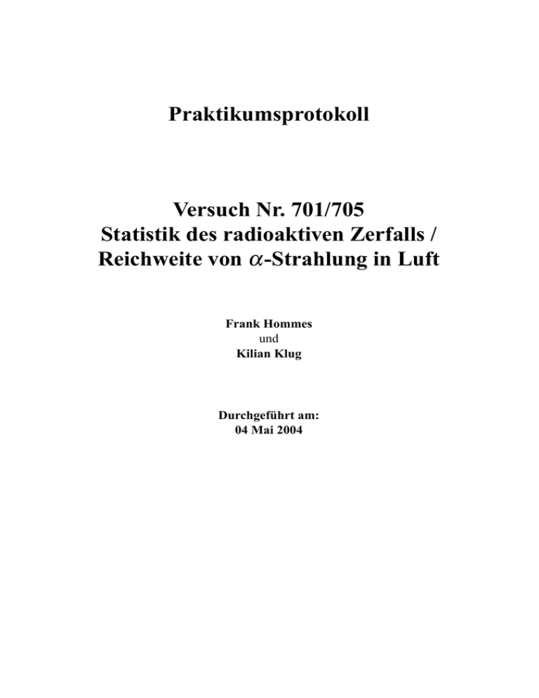 die statistischen Merkmale bei der Beobachtung einer größeren Zahl von radioaktiven Zerfällen. Im Zweiten (Nr. 705) soll die Reichweite der bei α-Zerfällen
