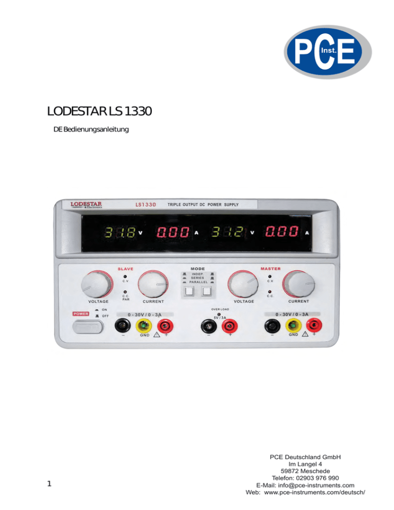 LODESTAR LS 1330 DE Bedienungsanleitung 1 PCE Deutschland GmbH Im Langel 4 59872 Meschede Telefon: 02903 976 990 E-Mail: info@pce-instruments.com Web: www.pce-instruments.com/deutsch/ messen ● prüfen ● testen Inhaltsverzeichnis 1.0 Einleitung / Lieferumfang 2.0 Transport und Lagerung 3.0 Sicherheitsmaßnahmen 4.0 Bestimmungsgemäße Verwendung 5.0 Bedien- und Anzeigeelemente 6.0 Vorbereitung / Einführung 7.0 Anwendung 7.1 Unabhängiger Betrieb der Ausgänge 7.2 C.V. Konstantspannungs-Betrieb 7.3 C.C. Konstantstrom-Betrieb 7.4 Reihenschaltung (SERIES) 7.5 Parallelschaltung (PARALLEL) 7.6 Festspannung 8.0 Sicherungswechsel 9.0 Wartung 10.0 Reinigung 11.0 Technische Daten 24 Monate Garantie 2 3 3 4 4 6 6 6 7 7 7 8 8 8 8 8 9 12 Auf dem Gerät und in der Bedienungsanleitung vermerkte Hinweise: Warnung vor einer Gefahrenstelle. Bedienungsanleitung beachten. Vorsicht! Gefährliche Spannung. Warnung vor heißer Oberfläche. Hinweis! Bitte unbedingt beachten. Durchgängige doppelte oder verstärkte Isolierung entsprechend Klasse II IEC 536. Konformitätszeichen, bestätigt die Einhaltung der gültigen EMV Richtlinie (2004/108/EG). Die Normen EN 61326-1:2006 und die Niederspannungsrichtlinie (2006/95/EG) mit den Normen EN 61010 wird eingehalten. Gerät entspricht der Richtlinie (2002/96/EG) WEEE 1.0 Einleitung / Lieferumfang Die Bedienungsanleitung enthält Informationen und Hinweise, die zu einer sicheren Bedienung und Nutzung des Gerätes notwendig sind. Vor der Verwendung des Gerätes ist die Bedienungsanleitung aufmerksam zu lesen und in allen Punkten zu befolgen. Wird die Anleitung nicht beachtet oder sollten Sie es versäumen, die Warnungen und Hinweise zu beachten, können ernste Verletzungen des Anwenders bzw. Beschädigungen des Gerätes eintreten. Das Lodestar LS 1330 ist ein Dreifach-Gleichspannungs-Netzgerät. Der Anwender kann zwischen einem festen Ausgang (5V/3A) und zwei variablen Ausgängen (0…30V/0…3A) wählen. Die variablen Ausgänge können parallel (0…30V/0…6A) oder in Reihe (0…60V/0…3A) geschaltet werden. 2 messen ● prüfen ● testen ● Einstellbares Dreifach-Gleichspannungs-Netzgerät. ● Jeder Ausgang komplett gegenseitig getrennt ● Große gut sichtbare LED Anzeige ● Serien- und Reihenschaltung mit Tasten einstellbar ● Konstantspannungs- und Konstantstrom-Modus (CV/CC) ● Geringe Welligkeit der Gleichspannungen ● Überlast- und Verpolungsschutz Im Lieferumfang sind enthalten: 1x Netzgerät LS 1330 1x Netzzuleitung 1x Bedienungsanleitung 1x Sicherung 1x Messleitungsset 2.0 Transport und Lagerung Bitte bewahren Sie die Originalverpackung für eine spätere Versendung auf. Transportschäden aufgrund mangelhafter Verpackung sind von der Garantie ausgeschlossen. Die Lagerung des Gerätes muss in trockenen, geschlossenen Raumen erfolgen. Sollte das Gerät bei extremen Temperaturen transportiert worden sein, benötigt es vor dem Einschalten eine Erholungszeit von mindestens 2 Stunden. 3.0 Sicherheitsmaßnahmen Die Geräte wurden gemäß den Sicherheitsbestimmungen für elektronische Messgeräte IEC/EN 61010-1 gebaut und geprüft und haben das Werk in sicherheitstechnisch einwandfreiem Zustand verlassen. Um diesen Zustand zu erhalten, muss der Anwender die Sicherheitshinweise in dieser Anleitung beachten. Zur Vermeidung eines elektrischen Schlages, sind die Vorsichtsmaßnahmen zu beachten, wenn mit Spannungen größer 120V (60V) DC oder 50V (25V) eff. AC gearbeitet wird. Diese Werte stellen nach DIN VDE die Grenze der noch berührbaren Spannungen dar (Werte in Klammern gelten für z. B. medizinische oder landwirtschaftliche Bereiche). Vergewissern Sie sich vor jeder Anwendung, dass die Messleitungen und das Netzgerät in einwandfreiem Zustand sind. Das Netzgerät darf nur in den spezifizierten Messbereichen eingesetzt werden. Wenn die Sicherheit des Bedieners nicht mehr gewährleistet ist, muss das Gerät außer Betrieb gesetzt und gegen ungewollten Betrieb gesichert werden. Die Sicherheit ist nicht mehr gewährleistet, wenn das Gerät: • offensichtliche Beschädigungen aufweist • die gewünschten Messungen nicht mehr durchführt • zu lange unter ungünstigen Bedingungen gelagert wurde • während des Transportes mechanischen Belastungen ausgesetzt war. Das Gerät darf nicht geöffnet, zerlegt oder in irgendeiner Weise verändert werden. Das Gerät darf nur mit dem empfohlenen Zubehör benutzt werden. Die Verwendung von ungeeignetem Zubehör ist unzulässig. Bei sämtlichen Arbeiten müssen die Unfallverhütungsvorschriften der gewerblichen Berufsgenossenschaften für elektrische Anlagen und Betriebsmittel beachtet werden. Vermeiden Sie eine Erwärmung des Gerätes durch direkte Sonneneinstrahlung. Nur so kann eine einwandfreie Funktion und eine lange Lebensdauer gewährleistet werden. 3 messen ● prüfen ● testen 4.0 Bestimmungsgemäße Verwendung Das Gerät darf nur unter den Bedingungen und für die Zwecke eingesetzt werden, für die es konstruiert wurde. Hierzu sind besonders die Sicherheitshinweise, die technischen Daten mit den Umgebungsbedingungen und die Verwendung in trockener Umgebung zu beachten. Die Betriebssicherheit ist bei Modifizierung oder Umbauten nicht mehr gewährleistet. Das Gerät darf nur vom autorisierten Servicetechniker geöffnet werden. Betreiben Sie das Gerät niemals an einer höheren Spannung als in den technischen Daten angegeben ist! Das Gerät kann ansonsten zerstört oder dauerhaft beschädigt werden. 5.0 Bedien- und Anzeigeelemente 1 2 13 14 3 4 6 7 11 10 5 8 12 9 23 20 19 18 22 27 21 17 16 15 23 POWER – Netzschalter Ein/Aus 13/14 MODE – Schalter für Ausgänge unabhängig / Reihenschaltung / Parallelschaltung INDEP: unabhängiger Betrieb der Ausgänge SERIES: Reihenschaltung PARALLEL: Parallelschaltung a) Sind beide Schalter ausgeschaltet und beide Ausgänge MASTER und SLAVE arbeiten unabhängig. b) Reihenschaltung: Ist der linke Schalter gedrückt und der rechte Schalter nicht gedrückt, so sind die A