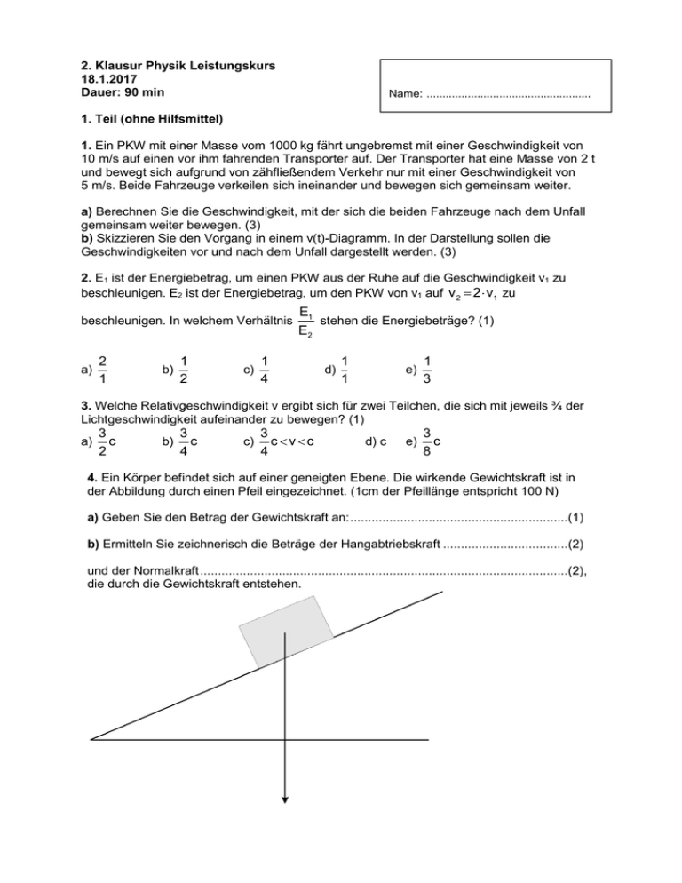 2. Klausur Physik Leistungskurs 18.1.2017 Dauer: 90 min Name: .................................................... 1. Teil (ohne Hilfsmittel) 1. Ein PKW mit einer Masse vom 1000 kg fährt ungebremst mit einer Geschwindigkeit von 10 m/s auf einen vor ihm fahrenden Transporter auf. Der Transporter hat eine Masse von 2 t und bewegt sich aufgrund von zähfließendem Verkehr nur mit einer Geschwindigkeit von 5 m/s. Beide Fahrzeuge verkeilen sich ineinander und bewegen sich gemeinsam weiter. a) Berechnen Sie die Geschwindigkeit, mit der sich die beiden Fahrzeuge nach dem Unfall gemeinsam weiter bewegen. (3) b) Skizzieren Sie den Vorgang in einem v(t)-Diagramm. In der Darstellung sollen die Geschwindigkeiten vor und nach dem Unfall dargestellt werden. (3) 2. E1 ist der Energiebetrag, um einen PKW aus der Ruhe auf die Geschwindigkeit v1 zu beschleunigen. E2 ist der Energiebetrag, um den PKW von v1 auf v 2 2 v1 zu beschleunigen. In welchem Verhältnis a) 2 1 b) 1 2 c) E1 stehen die Energiebeträge? (1) E2 1 4 d) 1 1 e) 1 3 3. Welche Relativgeschwindigkeit v ergibt sich für zwei Teilchen, die sich mit jeweils ¾ der Lichtgeschwindigkeit aufeinander zu bewegen? (1) a) 3 c 2 b) 3 c 4 c) 3 c v c 4 d) c e) 3 c 8 4. Ein Körper befindet sich auf einer geneigten Ebene. Die wirkende Gewichtskraft ist in der Abbildung durch einen Pfeil eingezeichnet. (1cm der Pfeillänge entspricht 100 N) a) Geben Sie den Betrag der Gewichtskraft an: .............................................................(1) b) Ermitteln Sie zeichnerisch die Beträge der Hangabtriebskraft ...................................(2) und der Normalkraft .......................................................................................................(2), die durch die Gewichtskraft entstehen. 2. Klausur Physik Leistungskurs 18.1.2017 Dauer: 90 min 2. Teil (Hilfsmittel: Tafelwerk, Taschenrechner) 5. Ein Käfer (m=1g) rotiert windgeschützt auf der Flügelspitze (r=15m) einer Windkraftanlage, die für eine Umdrehung 4 s braucht. a) Mit welcher Kraft muss sich der Käfer mit seinen kleinen Käferbeinen an dem Flügel festhalten, damit er darauf sitzen bleibt? (4) b) Dem Wievielfachem seiner Gewichtskraft entspricht das? (1) 6. (LK 2013/14) Bei einer Rallye fährt der Fahrer eines Autos einen Hang hinauf, hebt mit dem Auto am Ort A ab und bewegt sich über ein 6,0 m breites Wasserhindernis. A liegt 0,5 m höher als das gegenüberliegende Ufer. Der Vorgang wird zur Vereinfachung ohne Berücksichtigung der Reibungskräfte untersucht. Das Auto ist als Massepunkt zu betrachten. a) Zum Zeitpunkt t=0 erreicht das Fahrzeug den Ort A mit der Geschwindigkeit 80 km km-1. Der Neigungswinkel des Hanges beträgt an diesem Ort 2,9°. Zum Zeitpunkt tB trifft das Fahrzeug am Ort B auf dem gegenüberliegenden Ufer auf. Ermitteln Sie rechnerisch unter Nutzung der Gleichungen sx (t) v 0 t cos und 1 s y (t) g t 2 v 0 t sin s0 y 2 die Koordinaten des Auftreffpunktes B und den Zeitpunkt tB. Geben Sie Zwischenschritte Ihrer Berechnungen an. (5) b) Ermitteln Sie die minimale Geschwindigkeit, die das Fahrzeug am Ort A haben muss, um das 6,0 m breite Wasserhindernis zu überqueren. (2) c) Das Rallye-Fahrzeug durchfährt eine kurvenreiche, ebene Strecke mit wechselndem Straßenbelag. Damit das Durchfahren gefahrlos möglich ist, muss die Geschwindigkeit des Fahrzeuges den äußeren Bedingungen so angepasst werden, dass die erforderliche Radialkraft in jeder Kurve höchstens gleich der maximalen Haftreibungskraft ist. Leiten Sie für diesen Fall eine Gleichung v=v(µ, r, g) her. Formulieren Sie unter Nutzung dieser Gleichung zwei Schlussfolgerungen, wie der Fahrer die Kurven sicher und schnellstmöglich durchfahren kann. (5) Lösungen 1. Der Unfall lässt sich als unelastischer Stoß betrachten. Die gemeinsame Geschwindigkeit kann über den Impulserhaltungssatz berechnet werden. Die Summe der Impulse vor dem Stoß (Unfall) ist so groß wie der Impuls der beiden verkeilten Fahrzeuge. pPKW pTr pPT mPKW v PKW mTr v Tr mPT vPT Die Geschwindigkeit vpt ist die gesuchte Größe. vPT mPKW vPKW mTr v Tr mPT m m 2000kg 5 s s vPT 3000kg kgm kgm 10 000 10000 s s vPT 3000kg kgm 20 000 s vPT 3000kg 20 m vPT 3 s 2m vPT 6 3 s m vPT 6,7 s 1000kg 10 2. e) 1 3 Zum Beschleunigen des Fahrzeuges ist Beschleunigungsarbeit zu leisten. Dafür wird die Energie E benötigt. Die Beschleunigungsarbeit berechnet sich nach WB1 m 2 v , wenn die Beschleunigung aus dem Stand erfolgt. Wenn schon von einer 2 vorhandenen Geschwindigkeit weiter beschleunigt werden soll, gilt WB2 m 2 (v 2 v12 ) 2 Ersetzt man in der letzten Gleichung die Endgeschwindigkeit v2 durch 2 v1 , erhält man WB2 m (4 v12 v12 ) 2 In der Klammer bleibt dann WB2 m (3 v12 ) 2 übrig. Und das ist drei Mal so viel wie für die Beschleunigung auf die erste Geschwindigkeit. 3. Die Lösung erfolgt nach dem Ausschlussverfahren. a) Nicht möglich, das eine Geschwindigkeit von 1,5 c nicht möglich ist. b) Nicht möglich, da das genau die Geschwindigkeit eines Teilchens ist. c) Möglich. Es ist größer als die Geschwindigkeit eines Teilchens und kleiner als die obere Grenze, die Lichtgeschwindigkeit. d) Nicht möglich, da ein Teilchen diese Geschwindigkeit nicht erreichen kann. e) Nicht möglich, da das ja langsamer als die Geschwindigkeit eines Teilchens ist. Will man die Relativgeschwindigkeit genau wissen, muss man die Gleichung für die Addition von Geschwindigkeiten benutzen: v1 v 2 v v 1 1 2 2 c 0,75c 0,75c v 0,75c 0,75 c 1 1c 2 v v 0,96c Das heißt, jedes Teilchen sieht das andere Teilchen mit 0,96c an sie vorbei fliegen. 4. Gewichtskraft: 570N Hangabtriebskraft: 230N Normalkraft: 520N 5. geg.: m 110 3 kg r 15m T4s ges.: F Lösung: Damit der Käfer die Kreisbewegung mitmachen kann, muss er sich mit der dazu notwendigen Radialkraft an der Flügelspitze festkrallen. F m v 2 r Über die Geschwindigkeit ist noch nichts bekannt. Die Bewegung ist aber gleichförmig und Weg und Zeit sind bekannt. Der in 2 s zurückgelegte Weg ist der Umfang