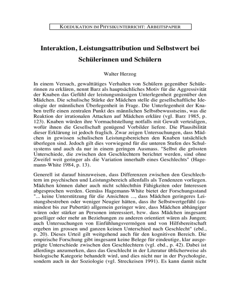 KOEDUKATION IM PHYSIKUNTERRICHT: ARBEITSPAPIER Interaktion, Leistungsattribution und Selbstwert bei Schülerinnen und Schülern Walter Herzog In einem Versuch, gewalttätiges Verhalten von Schülern gegenüber Schülerinnen zu erklären, nennt Barz als hauptsächliches Motiv für die Aggressivität der Knaben das Gefühl der leistungsmässigen Unterlegenheit gegenüber den Mädchen. Die schulische Stärke der Mädchen stelle die gesellschaftliche Ideologie der männlichen Überlegenheit in Frage. Die Unterlegenheit der Knaben treffe einen zentralen Punkt des männlichen Selbstbewusstseins, was die Reaktion der irrationalen Attacken auf Mädchen erkläre (vgl. Barz 1985, p. 123). Knaben würden ihre Vormachtstellung notfalls mit Gewalt verteidigen, wofür ihnen die Gesellschaft genügend Vorbilder liefere. Die Plausibilität dieser Erklärung ist jedoch fraglich. Zwar zeigen Untersuchungen, dass Mädchen in gewissen schulischen Leistungsbereichen den Knaben tatsächlich überlegen sind. Jedoch gilt dies vorwiegend für die unteren Stufen des Schulsystems und auch da nur in einem geringen Ausmass. "Selbst die grössten Unterschiede, die zwischen den Geschlechtern berichtet werden, sind ohne Zweifel weit geringer als die Variation innerhalb eines Geschlechts" (Hagemann-White 1984, p. 13). Generell ist darauf hinzuweisen, dass Differenzen zwischen den Geschlechtern im psychischen und Leistungsbereich allenfalls als Tendenzen vorliegen. Mädchen können daher auch nicht schlechthin Fähigkeiten oder Interessen abgesprochen werden. Gemäss Hagemann-White bietet der Forschungsstand "... keine Unterstützung für die Ansichten ..., dass Mädchen geringeres Leistungsbestreben oder weniger Neugier hätten, dass ihr Selbstwertgefühl (zumindest bis zur Pubertät) allgemein geringer wäre, dass Mädchen abhängiger wären oder stärker an Personen interessiert, bzw. dass Mädchen insgesamt geselliger oder mehr an Beziehungen zu anderen orientiert wären als Jungen; auch Untersuchungen von Einfühlungsvermögen und von Hilfsbereitschaft ergeben im grossen und ganzen keinen Unterschied nach Geschlecht" (ebd., p. 20). Dieses Urteil gilt weitgehend auch für den kognitiven Bereich. Die empirische Forschung gibt insgesamt keine Belege für eindeutige, klar ausgeprägte Unterschiede zwischen den Geschlechtern (vgl. ebd., p. 42). Dabei ist allerdings anzumerken, dass das Geschlecht in der Literatur üblicherweise als biologische Kategorie behandelt wird, und dies nicht nur in der Psychologie, sondern auch in der Soziologie (vgl. Streckeisen 1991). Es kann damit nicht KOEDUKATION IM PHYSIKUNTERRICHT: ARBEITSPAPIER ausgeschlossen werden, dass es sehr wohl Unterschiede im Erleben und Verhalten von weiblichen und männlichen Personen gibt (wobei "weiblich" und "männlich" nicht im biologischen Sinne gemeint wären). Wenigstens in der psychologischen Androgynie-Forschung wird dieser Ansatz verfolgt (vgl. Bierhoff-Alfermann 1989). Bei aller Zurückhaltung, die gegenüber Aussagen über geschlechtsdifferente psychische Merkmale geboten ist, zeigt die Forschungslage im Falle aggressiver Verhaltensweisen eine grosse Eindeutigkeit. Aggression ist bei männlichen Individuen aller Altersstufen stärker ausgeprägt als bei weiblichen (vgl. Degenhardt 1979, p. 27; Hagemann-White 1984, p. 18ff.; Maccoby & Jacklin 1974, p. 227ff.; Meyer-Bahlburg 1980). Der Sachverhalt als solcher ist allerdings noch keine Erklärung. Biologische Faktoren dürften eine Rolle spielen (vgl. Bischof-Köhler 1990; Meyer-Bahlburg 1980), genügen jedoch nicht, um die Unterschiede zwischen den Geschlechtern zu erfassen. Das gilt auch und gerade für Unterschiede im Selbstwerterleben. Die höhere Aggressionsbereitschaft von Knaben könnte von mittelbarer Bedeutung für das Selbstwerterleben der Mädchens sein, das in der Pubertät einen vergleichsweise defizitären Verlauf nimmt. Kann der Überlegenheitsanspruch der Knaben gegenüber den Mädchen nur beschränkt als Ursache für deren Gewaltbereitschaft bezeichnet werden, so schlägt er sich vielleicht im Selbstwerterleben der Mädchen nieder. Führt der männliche Weg der Selbstwerdung, der stärker als der weibliche auf Abgrenzung und Differenzierung beruht (vgl. Chodorow 1985), auf Kosten der Mädchen zum Ziel? Es muss auch bei dieser Frage offenbleiben, ob die Kausalbeziehungen dermassen einfach und linear verlaufen. Um die Frage einer Klärung zuzuführen, interessiert im folgenden insbesondere, inwiefern die Schule als Erziehungs- und Sozialisationsinstanz zu unterschiedlichem Selbstvertrauen bei Knaben und Mädchen beiträgt. Interaktion Wie amerikanische und englische Studien zeigen, werden Knaben von Lehrpersonen mehr beachtet und häufiger angesprochen; zudem haben sie mehr Kontakt mit diesen als mit Mädchen. Sie werden häufiger gelobt, aber auch mehr getadelt und verwarnt als Mädchen (vgl. Brophy 1985; Brophy & Good 1976, p. 21f.; Enders-Dragässer & Fuchs 1989, p. 24-34; Hagemann-White 1984, p. 64f.; Spender 1985, Kap. 4). Vergleichbare Ergebnisse zeigen auch Untersuchungen aus Deutschland (vgl. Brehmer 1991; Enders-Dragässer & Fuchs 1989; Frasch & Wagner 1982). Knaben werden häufiger aufgerufen, 2 KOEDUKATION IM PHYSIKUNTERRICHT: ARBEITSPAPIER wenn sie sich melden, und auch, wenn sie sich nicht melden. Sie werden öfter gelobt als Mädchen und häufiger wegen ihres Betragens und ihrer mangelnden Disziplin getadelt. Wiederum ist auch der Kontakt zwischen Lehrpersonen und Schülern häufiger als zwischen Lehrpersonen und Schülerinnen, und zwar beidseitig, sowohl im Falle von lehrerinitiierten wie im Falle von schülerinitiiertem Kontakt (bei Einzel- oder Gruppenarbeit). Geschlechtsspezifische Unterschiede auf Lehrerseite gibt es kaum, das heisst sowohl Lehrer wie Lehrerinnen zeigen das entsprechende Verhalten. Was erklärt die Tatsache, dass Mädchen von Lehrpersonen weniger Aufmerksamkeit, Zuwendung und Rückmeldung erhalten als Knaben? Lässt sich daraus schliessen, "... dass de