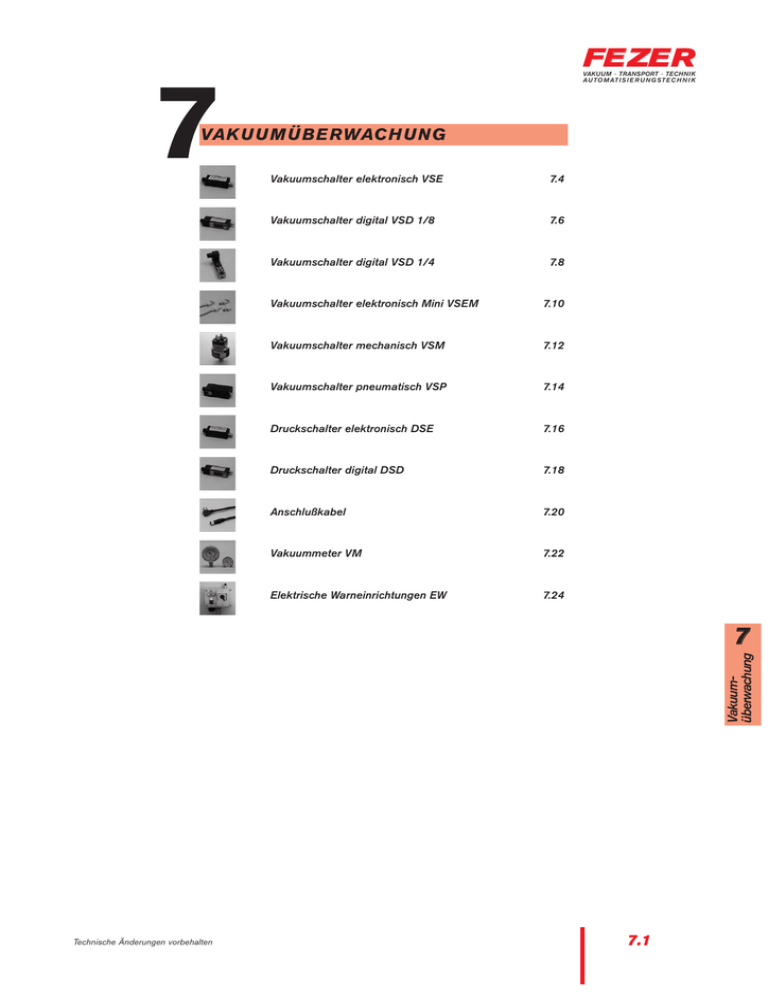 FE ZER VAKUUM · TRANSPORT · TECHNIK A U T O M AT I S I E R U N G ST E C H N I K 7 VAKUUMÜBERWACHUNG Vakuumschalter elektronisch VSE 7.4 Vakuumschalter digital VSD 1/8 7.6 Vakuumschalter digital VSD 1/4 7.8 Vakuumschalter elektronisch Mini VSEM 7.10 Vakuumschalter mechanisch VSM 7.12 Vakuumschalter pneumatisch VSP 7.14 Druckschalter elektronisch DSE 7.16 Druckschalter digital DSD 7.18 Anschlußkabel 7.20 Vakuummeter VM 7.22 Elektrische Warneinrichtungen EW 7.24 Vakuumüberwachung 7 Technische Änderungen vorbehalten 7.1 FE ZER ALLGEMEINE INFORMATIONEN VAKUUM · TRANSPORT · TECHNIK A U T O M AT I S I E R U N G ST E C H N I K Beschreibung Vakuumschalter werden zur Überwachung und Steuerung von Vakuumkreisen eingesetzt. Während Vakuummeter ausschließlich zur optischen Anzeige des anstehenden Betriebsvakuums dienen, können mit Vakuumschalter sowohl Kontroll- als auch Steuerungsfunktionen ausgeführt werden, wie z.B.: - Ansteuerung und Überwachung mehrere Vakuumkreise Vakuumabhängige Motorsteuerung von Vakuumpumpen Ansteuerung von Warn- und Überwachungseinrichtungen, etc. Bei den Vakuumschaltern wird zwischen folgenden Funktionsweisen unterschieden: Funktion und Arbeitsweise von Vakuum- und Druckschaltern Vakuumüberwachung 7 Kriterien: Einbaulage: Meßmedium: Meßbereiche: Meßanzeige: Überdrucksicherheit: Schaltung: Schaltausgänge: Zustandsanzeigen: Ansprechzeiten: Schalthäufigkeit: Hysterese: Wiederholgenauigkeit: Spannung: Strom: Temperaturbereiche: Schutzklassen: Funktionsweise: 7.2 bar bar 1/min V A °C mechanisch beliebig Luft, Öl, Benzin - 1 bis 1 --10 NO, NC analog über Anschlustecker < 20 ms 200 5 - 20 % +/- 5 % 250 5 -20 bis +100 IP 55 mechanische Membran mit einstellbaren Schaltpunkt elektronisch digital pneumatisch beliebig beliebig beliebig nicht aggressive Gase,ölfreie, trockene Luft -1 bis 10 -1 bis 10 - 0,75 bis 0,35 --digital --bis 16 bis 16 2 PNP, NPN PNP, NPN NO, NC analog, digital analog, digital pneumatisch über Diode über Diode --< 5 ms < 5 ms < 35 ms 200 200 30 2%, einstellbar 2%, einstellbar 10 % +/- 1 % +/- 1 % +/- 3 % 18 - 32 18 -32 --< 0,05 < 0,05 --- 10 bis + 60 - 10 bis + 60 0 bis 80 IP 65 IP 65 --Piezo-QuarzPiezo-Quarz mechanische Technik mit Technik mit Membran mit einstellbaren programmierbaren einstellbaren Schaltpunkt Schaltpunkten Schaltpunkt Technische Änderungen vorbehalten FE ZER KENNZEICHNUNG DER VAKUUMSCHALTER VAKUUM · TRANSPORT · TECHNIK A U T O M AT I S I E R U N G ST E C H N I K VS(E) - 1/4 - 3PNP - M8 Kabelanschluß: AK PS M8 SK Anschlußkabel fest angebaut Anschluß für Pneumatikschlauch Anschlußgewinde M8 für separates Kabel separates Kabel für direkten Anschluß an Stecker Schaltausgang: A PNP NPN NO NC ... % analoger Schaltausgang Schaltzustand gegen + Schaltzustand gegen normal open (Schaltruhezustand offen) normal closed (Schaltruhezustang geschlossen) Schaltpunkt in %-Vakuum (z.B. 60%) Vakuumanschluß: AF AS 1/8 1/8 1/4 1/4 A I A I Anschlußflansch Anschlußstutzen Anschlußgewinde Anschlußgewinde Anschlußgewinde Anschlußgewinde R R R R 1/8”, 1/8”, 1/4”, 1/4”, Außengewinde Innengewinde Außengewinde Innengewinde Bauform, Funktionsweise: mechanisch pneumatisch elektronisch digital ...M ...K Miniaturausführung Kubische Ausführung Schaltertyp: VS DS Technische Änderungen vorbehalten Vakuumschalter Druckschalter 7 Druckbereich (bar) -1 bis 1 0 bis 10 7.3 Vakuumüberwachung M P E D FE ZER VAKUUMSCHALTER ELEKTRONISCH VSE VAKUUM · TRANSPORT · TECHNIK A U T O M AT I S I E R U N G ST E C H N I K Beschreibung Exakter und robuster elektronischer Vakuumschalter mit Piezo-Quarz-Technik. Elektronische Vakuumschalter werden zur Steuerung und Regelung von Vakuum-Schaltkreisen eingesetzt. Durch die stufenlose Einstellmöglichkeit von Schaltpunkt und Hysterese über Potentiometer, können sehr exakte Werte vorgegeben, und somit Zyklus- und Taktzeiten optimiert werden. Die Vakuumschalter werden mit allen erforderlichen Zubehörteilen (Entlüftungsnippel, Schrauben und O-Ringen) geliefert. Bei Flanschausführung ist ein Befestigungswinkel mit Schrauben im Lieferumfang enthalten. VSE-AF4PNP-M8 Befestigungsset Vakuumschalter, elektronisch VSE-R1/8-4PNP-M8 Artikelnummern Typ Art.-Nr: VSE-AF-4PNP-M8 VSE-AF-4NPN-M8 VSE-1/8-4PNP-M8 VSE-1/8-4NPN-M8 1.52.3.0010 1.52.3.0009 1.52.3.0012 1.52.3.0011 Schaltsymbol Vakuumschalter Technische Daten Typ Einbaulage Meßmedium Meßbereich Überdrucksicherheit Spannung zul. Spannunsspitze Eigenstromaufnahme Schaltausgang Vakuumüberwachung 7 Schaltung Analogausgang Elektrischer Anschluß Zustandsanzeige Ansprechzeit Wiederholgenauigkeit Hystereseeinstellung H zul. Luftfeuchtigkeit Schutzart Temperaturbereich °C Gewicht 7.4 VSE-AF-... VSE-1/8-... beliebig trockene, ölfreie Luft, nicht aggressive Gase - 1 bis 0 bar 5 bar 10,8 bis 30 (V) DC 400 VP, 1µs < 20 mA Ruhestellung offen (N.O.) beliebig trockene, ölfreie Luft, nicht aggressive Gase - 1 bis 0 bar 5 bar 10,8 bis 30 (V) DC 400 VP, 1µs < 20 mA Ruhestellung offen (N.O.) max. 125mA, 30V PNP / NPN 1 bis 5V DC +/-0,04 4-pin M 8 Steckanschluß LED im Steckanschluß < 5 ms ± 1% 3 bis 20% bei -0,3 bis -1bar 35 bis 85 % RH max. 125mA, 30V PNP / NPN 1 bis 5V DC +/-0,04 4-pin M 8 Steckanschluß LED im Steckanschluß < 5 ms ± 1% 3 bis 20% bei -0,3 bis -1bar 35 bis 85 % RH IP 65 (ohne Entlüftungsschl. IP 40) 0 bis + 50 °C 43 g IP 65 (ohne Entlüftungsschl. IP40) 0 bis + 50 °C 30 g Technische Änderungen vorbehalten FE ZER VAKUUMSCHALTER ELEKTRONISCH VSE VAKUUM · TRANSPORT · TECHNIK A U T O M AT I S I E R U N G ST E C H N I K Anschlußmaße Vakuumschalter AF Vakuumschalter mit Anschlußgewinde R1/8“ Befestigungswinkel für Unterdruckschalter mit Flanschausführung (AF) Schaltplan PNP, 4-PIN Belegung Schaltplan NPN, 4-PIN Belegung Steckanschluß 4 pin Steckanschluß 4 pin Übersicht für passende Kabelanschlüße Typ (EN 50044) Verbindung Abgang Polzahl Länge Werkstoff Art.-Nr AK-M8-4P-2M PVC AK-M8-4P-5M-PUR steckbar steckbar gerade gera